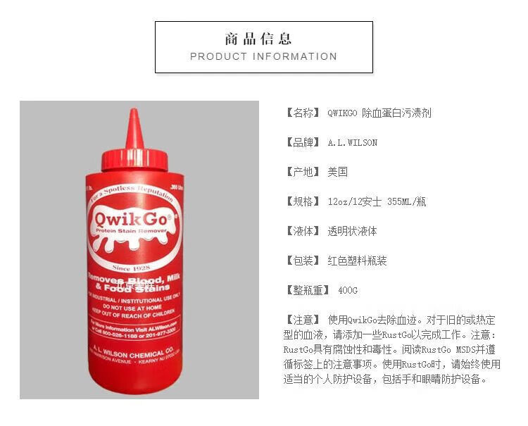 QWIKGO GO Series Blood Protein Stain Remover Cleaning Dry Cleaning Agent WILSON 355mlA1