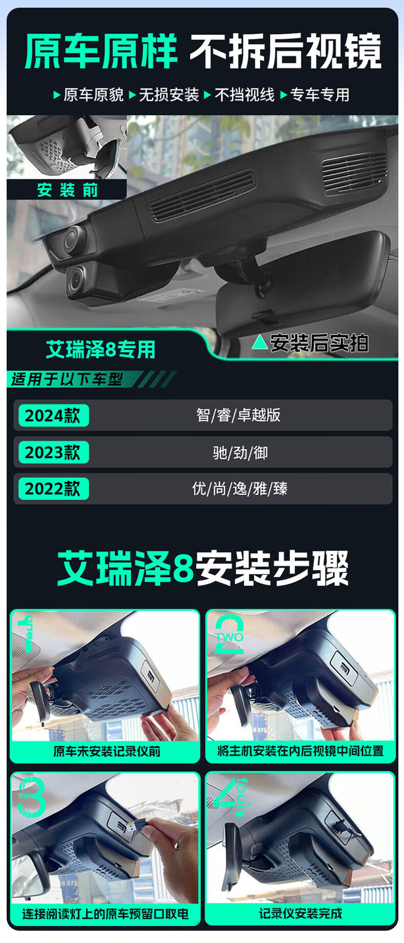 Jinyuzi Chery Arrizo 8pro driving recorder high-definition wire-free original factory front and rear dual recording car-specific rearview mirror 25/24 models 1.6T DCT smart Arrizo 8 ultra-clear single lens 2160P+64G