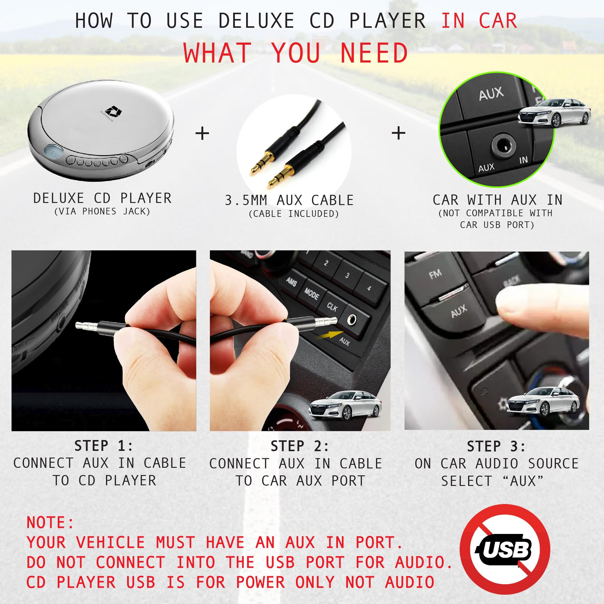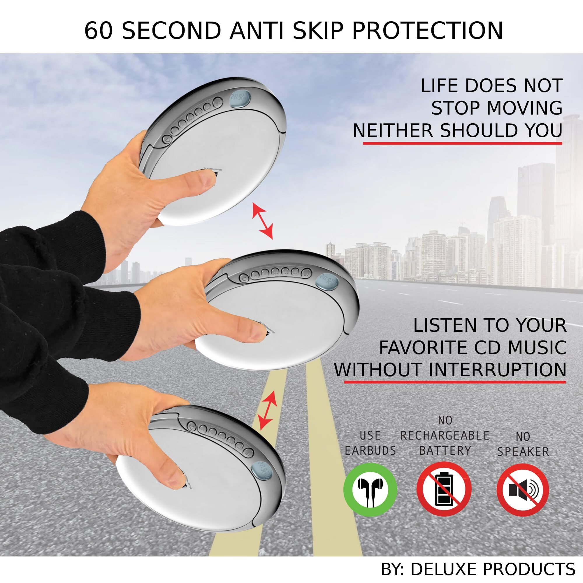 Deluxe Products Deluxe Portable CD Player 60 Seconds Anti-Bounce CD/CD-R/CD-RW Headphones/AUX Home Car DP-PCD-001-SIL Silver Silver