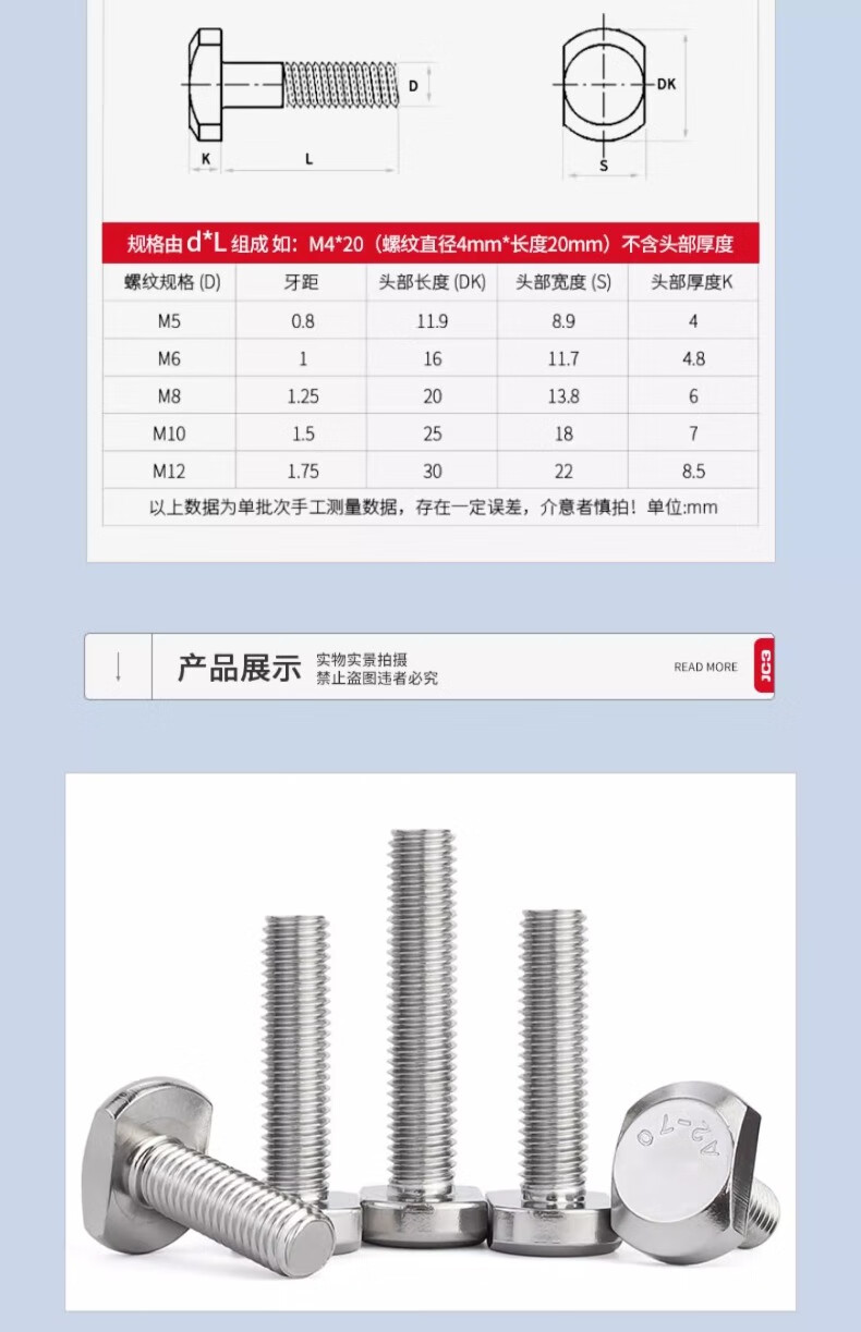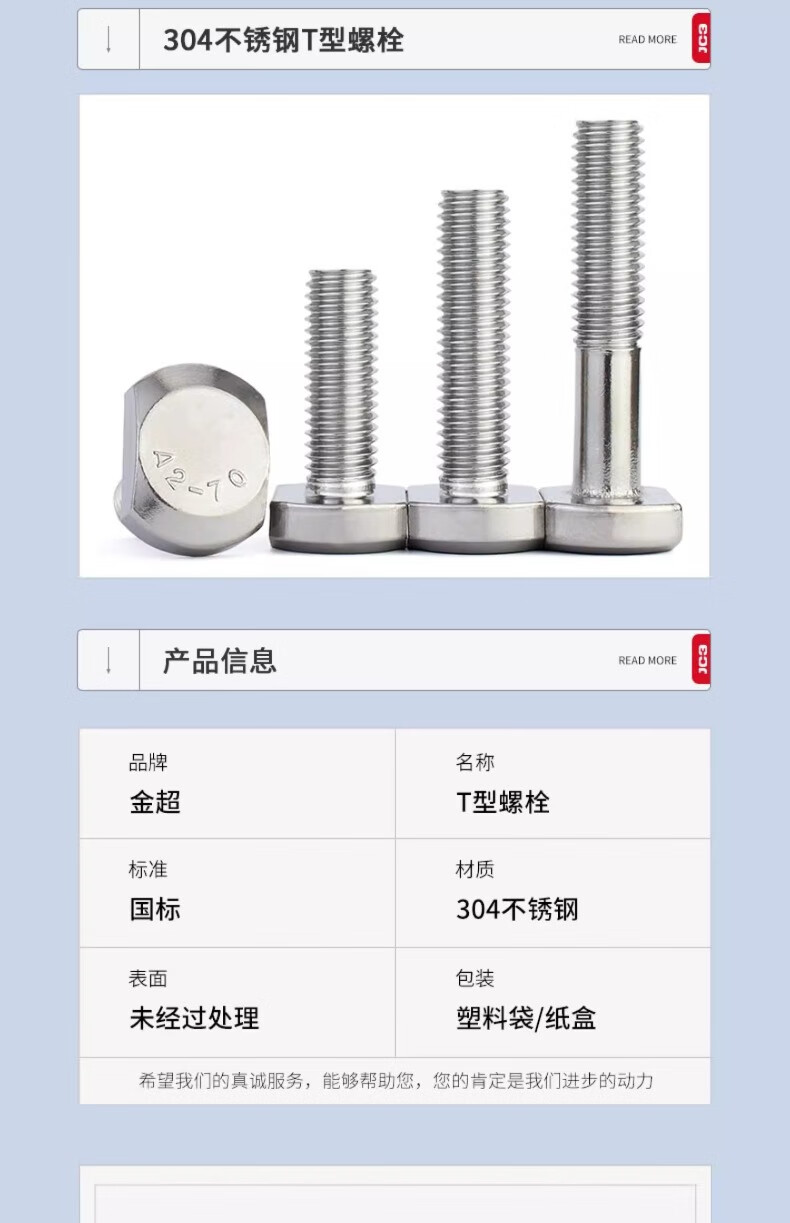 Jinchao 304 stainless steel bolt T-shaped screw slot bolt T-shaped pressure plate screw M6M8M10M12M16M20 M12*60 (1 piece)