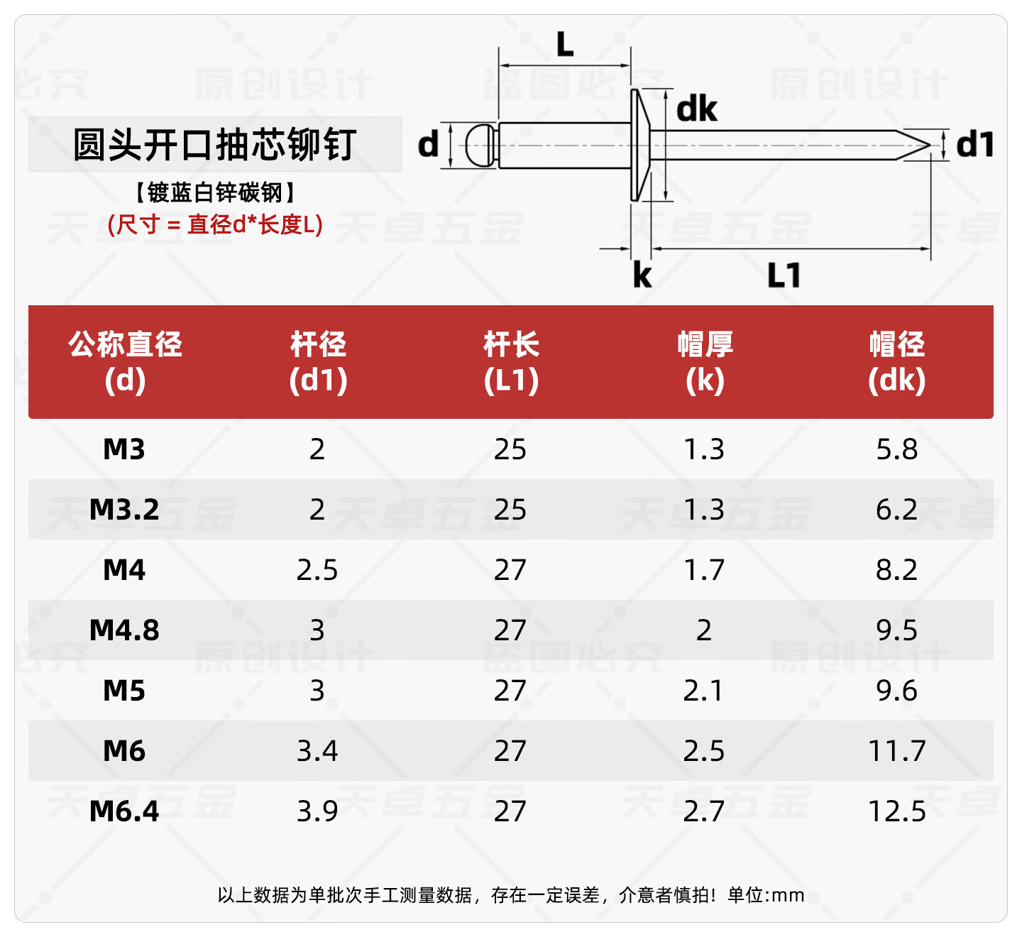 Tianzhuo Hardware national standard round head open core blind rivets all aluminum/304 stainless steel/carbon steel galvanized rivets 304 3.2*13 20 pcs