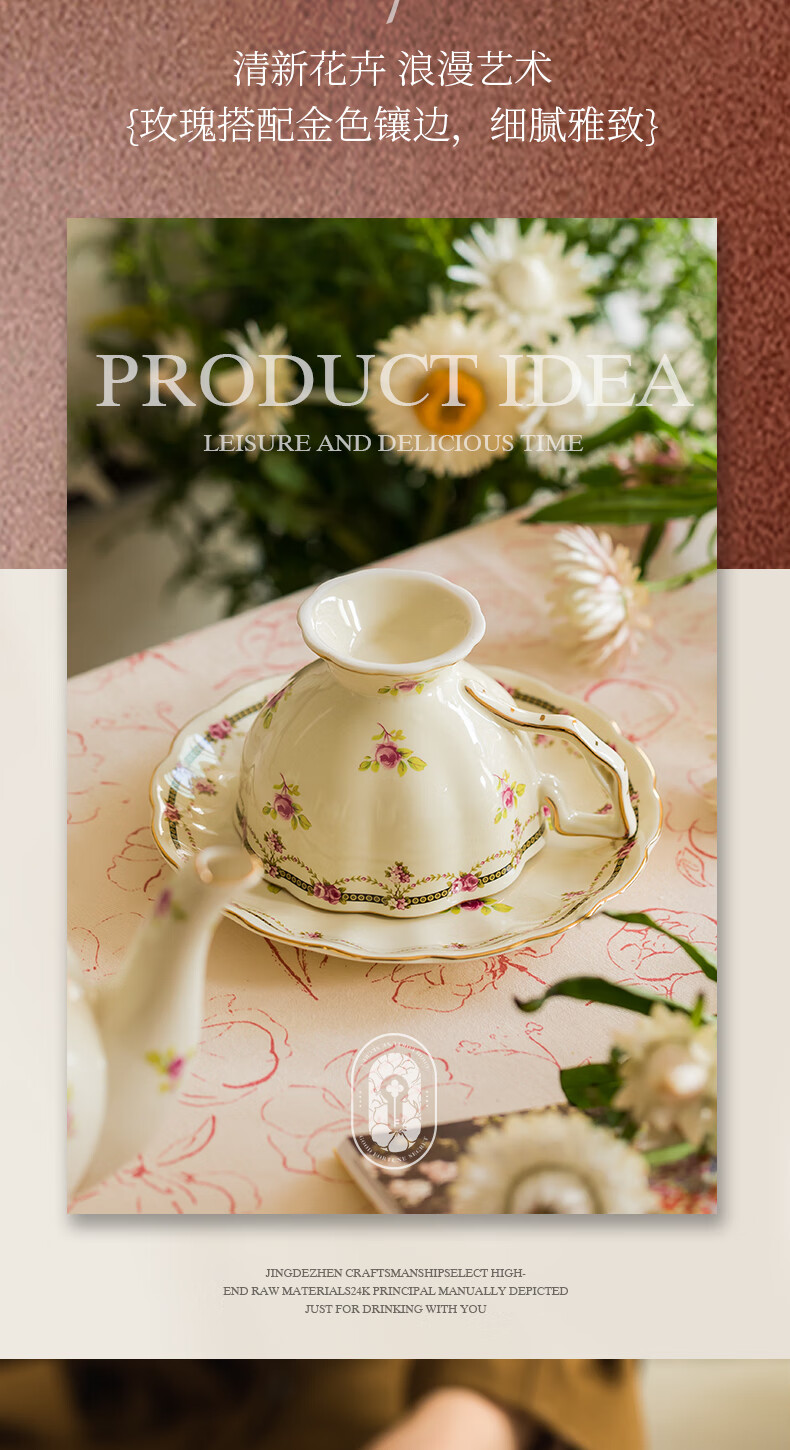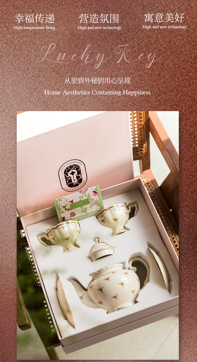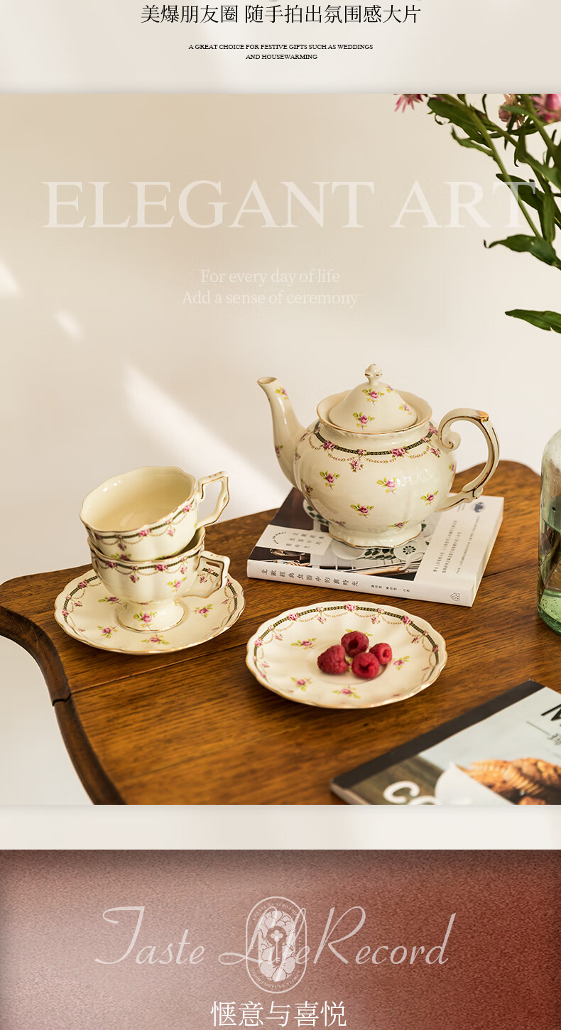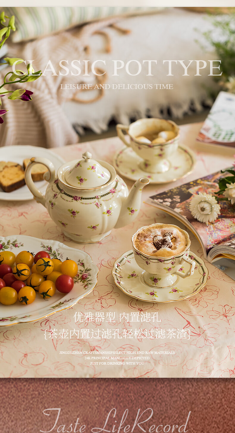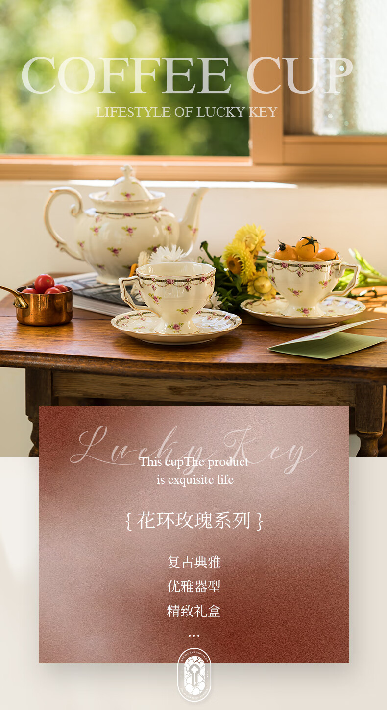 Lucky Key Garland Rose Ceramic Coffee Cup and Saucer Set High-end Afternoon Tea Set Cup Gift Box Housewarming and Wedding Gift Garland Rose-1 Pot 2 Cups and Saucers-Romantic Pink Gift Box