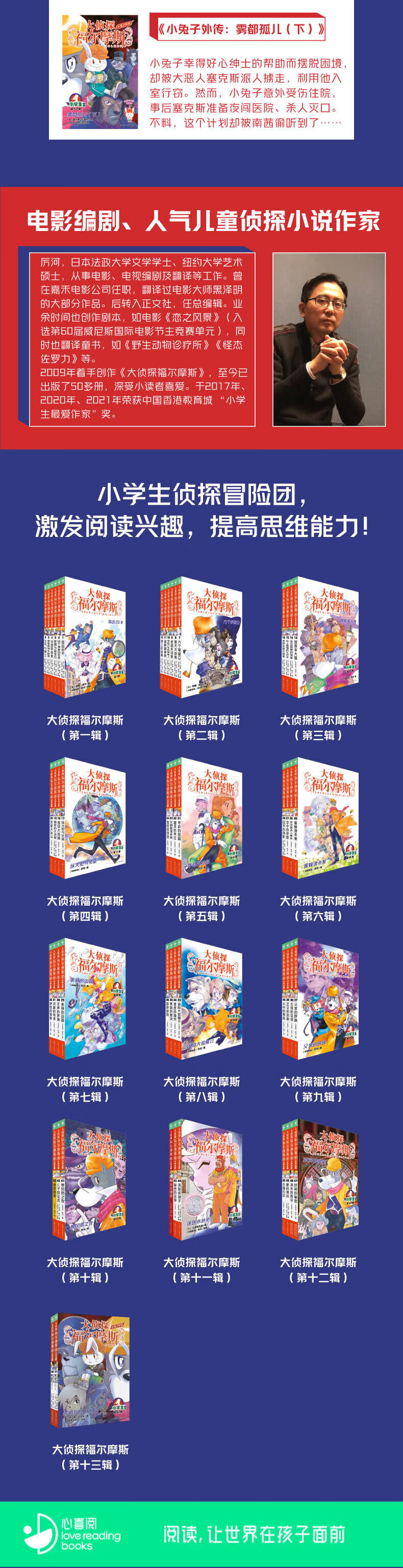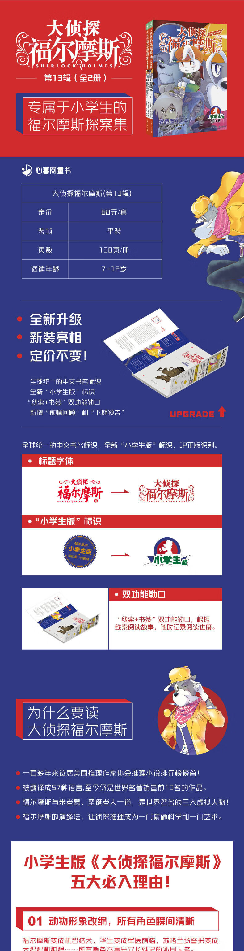这是一套专属于小学生的福尔摩斯探案集,现已出版了13辑,新版封面全新升级。全球销量超过1000万册!电影名编剧创意改编,电影语言推进故事,一改原著厚重;卡通形象表现人物,角色瞬间清晰;逻辑推理分析解密,每个细节都暗藏玄机;惊险故事不乏温情,在震撼中收获前进的动力。