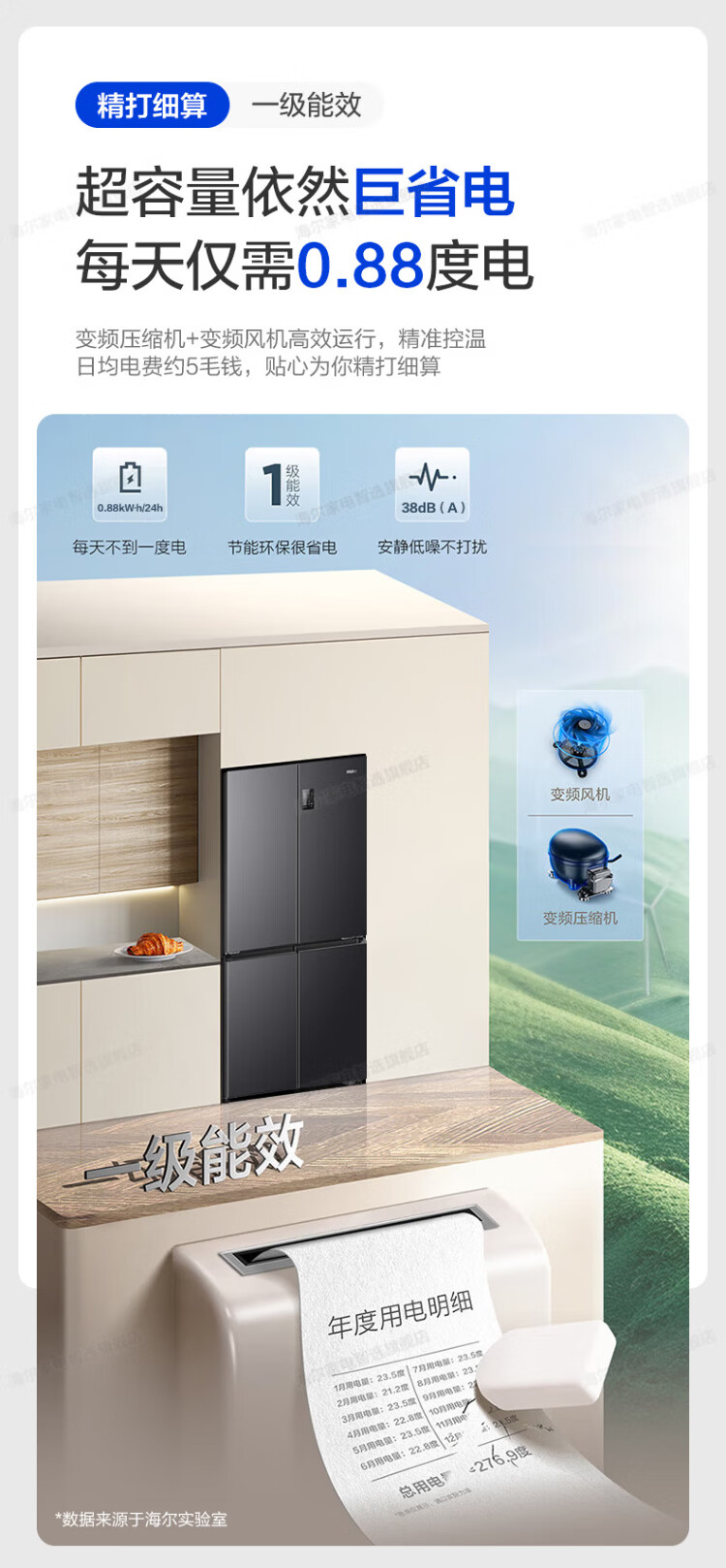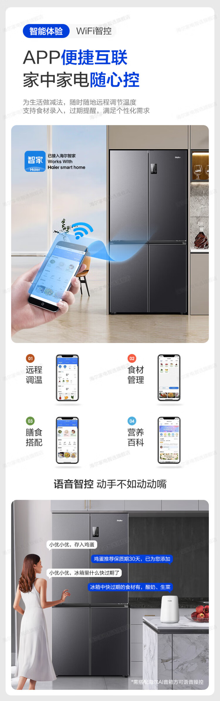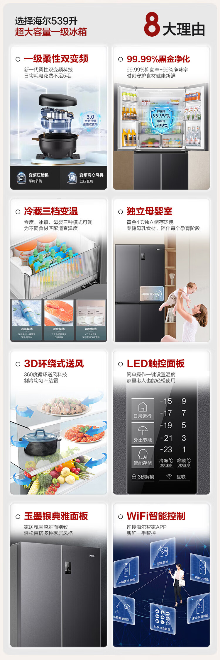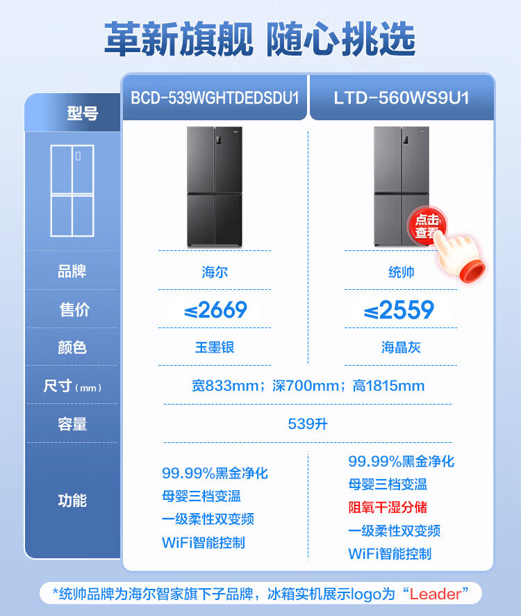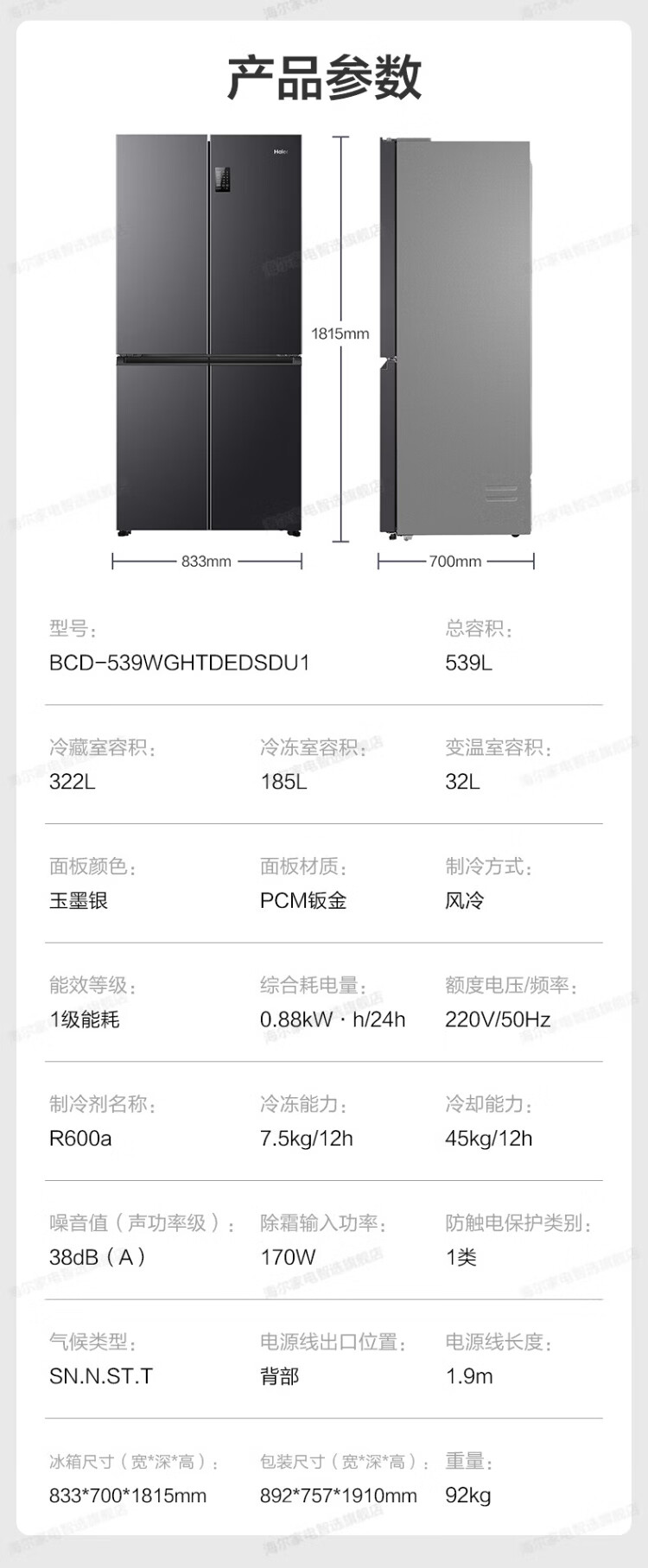 Haier refrigerator four-door cross-door double-door 539 upgraded to first-level energy efficiency dual frequency conversion dual cycle ultra-thin large capacity can be embedded in air-cooled frost-free household appliances state subsidy 539L+healthy black gold purification+networked intelligent control+jade ink silver hot selling hot model
