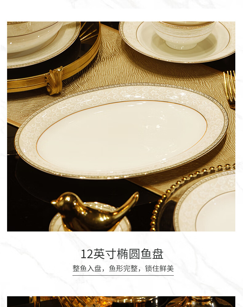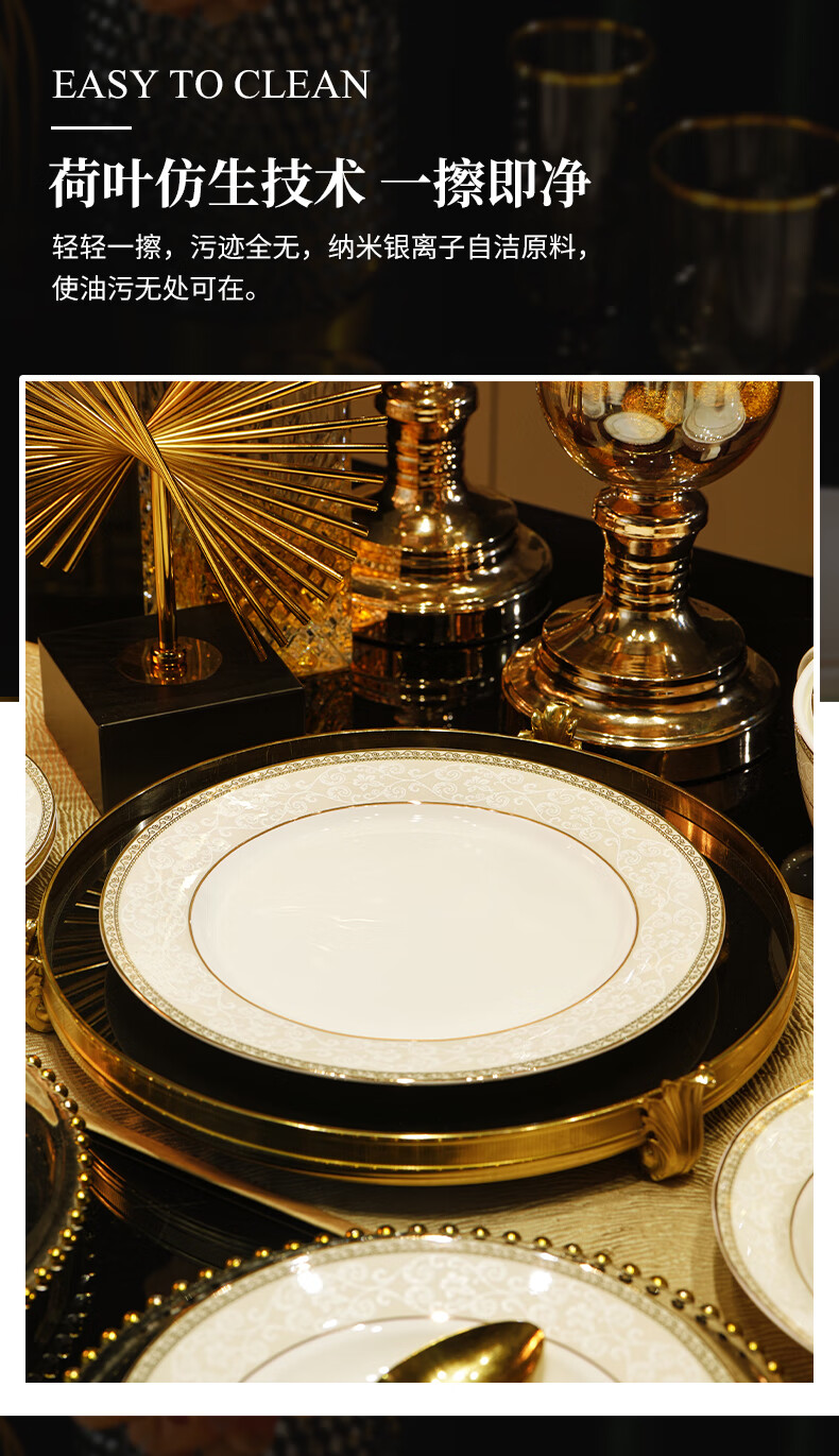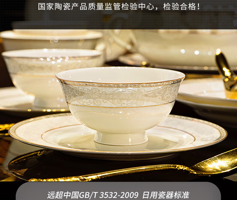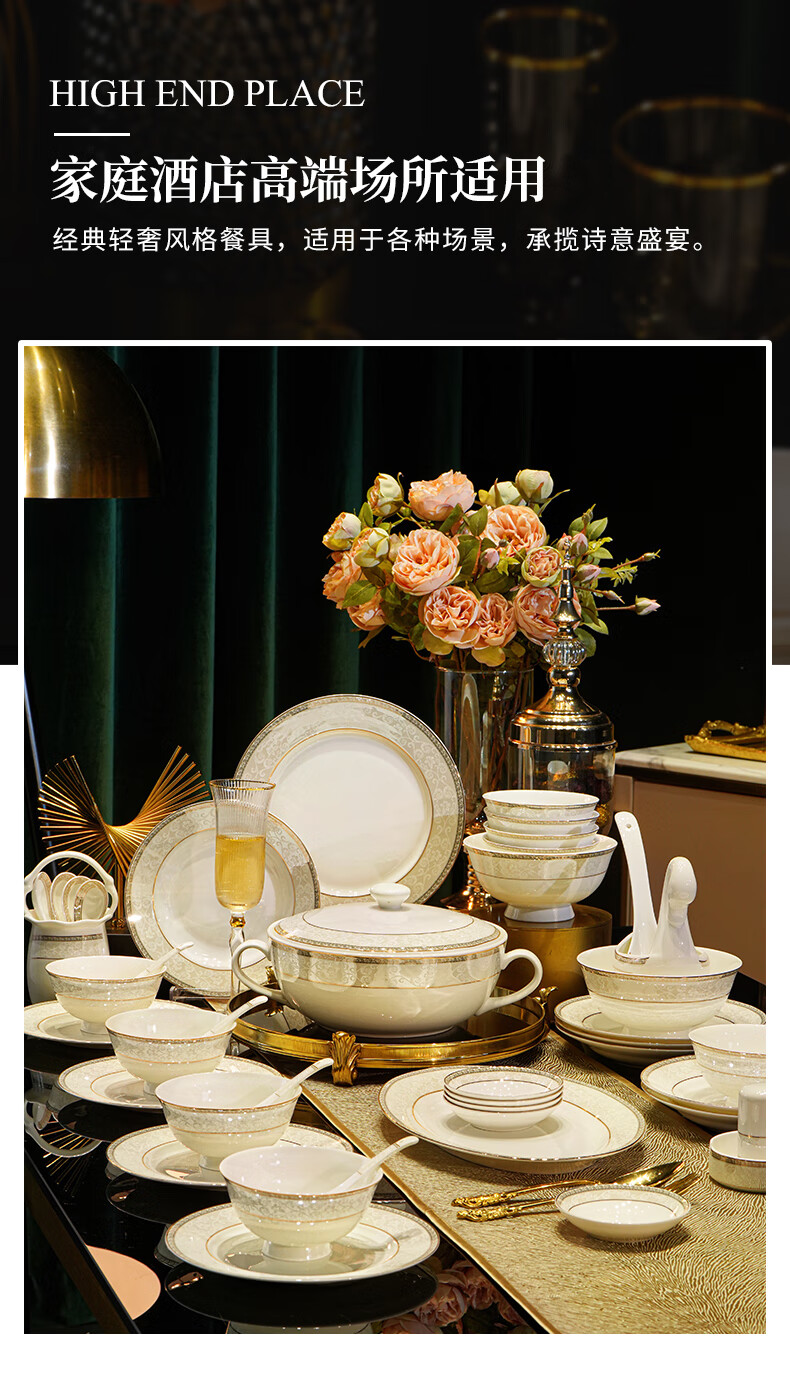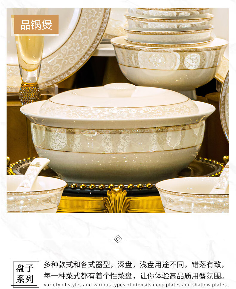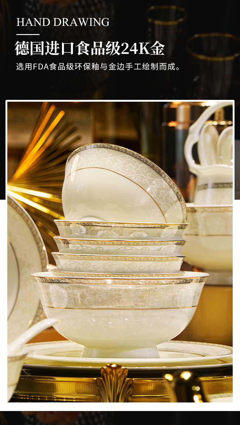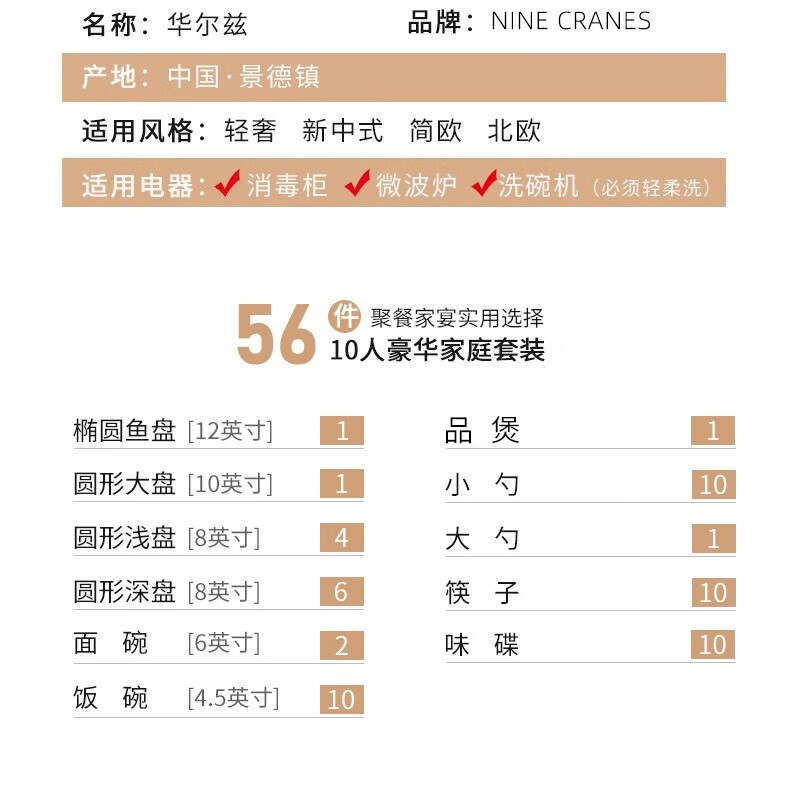 NINE CRANES Jingdezhen tableware set, housewarming gift, ceramic bowl and plate set, household light luxury porcelain bowl and plate set, suitable for microwave oven, 10-person accessory pot, 56-piece set