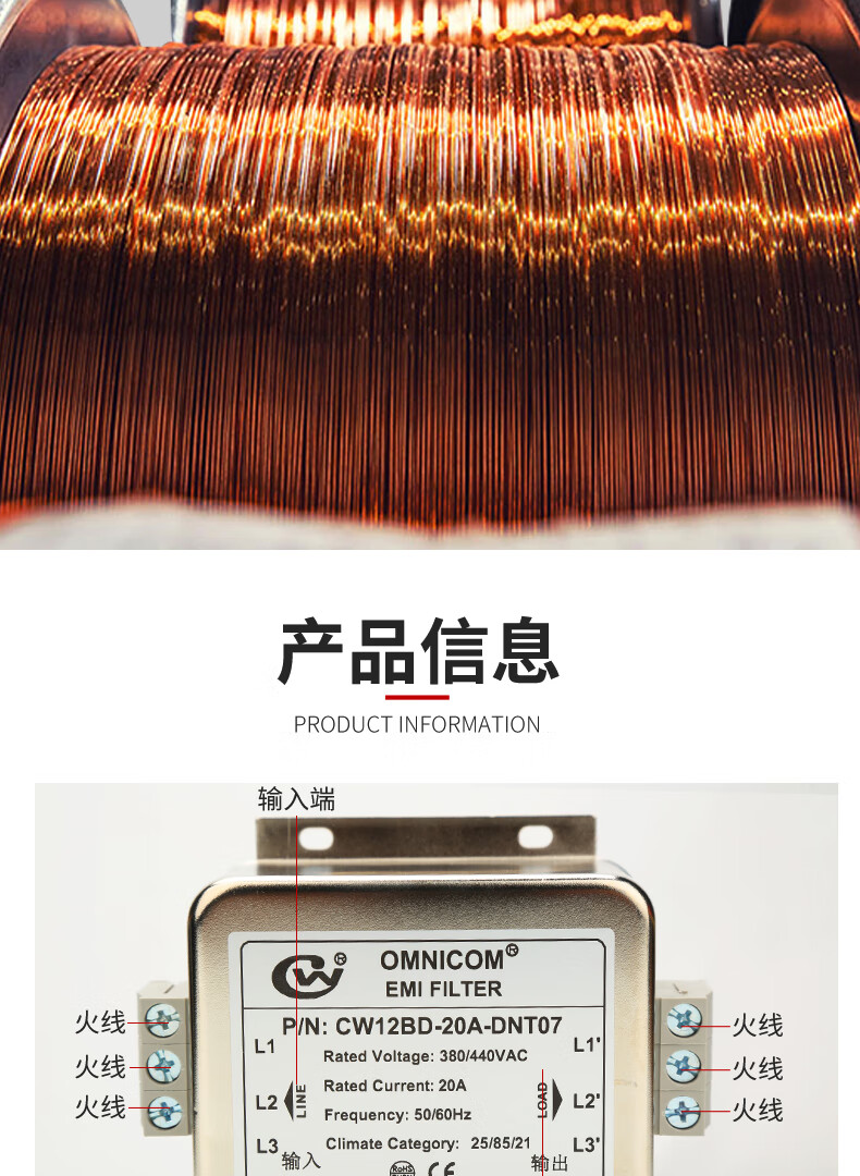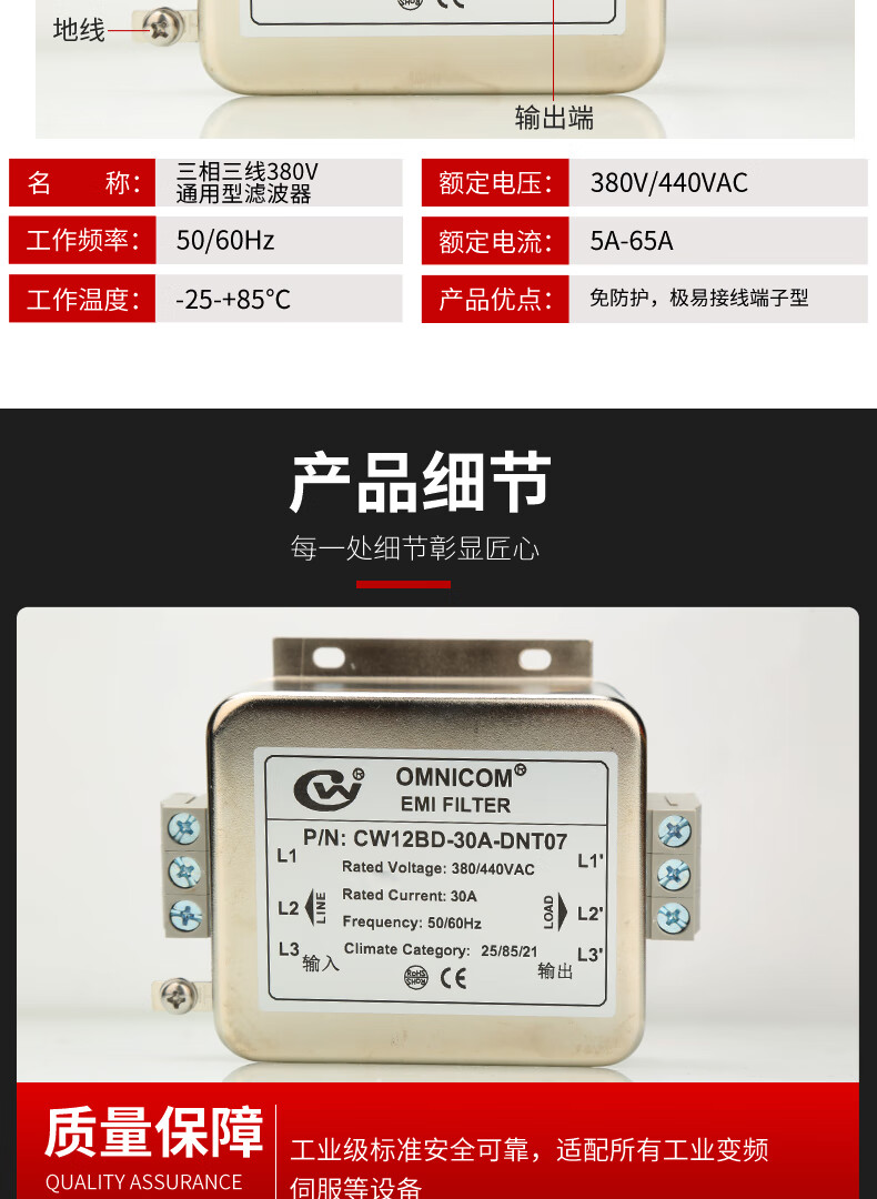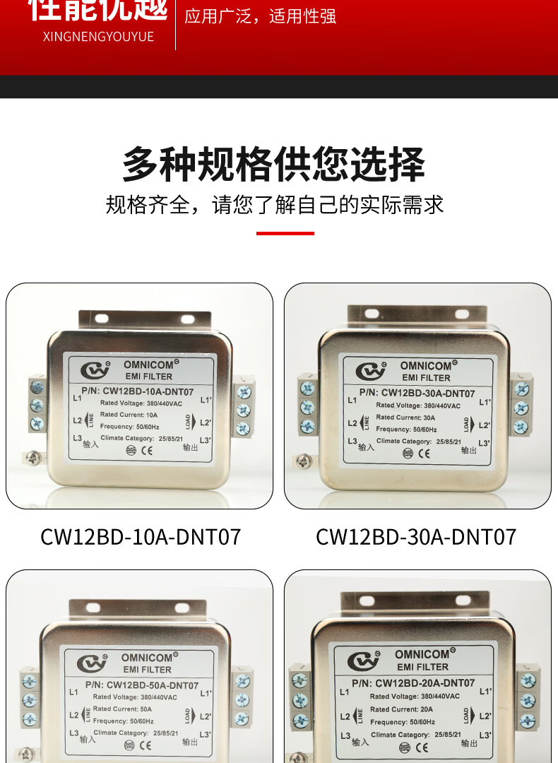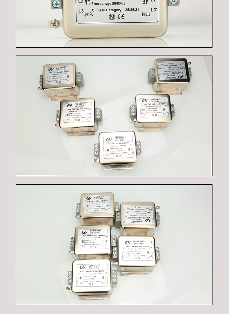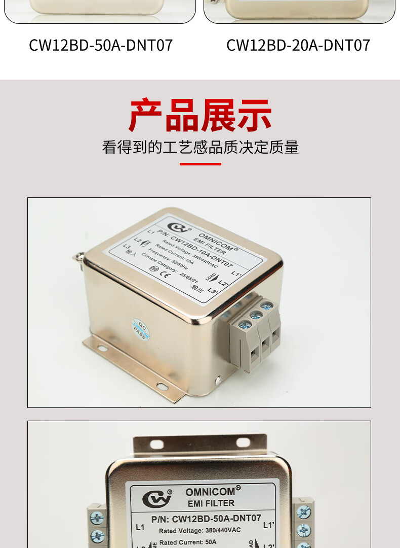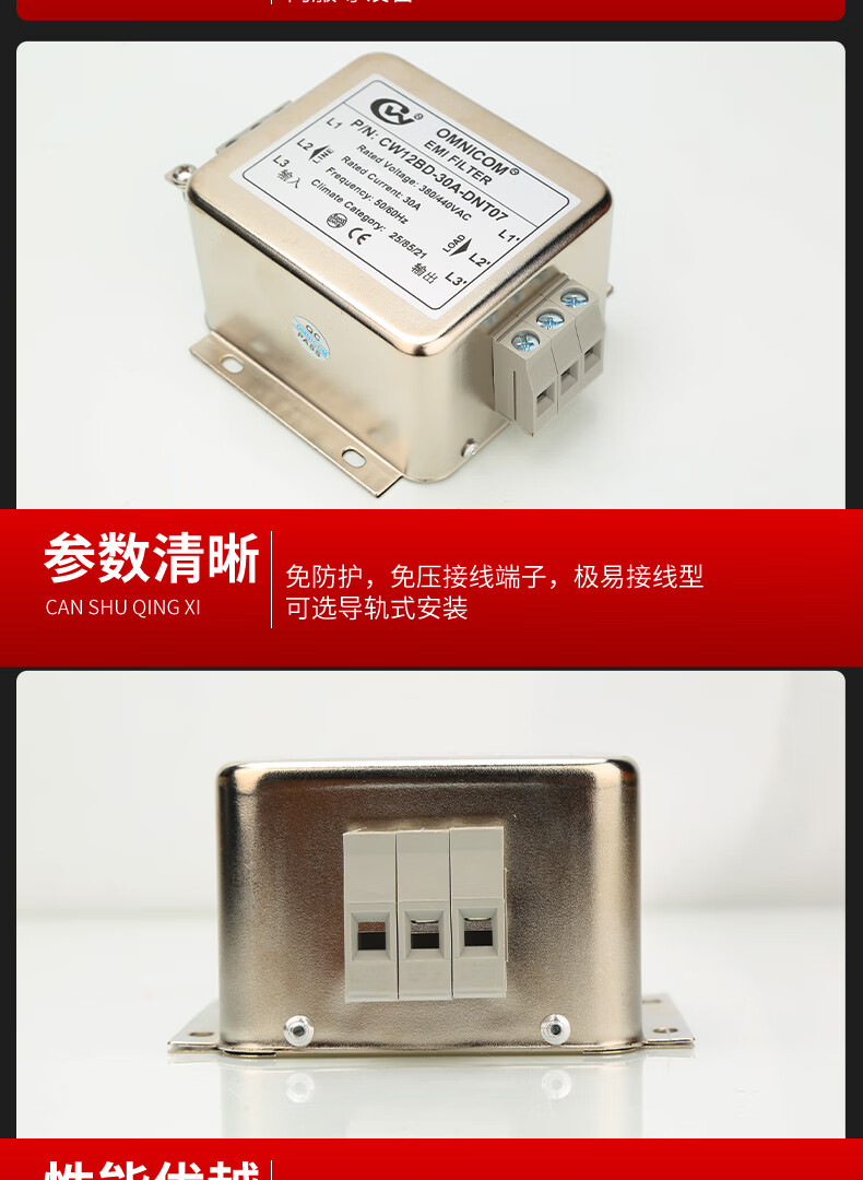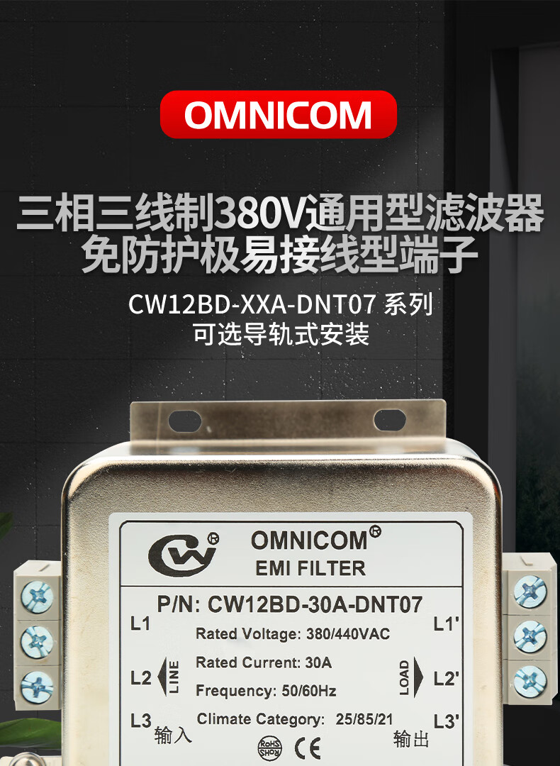 Taiwan omnicom three-phase 380V power filter terminal rail installation anti-interference filter CW12BD-30A-DNT07 30A flat installation three-phase three-level easy wiring terminal