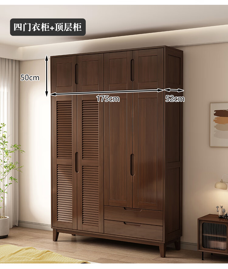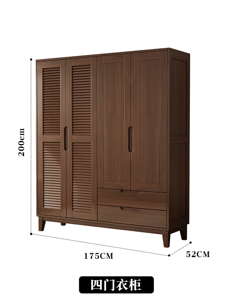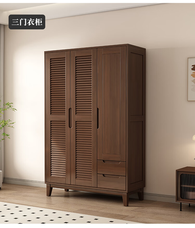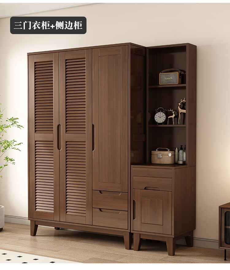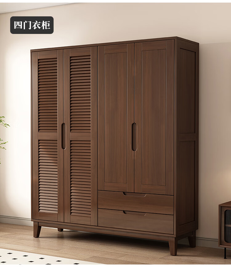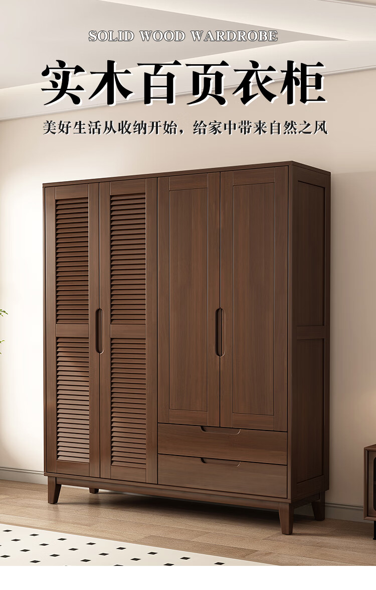 Siguyuan Nordic all solid wood wardrobe hundred-page grille can add top cabinets home bedroom simple two or three doors with drawer storage wardrobe walnut color all solid wood four door wardrobe delivery to home package installation