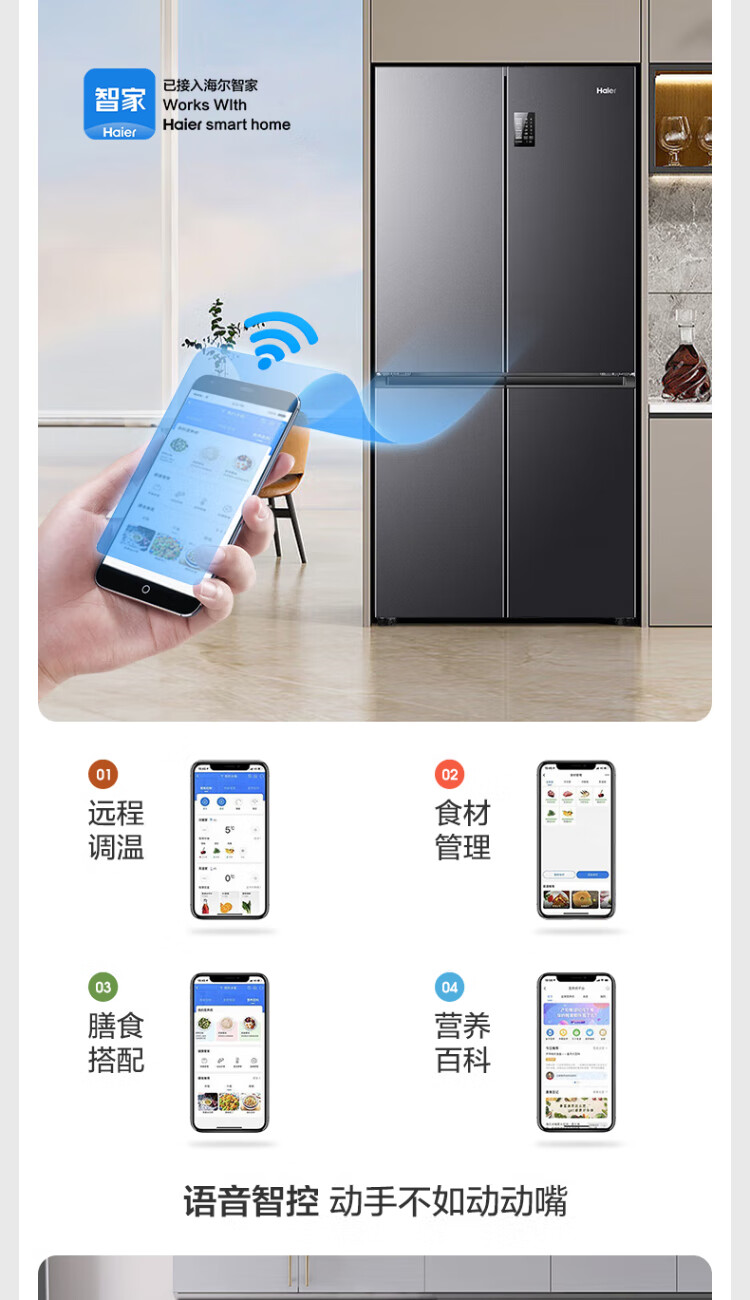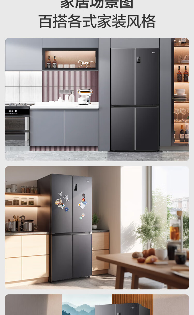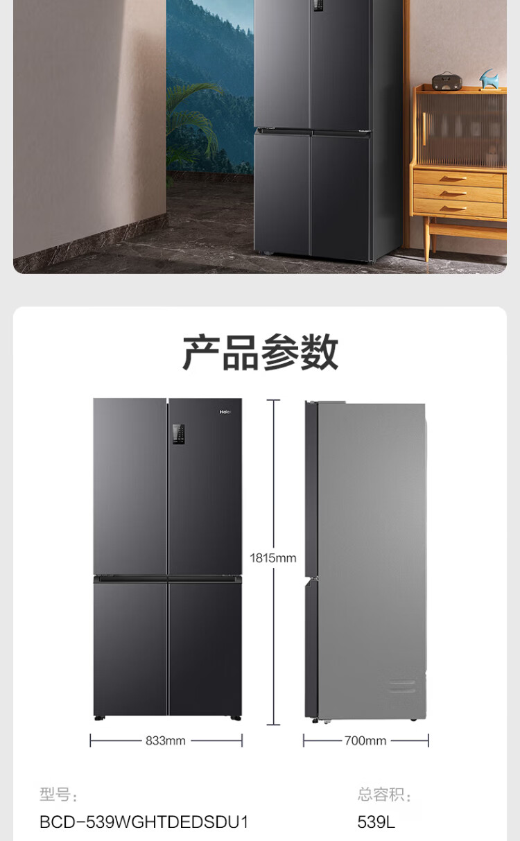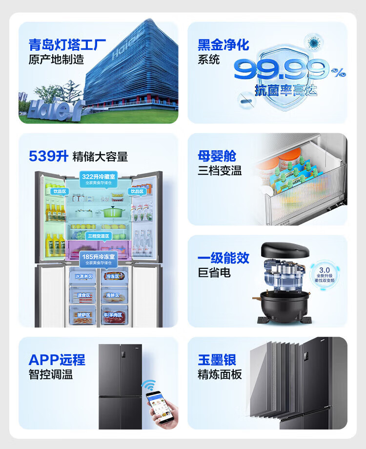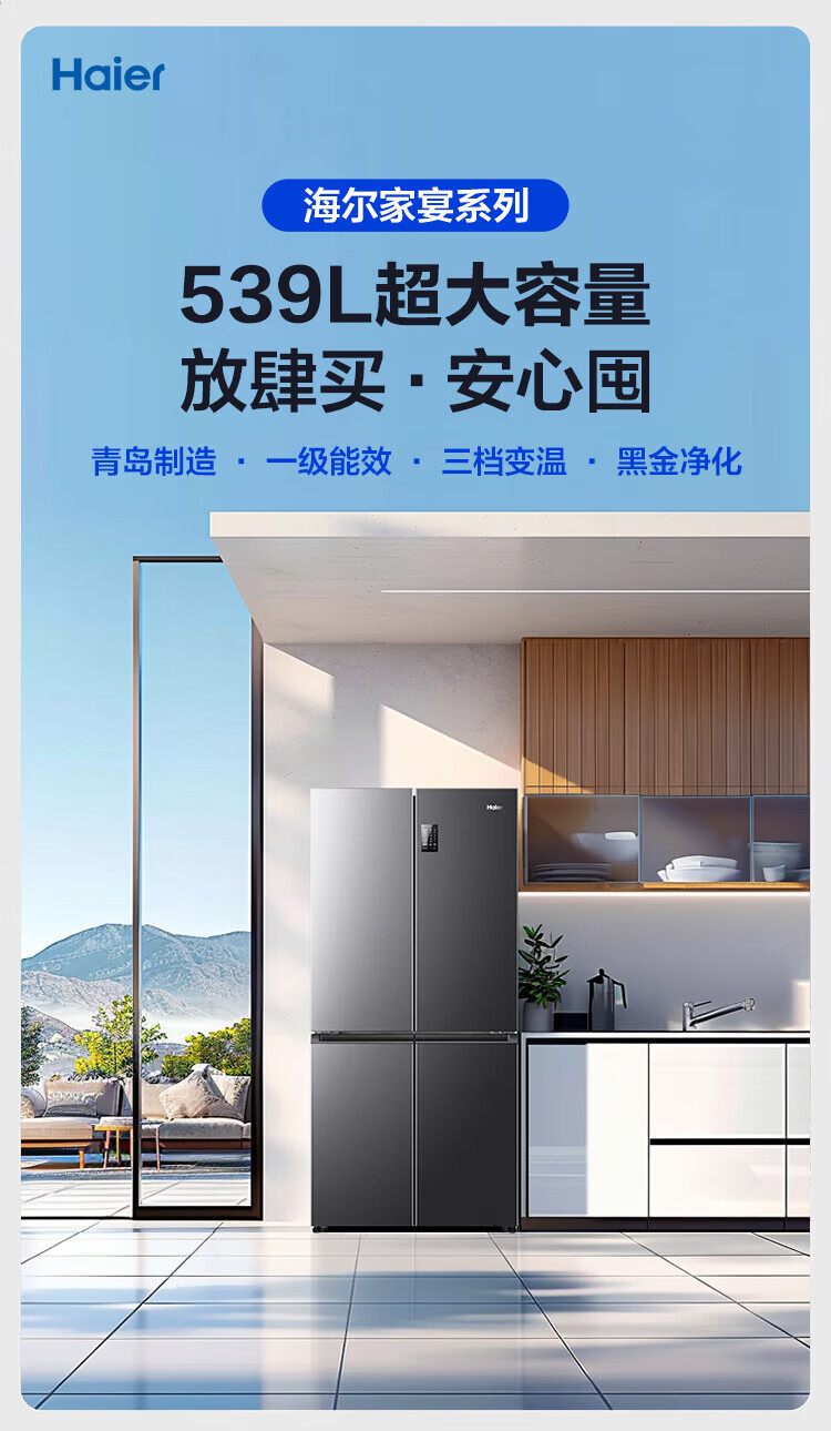 Haier refrigerator 539 liters family banquet series four-door cross-door multi-door first-level dual-frequency double-cycle air-cooled frost-free large-capacity smart home refrigerator with national subsidy 539-liter jade ink silver + first-level dual frequency conversion + black gold purification + third-speed variable temperature zone