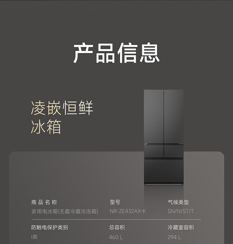 Panasonic 460L 580CM ultra-thin thickness fully embedded zero-embedded first-class energy efficiency air-cooled frost-free multi-door refrigerator with automatic ice making NR-ZE432AX-K