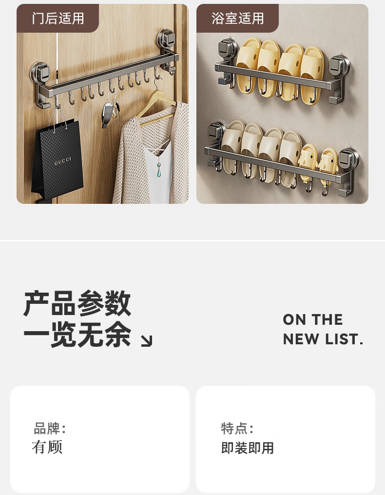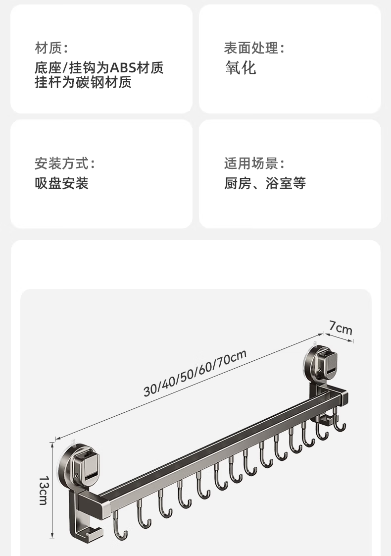 There are suction cup kitchen hooks, no punching, kitchen storage racks, wall-mounted spatulas, lids, spoons, multi-functional storage racks, double poles 60CM with 12 hooks, strong suction cups