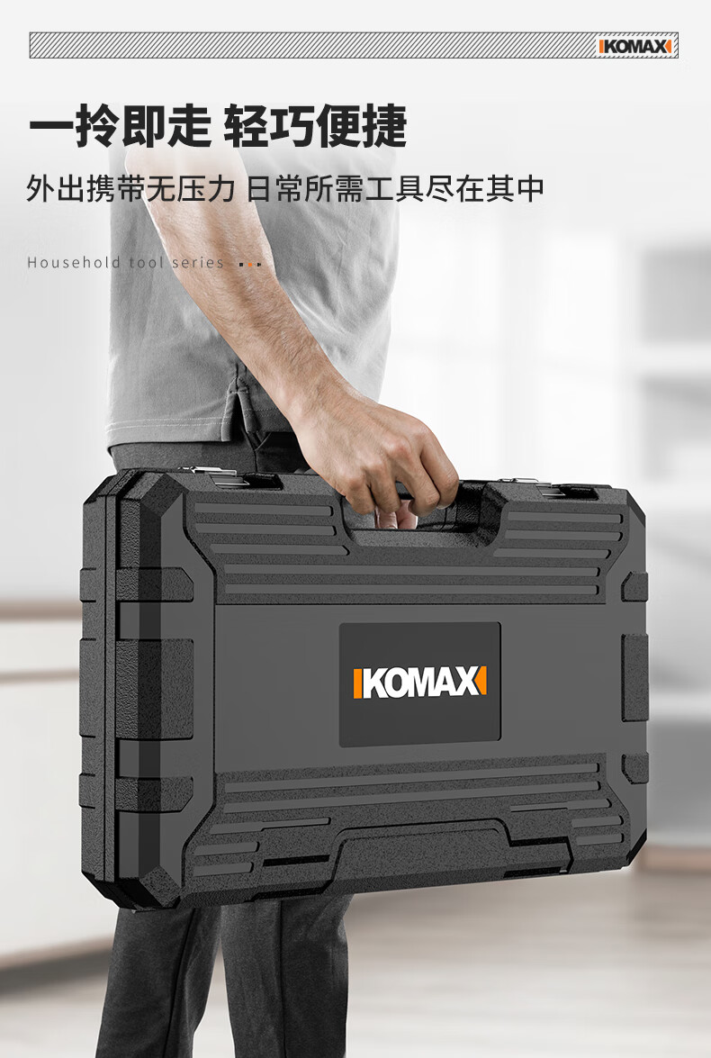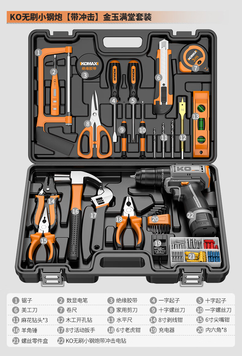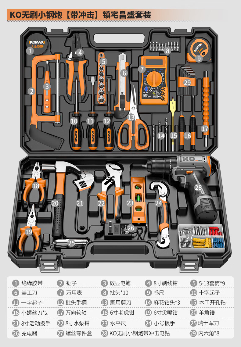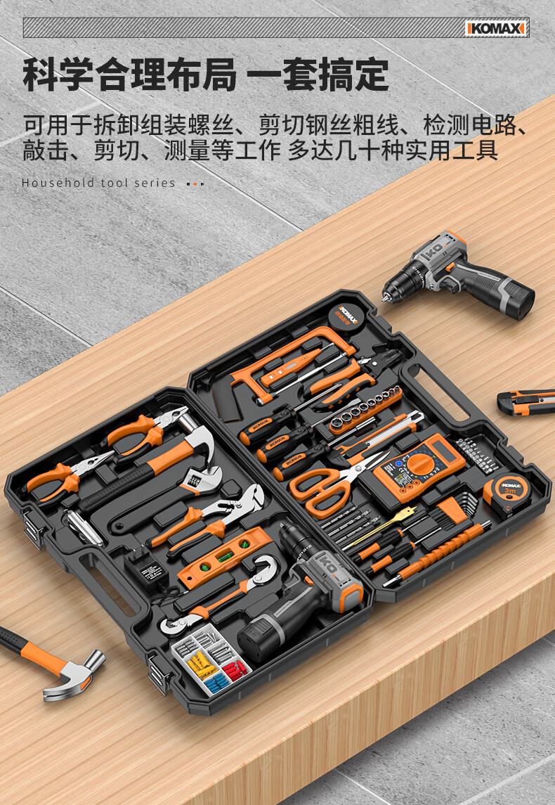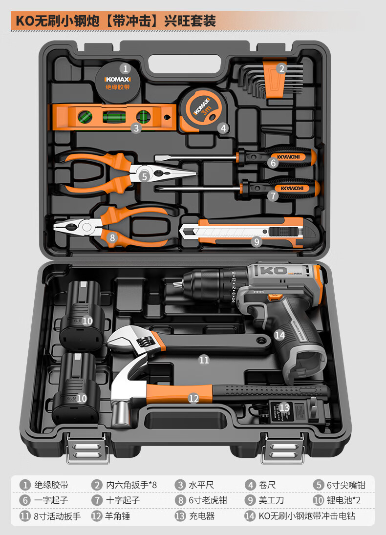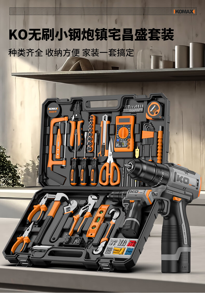 KOMAX household electric drill tool set multi-function electric drill tool box complete electrician woodworking vehicle repair screwdriver KO brushless with impact 1 battery/town house prosperous