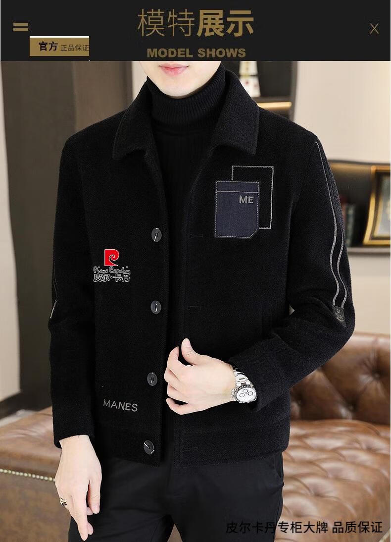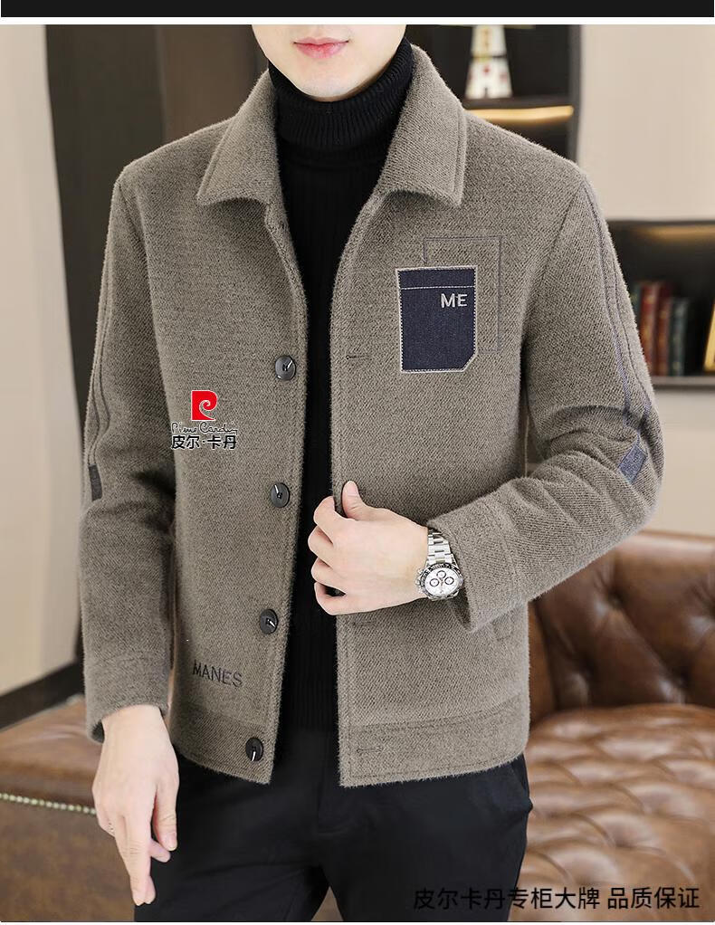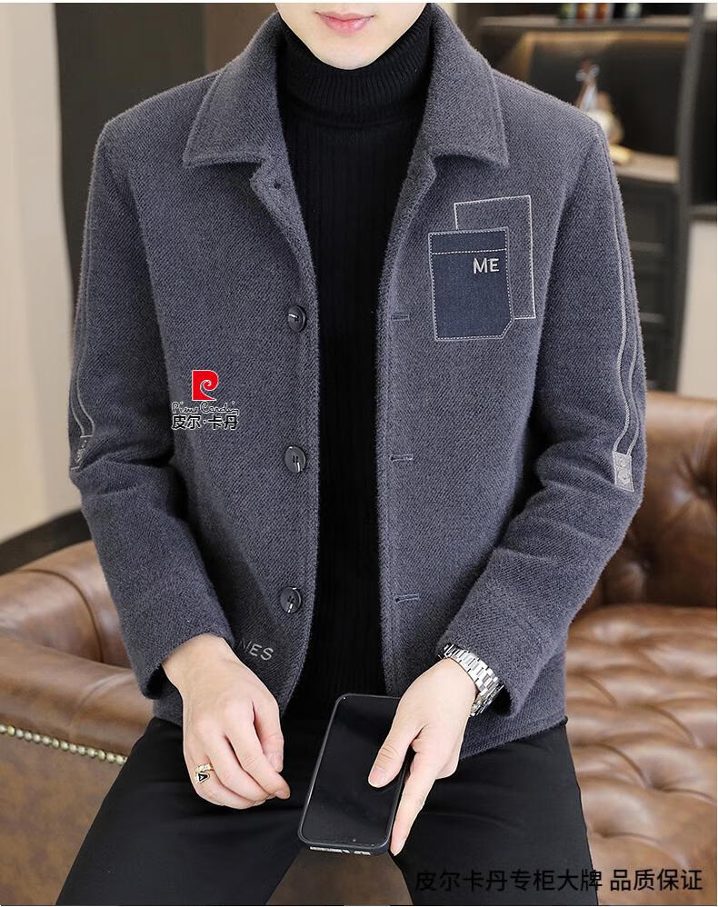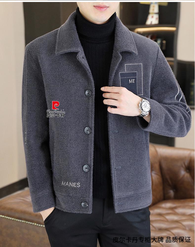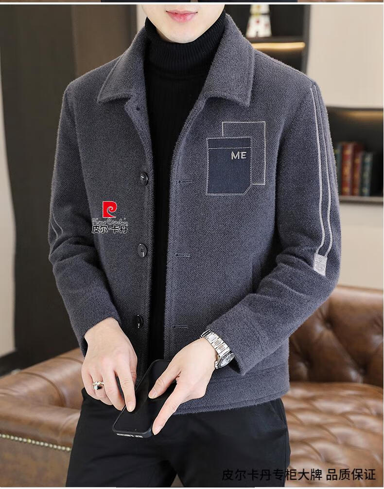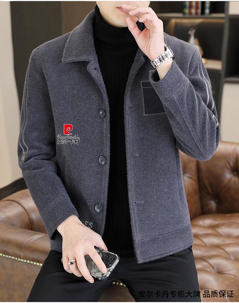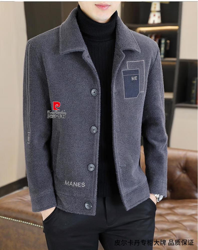 Pierre Cardin Men's Gold Mink Woolen Jacket Autumn and Winter New Woolen Coat Short Men's Casual Thickened Lapel Jacket Gray Cotton 4XL 160-175 catties
