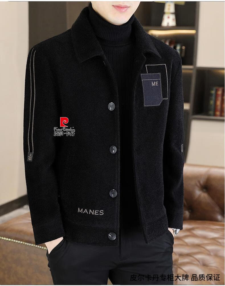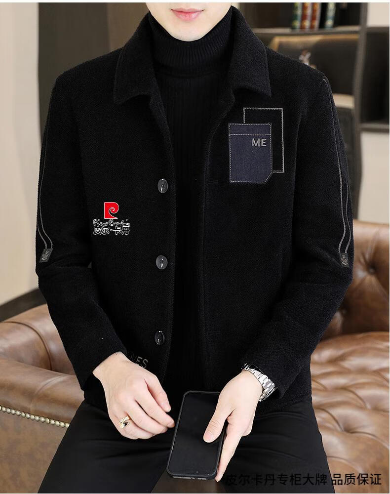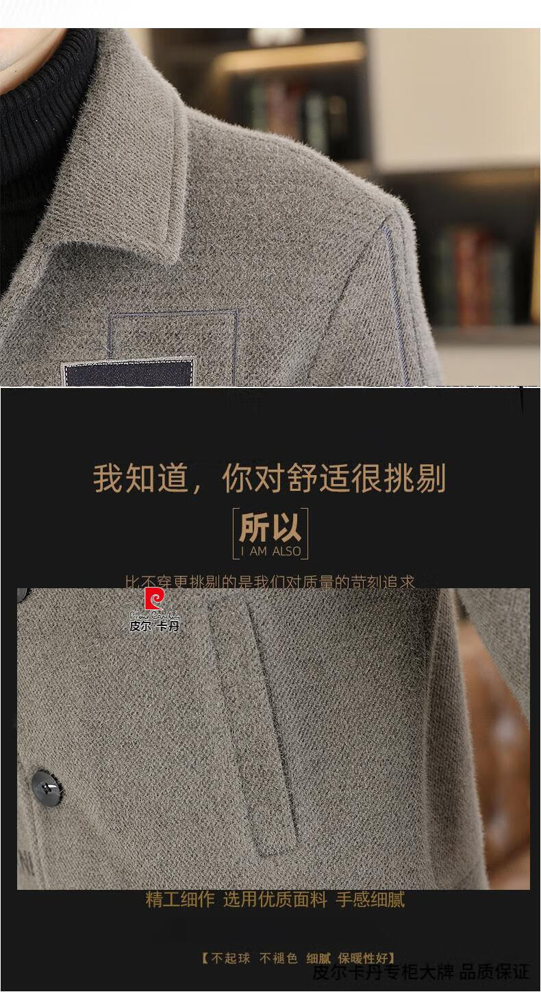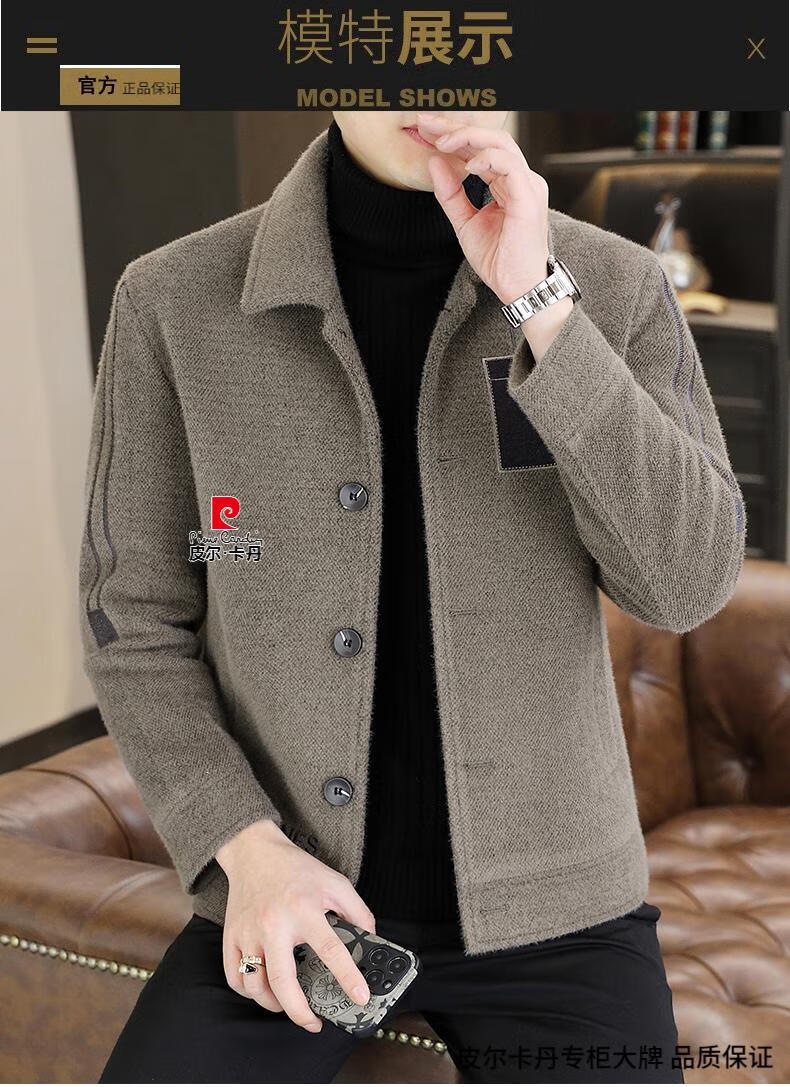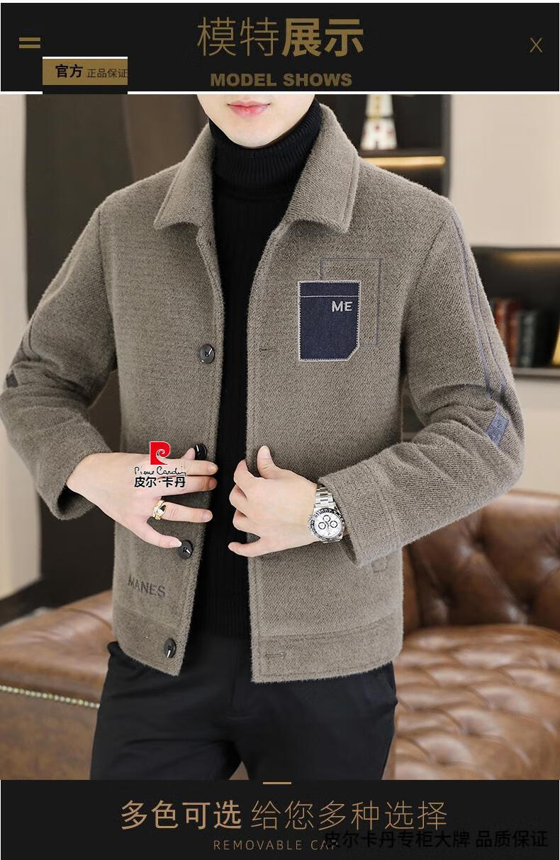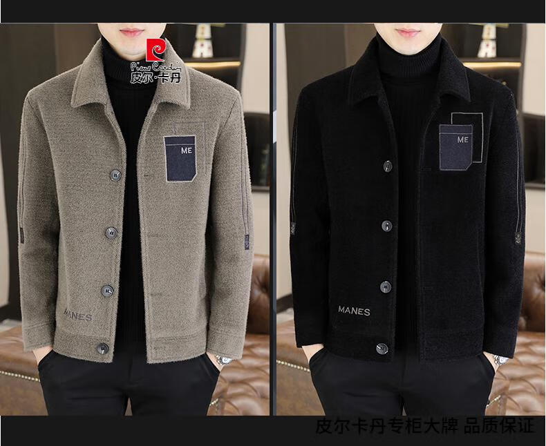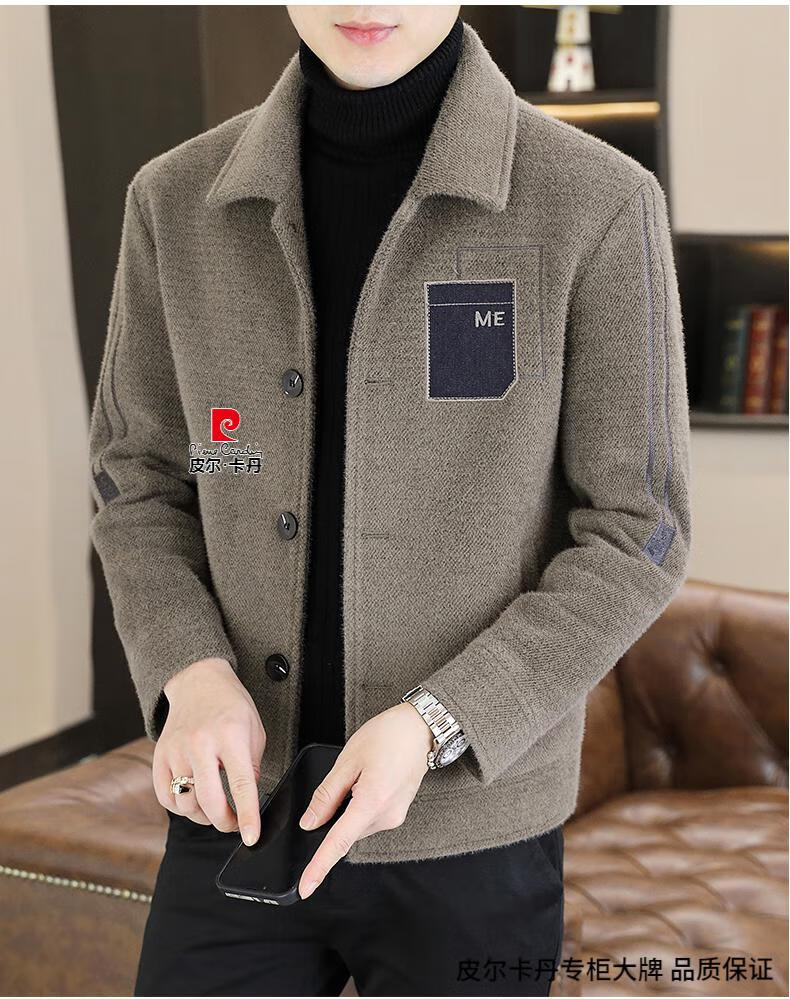 Pierre Cardin Men's Gold Mink Woolen Jacket Autumn and Winter New Woolen Coat Short Men's Casual Thickened Lapel Jacket Gray Cotton 4XL 160-175 catties