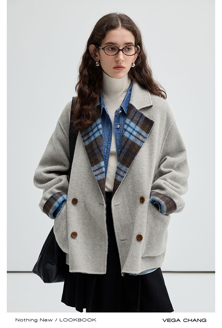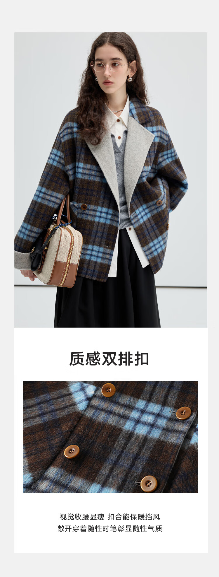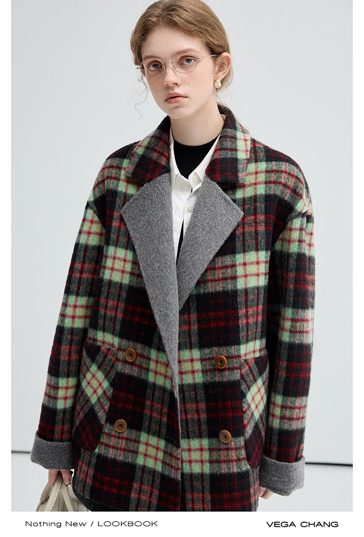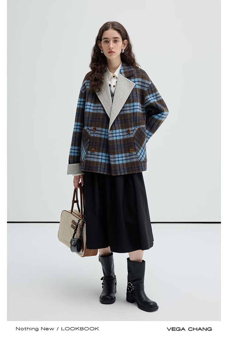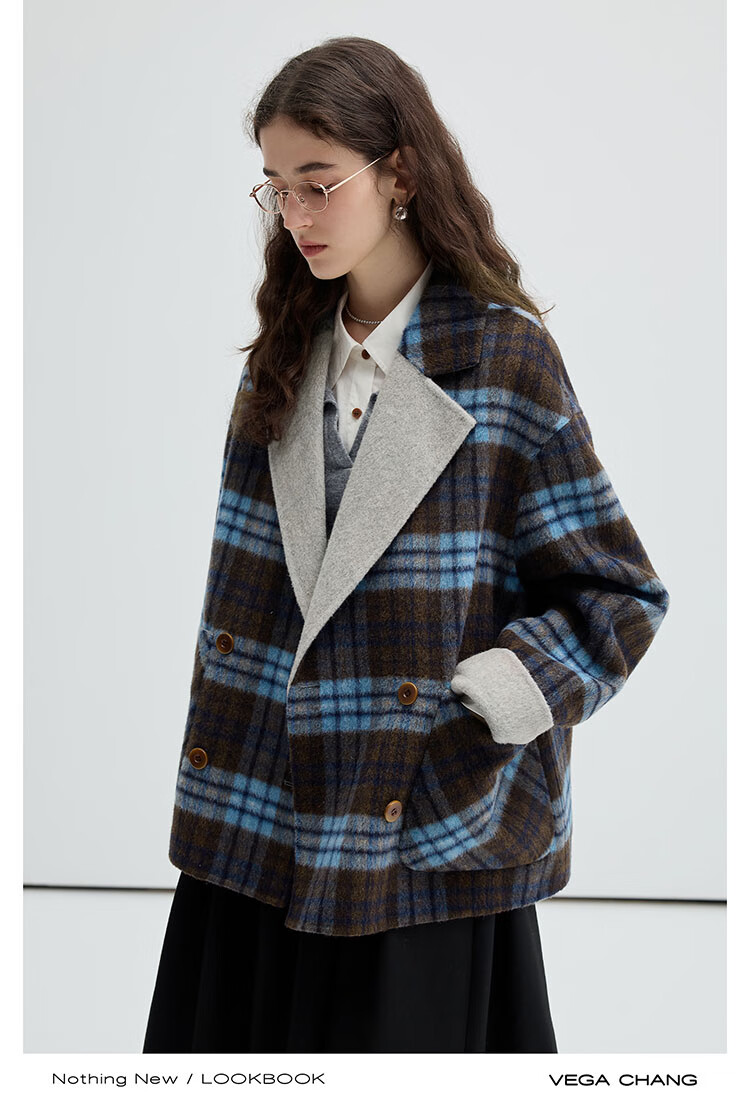 VEGA CHANG double-sided woolen coat for women winter small alpaca woolen coat Nordic blue plaid S