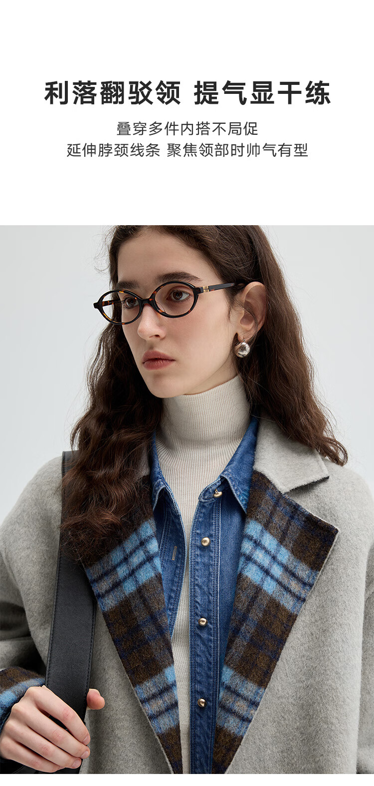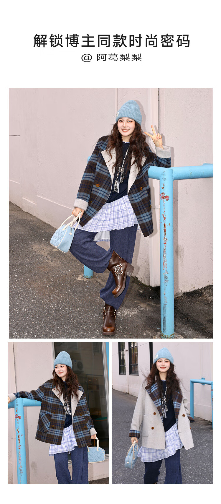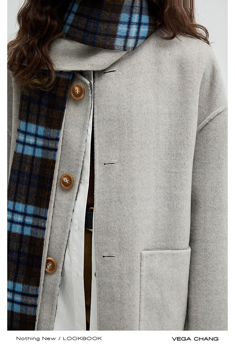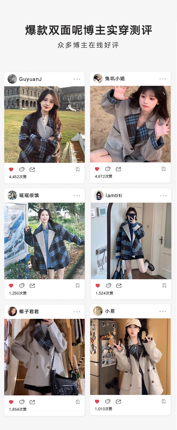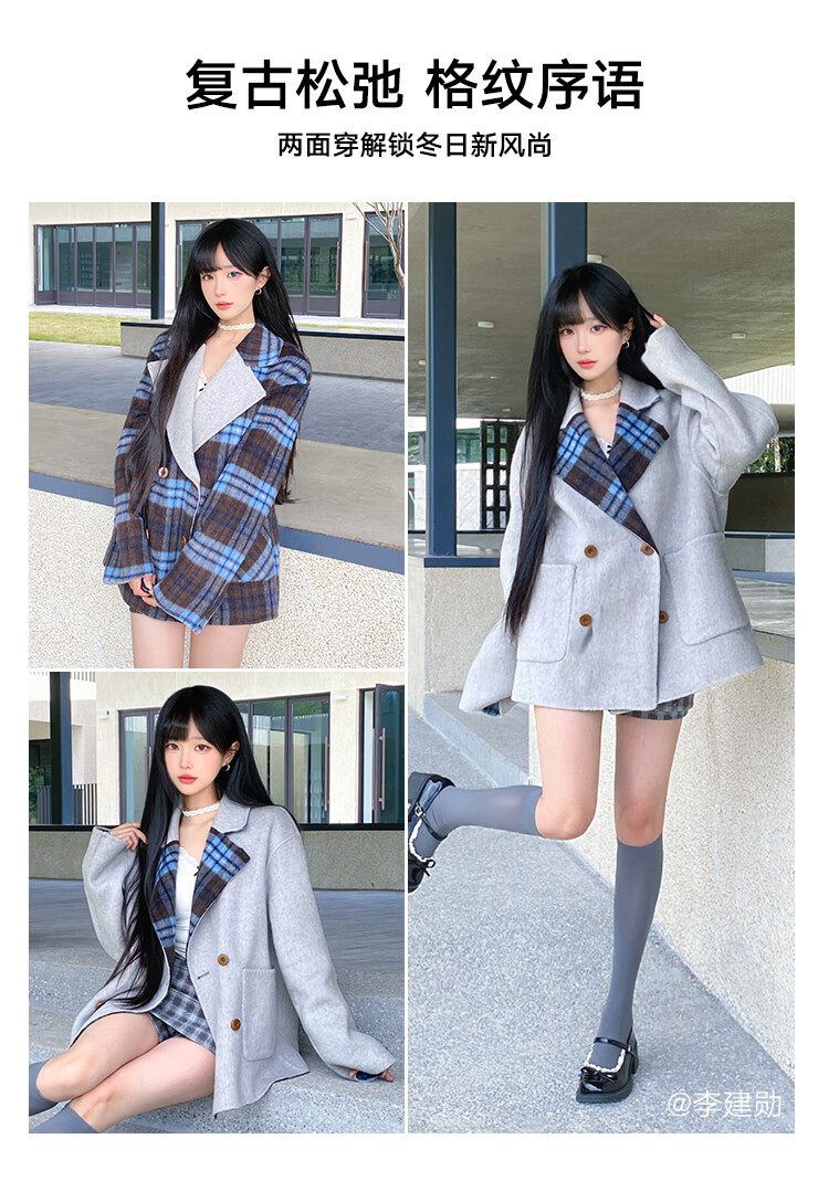 VEGA CHANG double-sided woolen coat for women winter small alpaca woolen coat Nordic blue plaid S