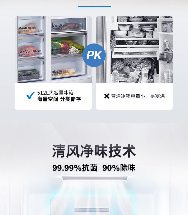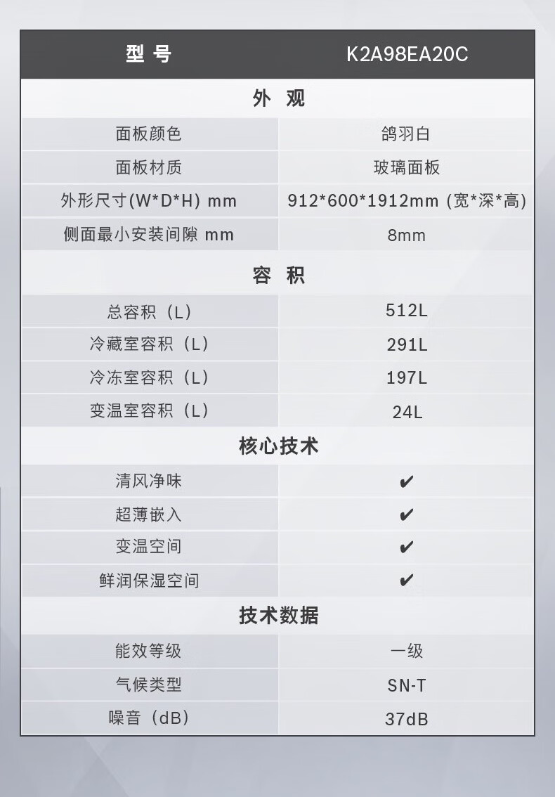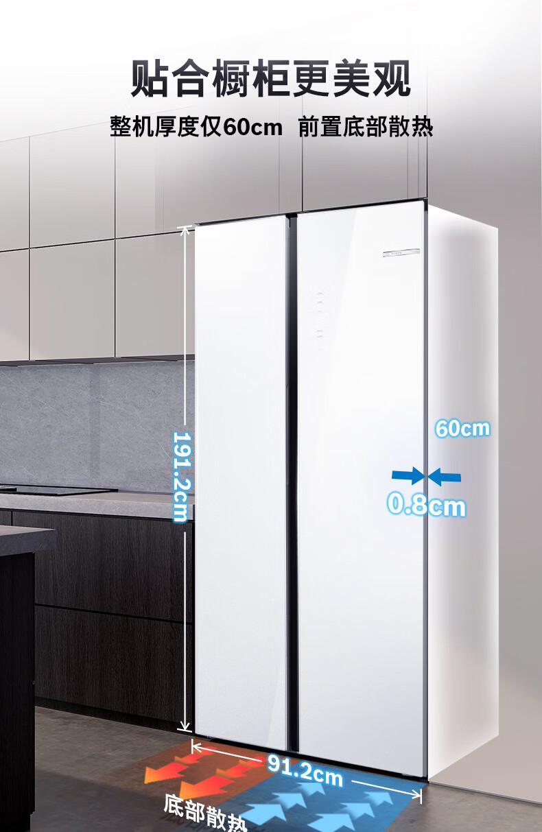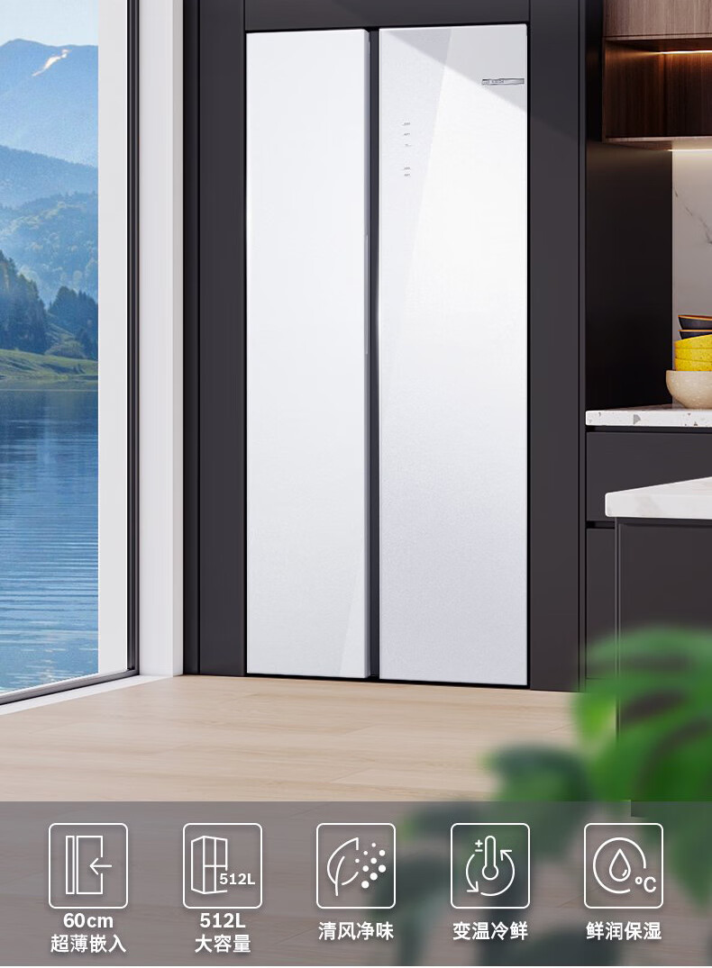 Bosch refrigerator 60cm ultra-thin flat embedded household 512L large capacity double door refrigerator glass panel antibacterial and deodorizing temperature changing preservation space K2A98EA20C white