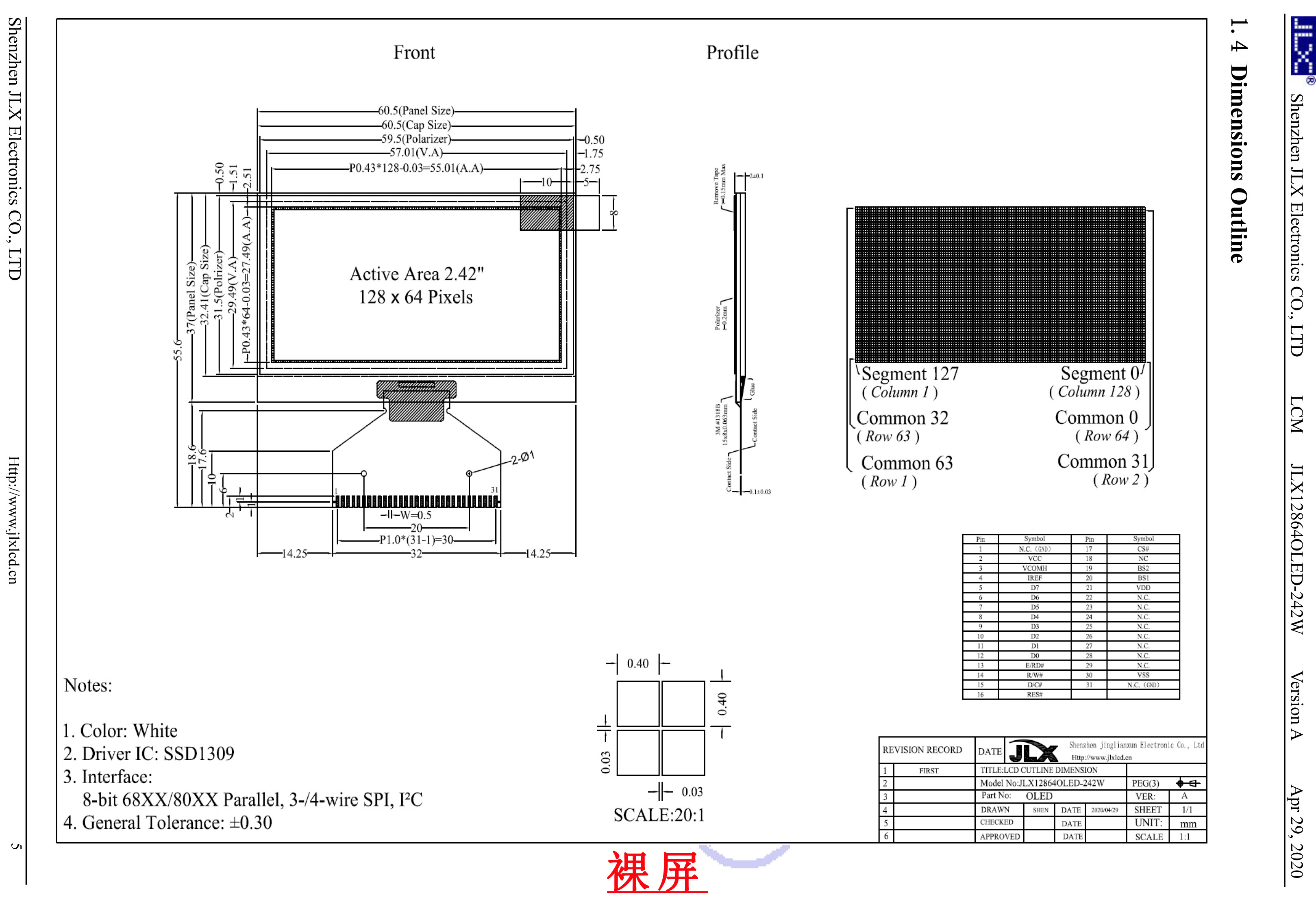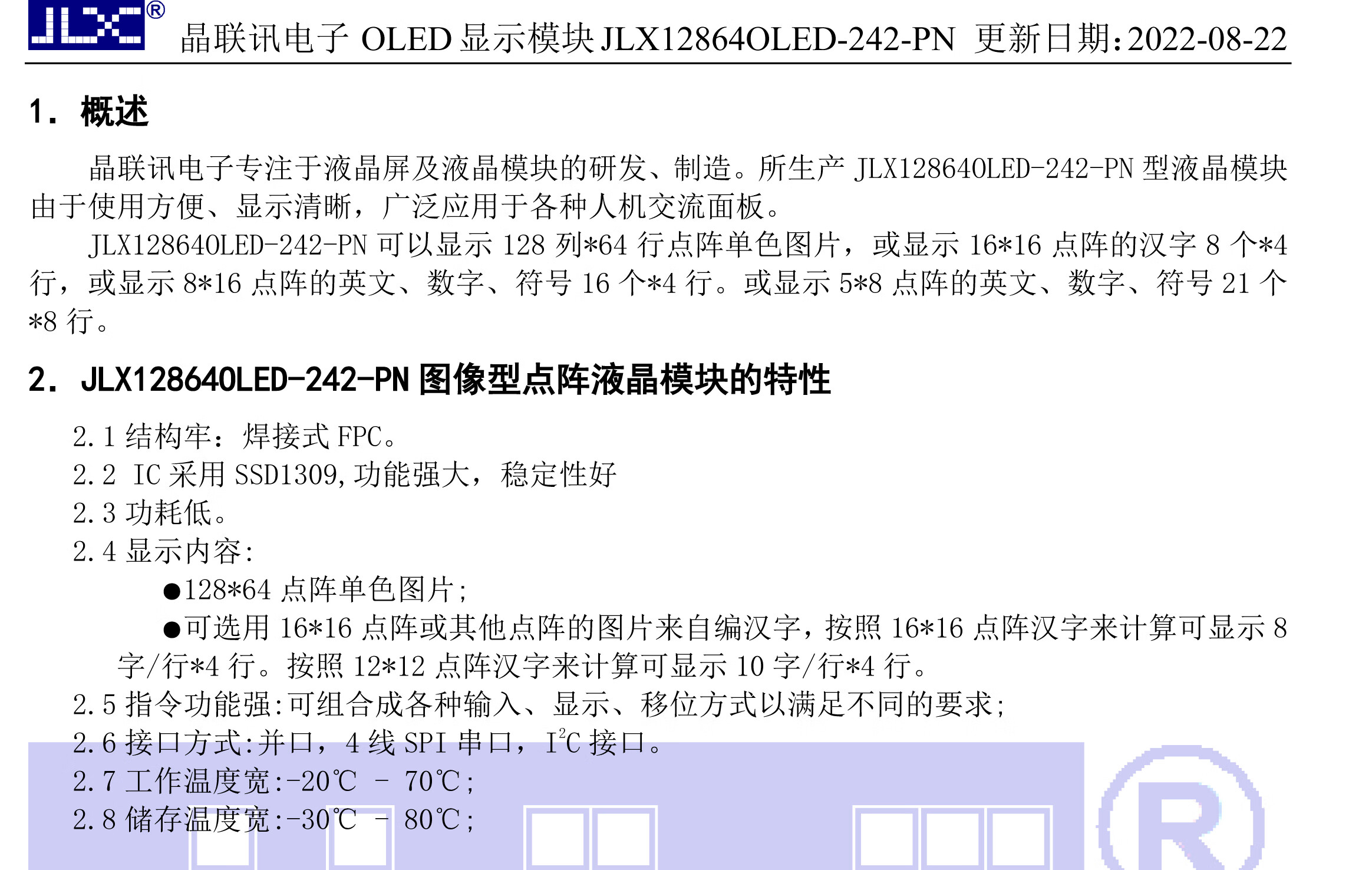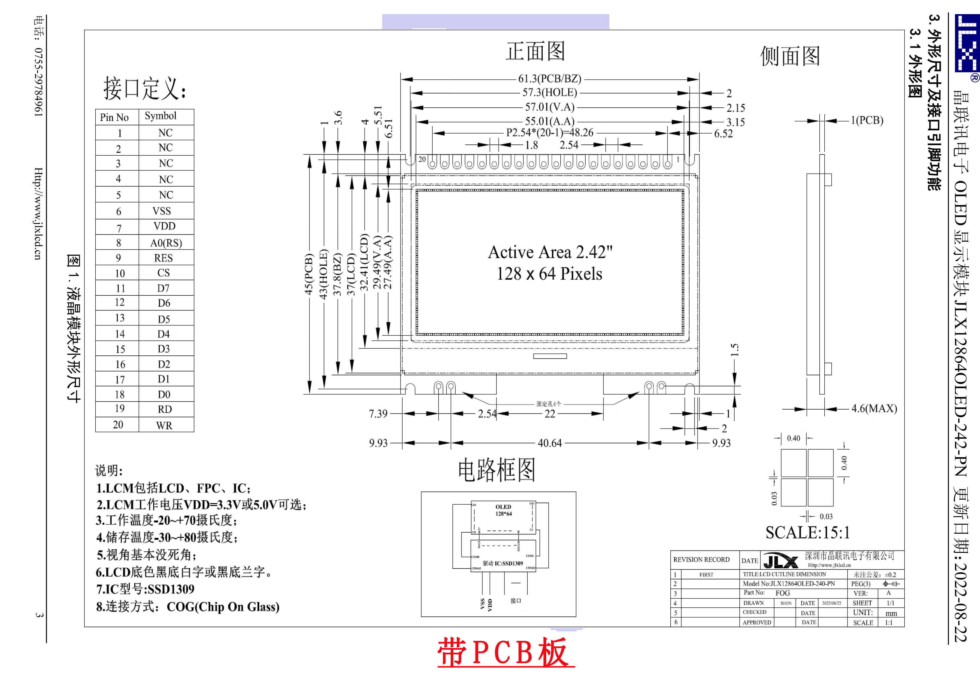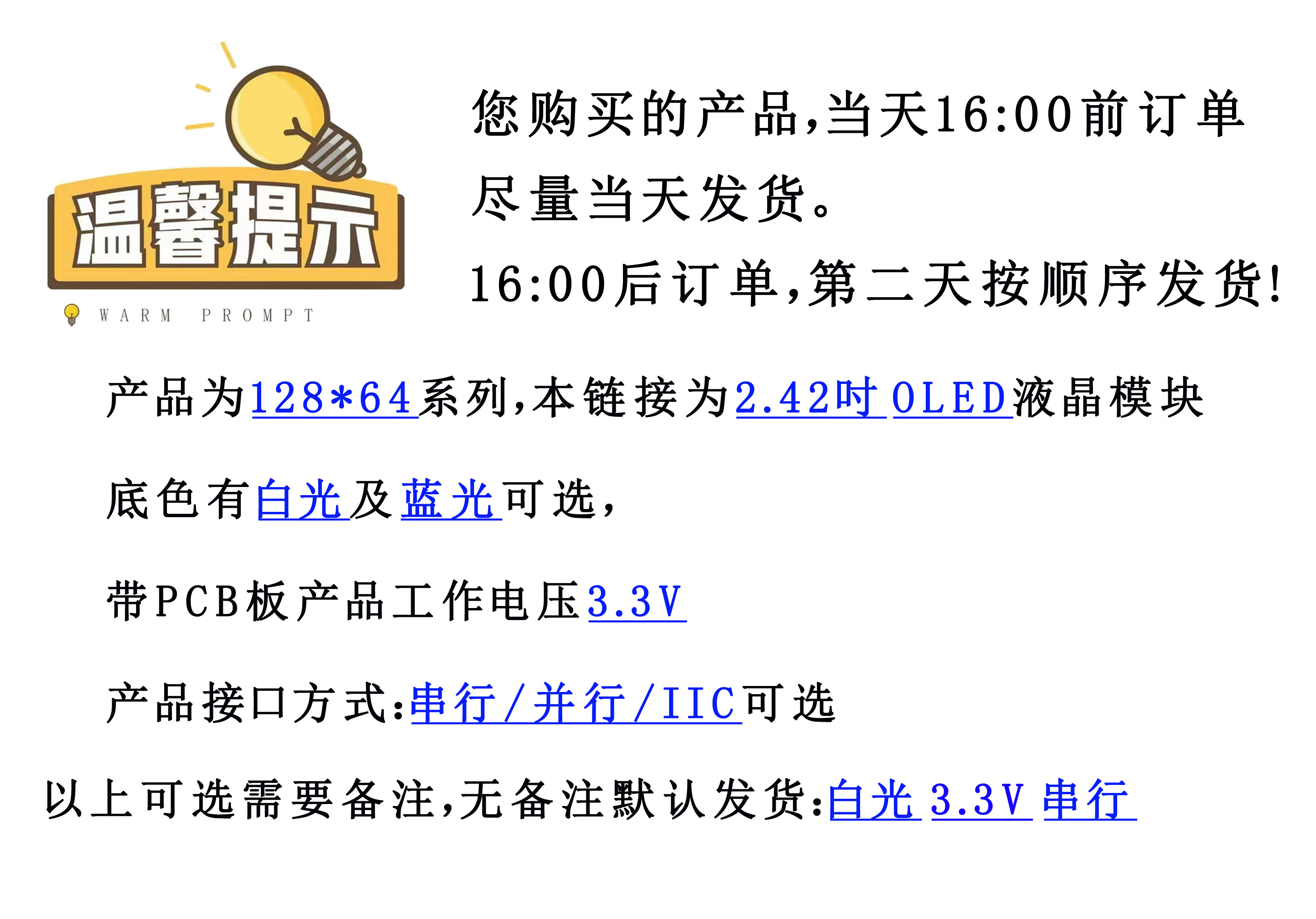 Jinglianxun 128*64 dot matrix display 2.4-inch OLED screen display module ultra-wide viewing angle JLX12864OLED-242 OLED-24202W plug-in FPC (bare screen) background color white light/blue light optional with PCB board working voltage 3.3V interface