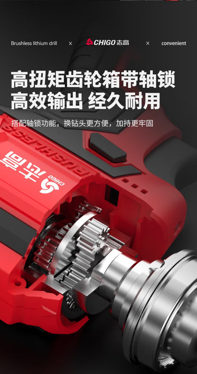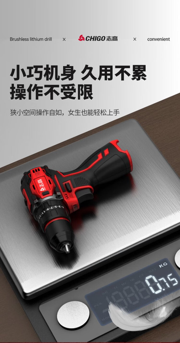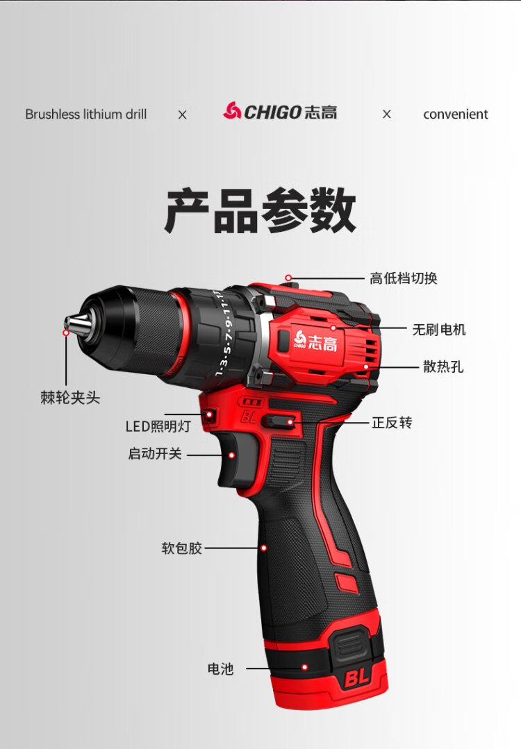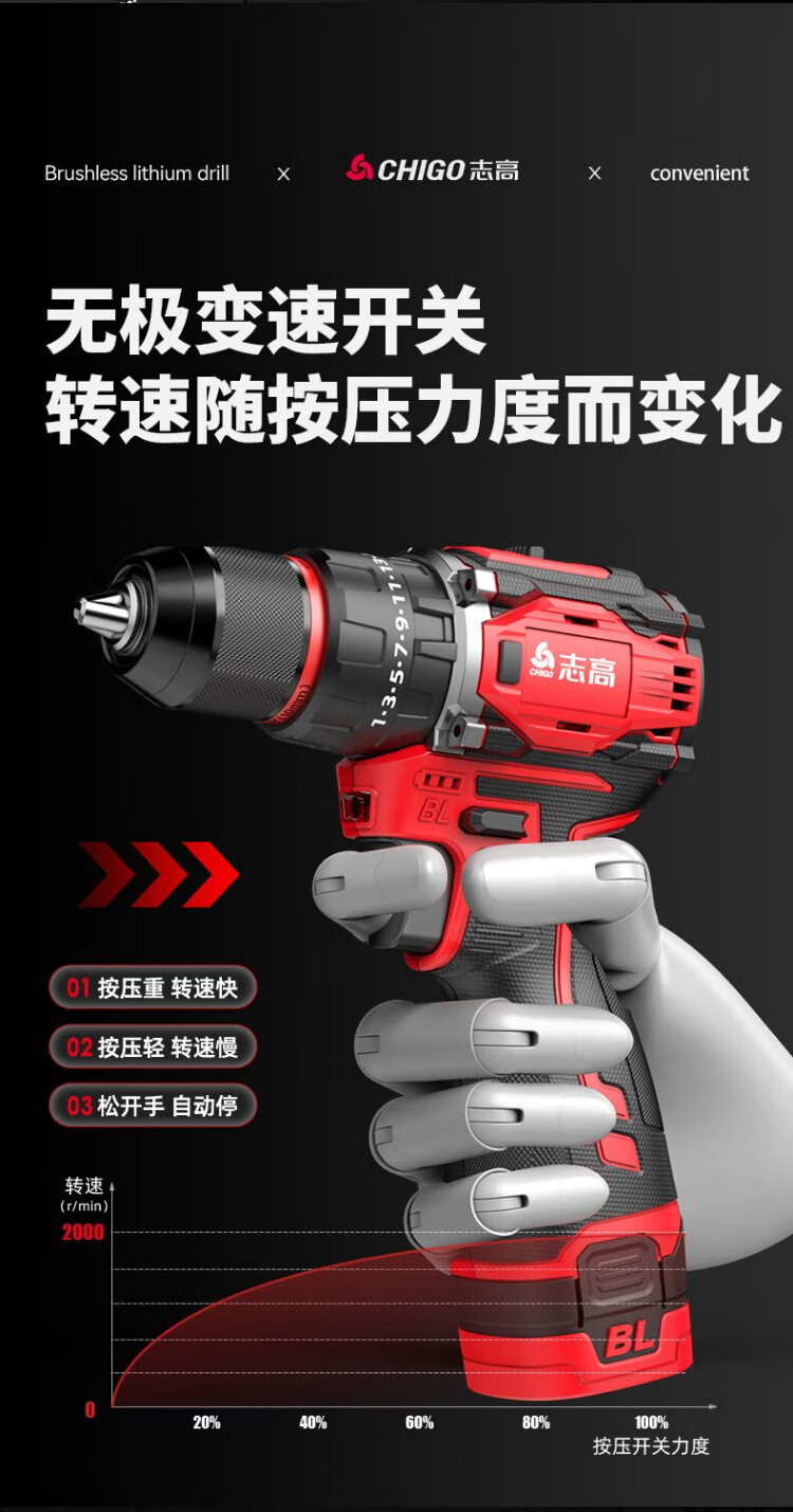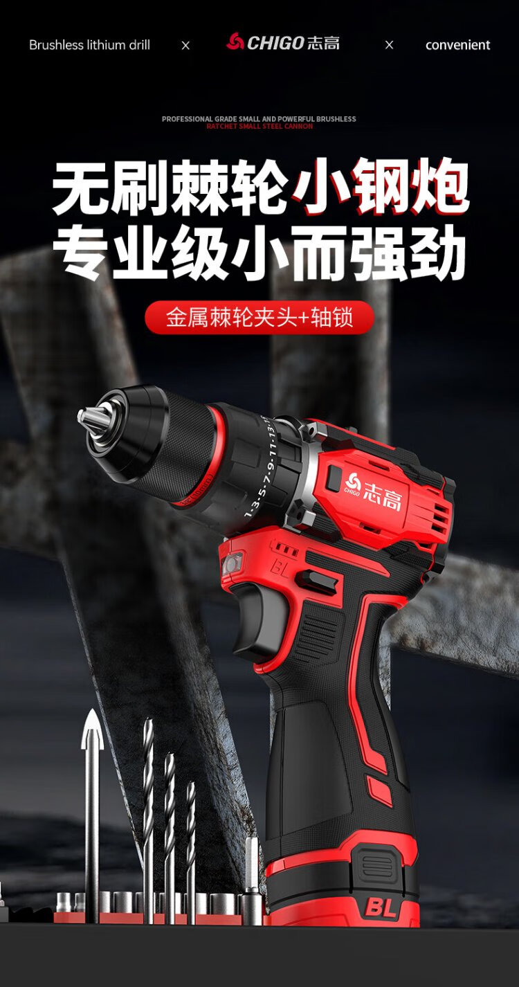 Chigo Brushless Hand Drill Lithium Battery Impact Drill Household Electric Drill Small Steel Cannon Rechargeable Multi-Function Electric Pistol Drill 120N Impact Small Steel Cannon 2.0Ah One Power + Gift