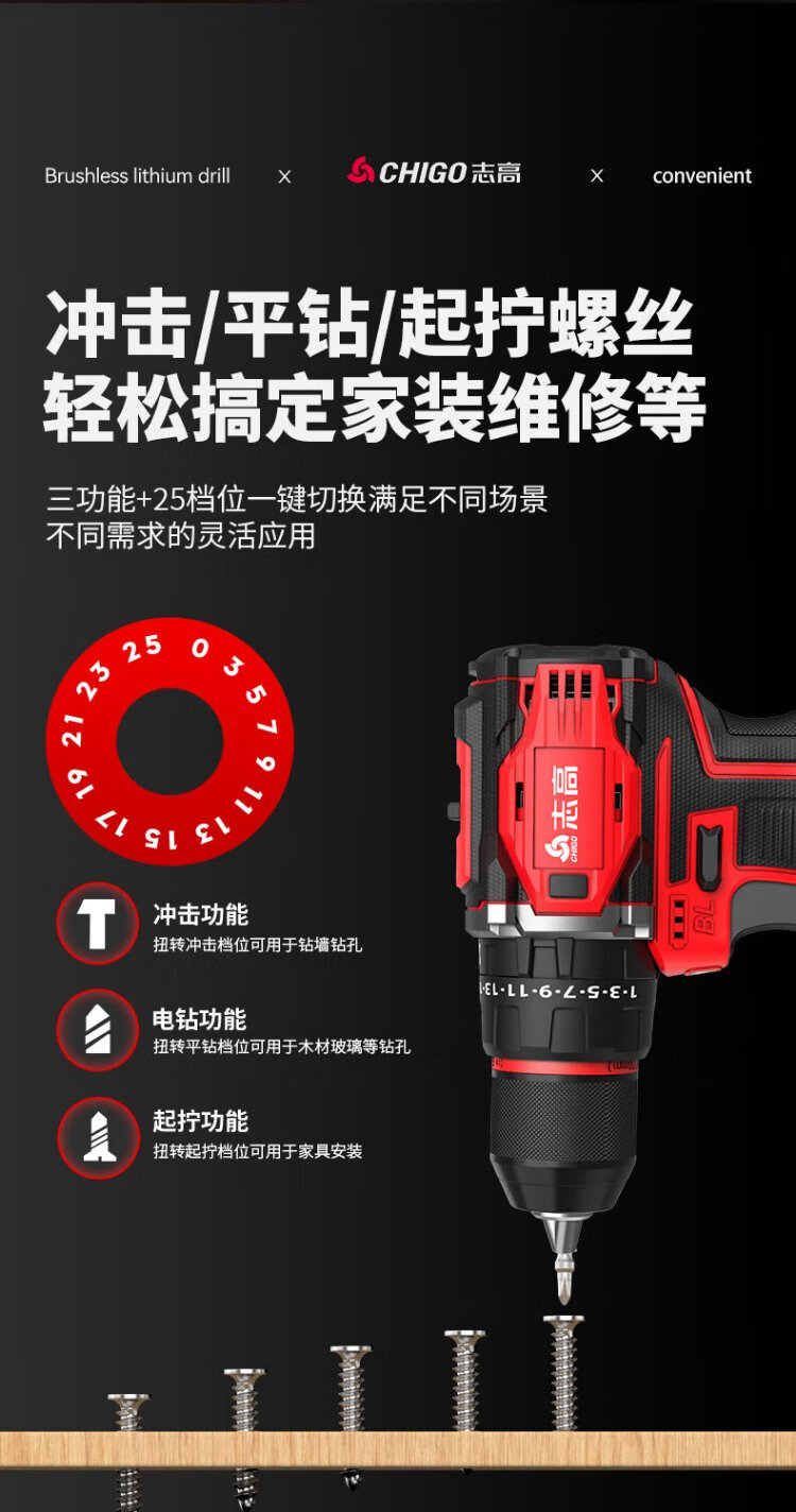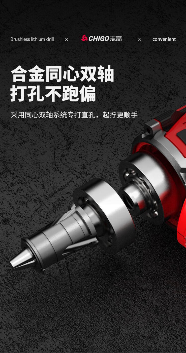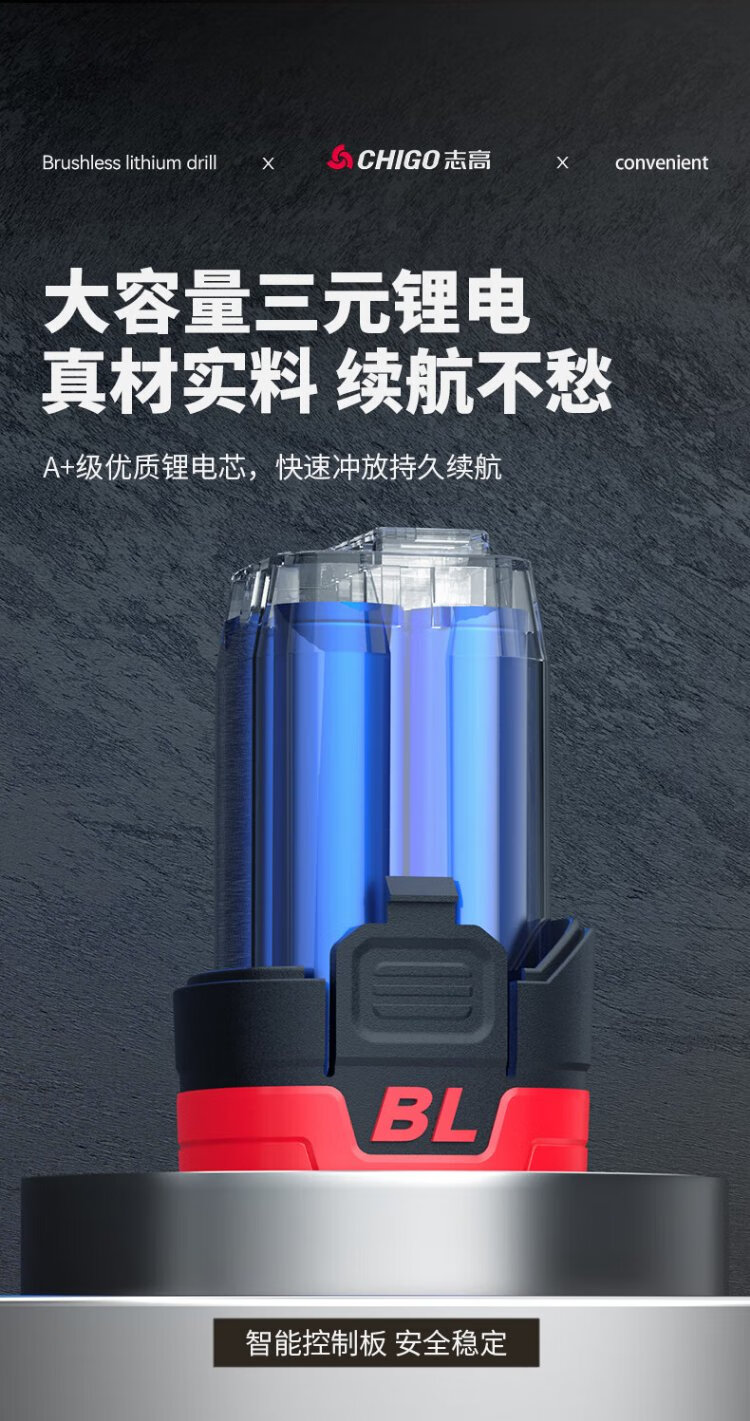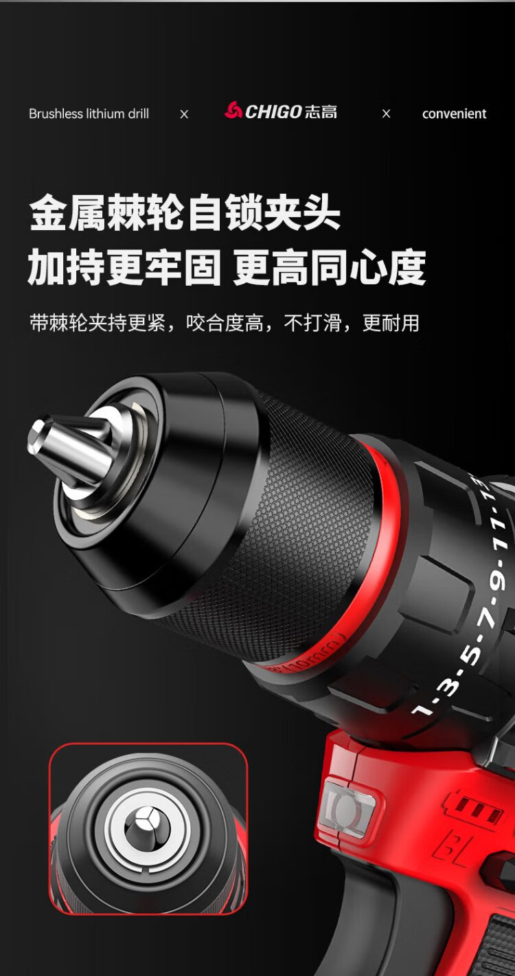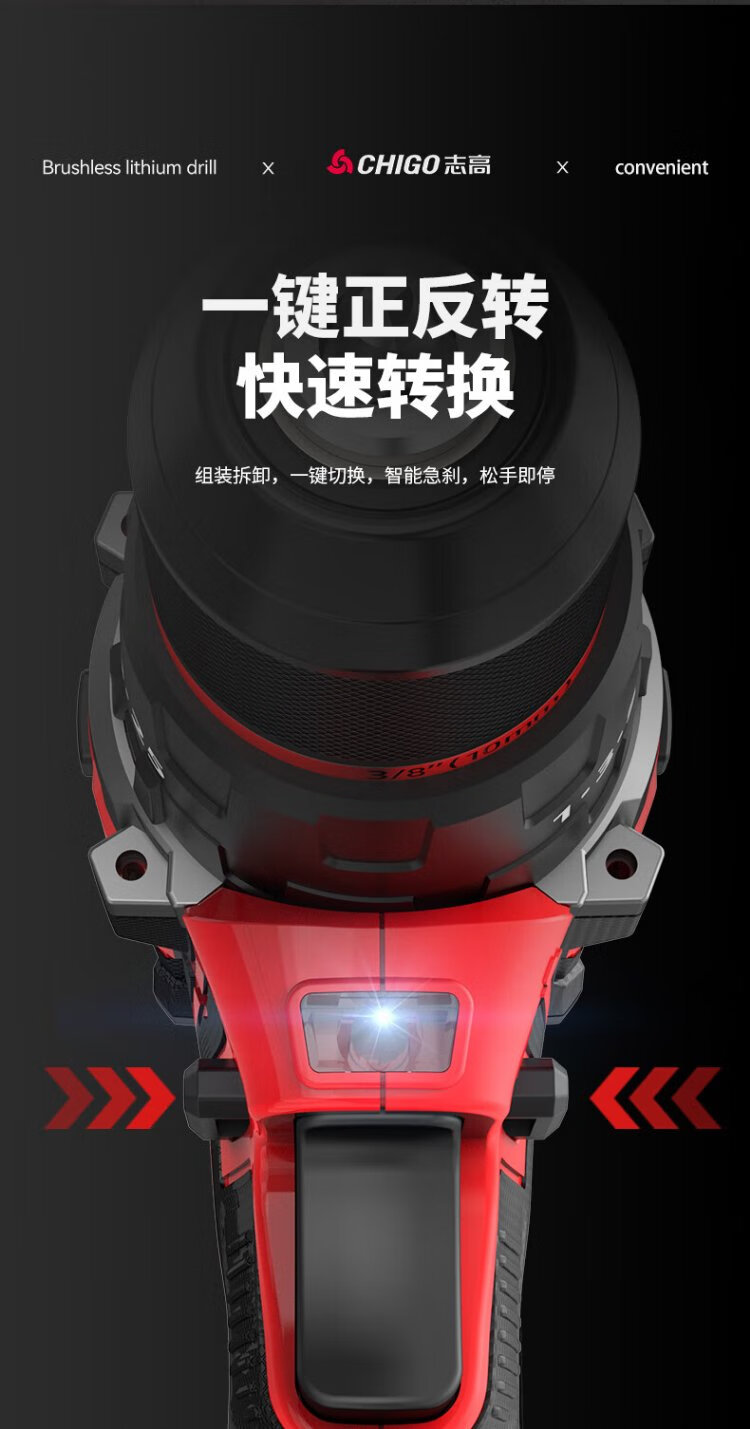 Chigo Brushless Hand Drill Lithium Battery Impact Drill Household Electric Drill Small Steel Cannon Rechargeable Multi-Function Electric Pistol Drill 120N Impact Small Steel Cannon 2.0Ah One Power + Gift