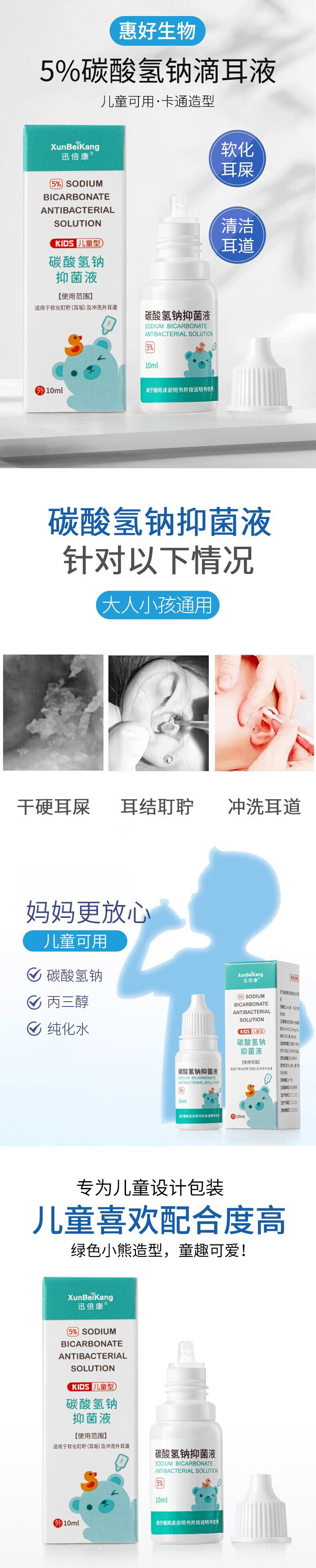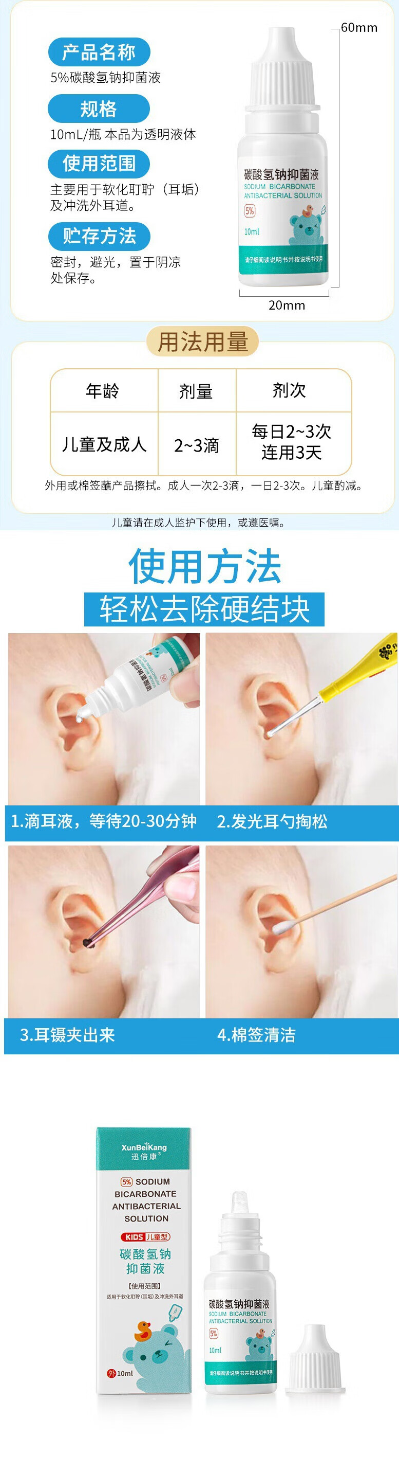 Xunbeikang Sodium Bicarbonate Ear Drops for Children, Iron Ear Wax Softening Baby Cerumen Water Liquid Ear Wax Baby Ear Removal Artifact, Single Bottle (Available Over One Year Old) (Bottle/10ml)