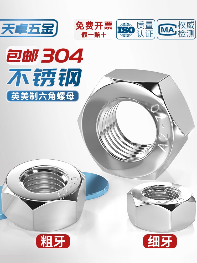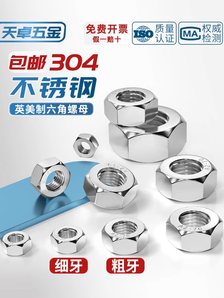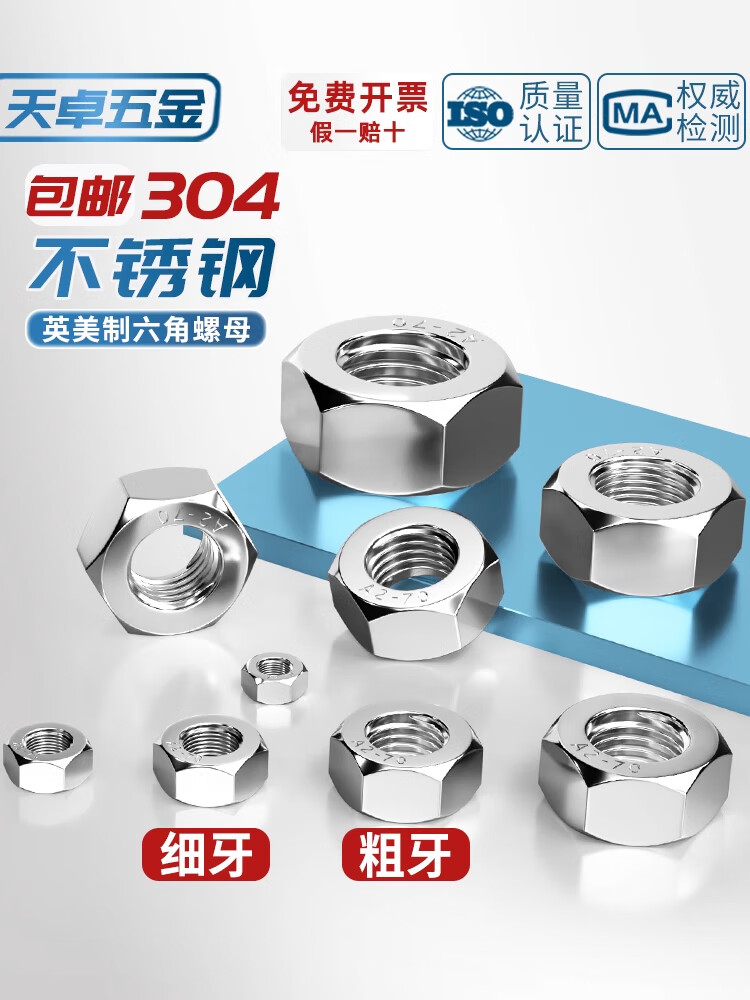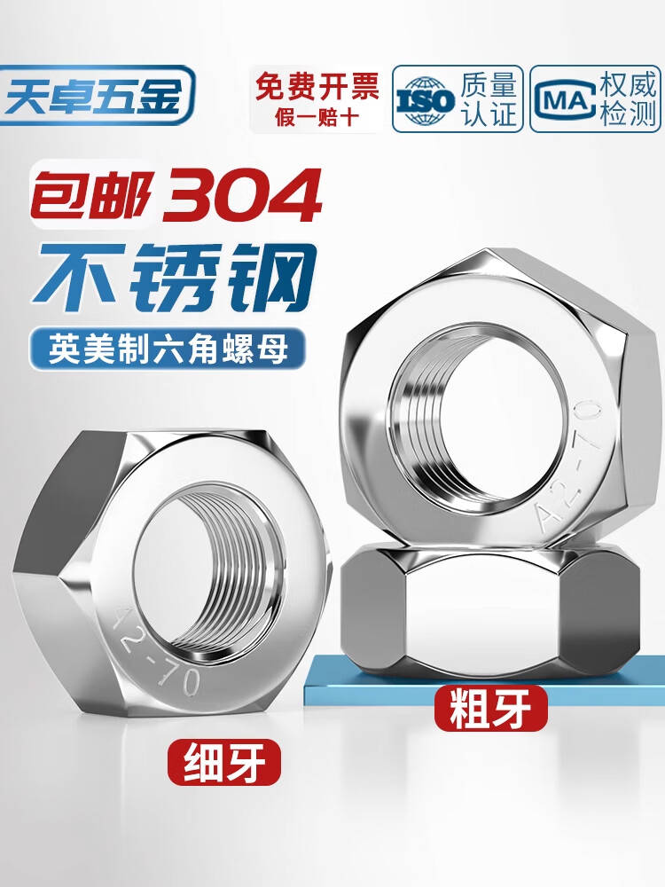 Tianzhuo Hardware 304 stainless steel American inch nut collection UNF fine thread hexagonal nut inch inch fine thread nut 1/4-1/2 1-1/4-7 teeth 1 American made
