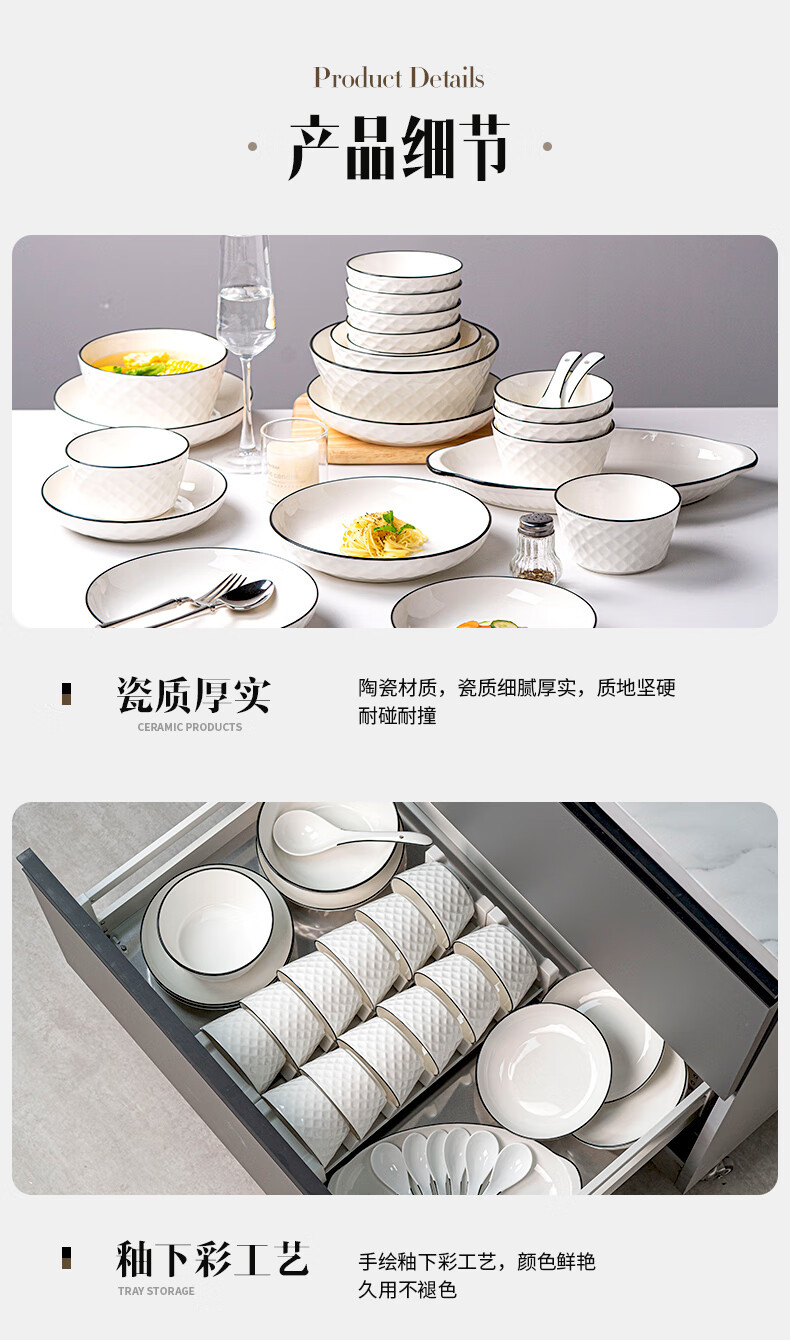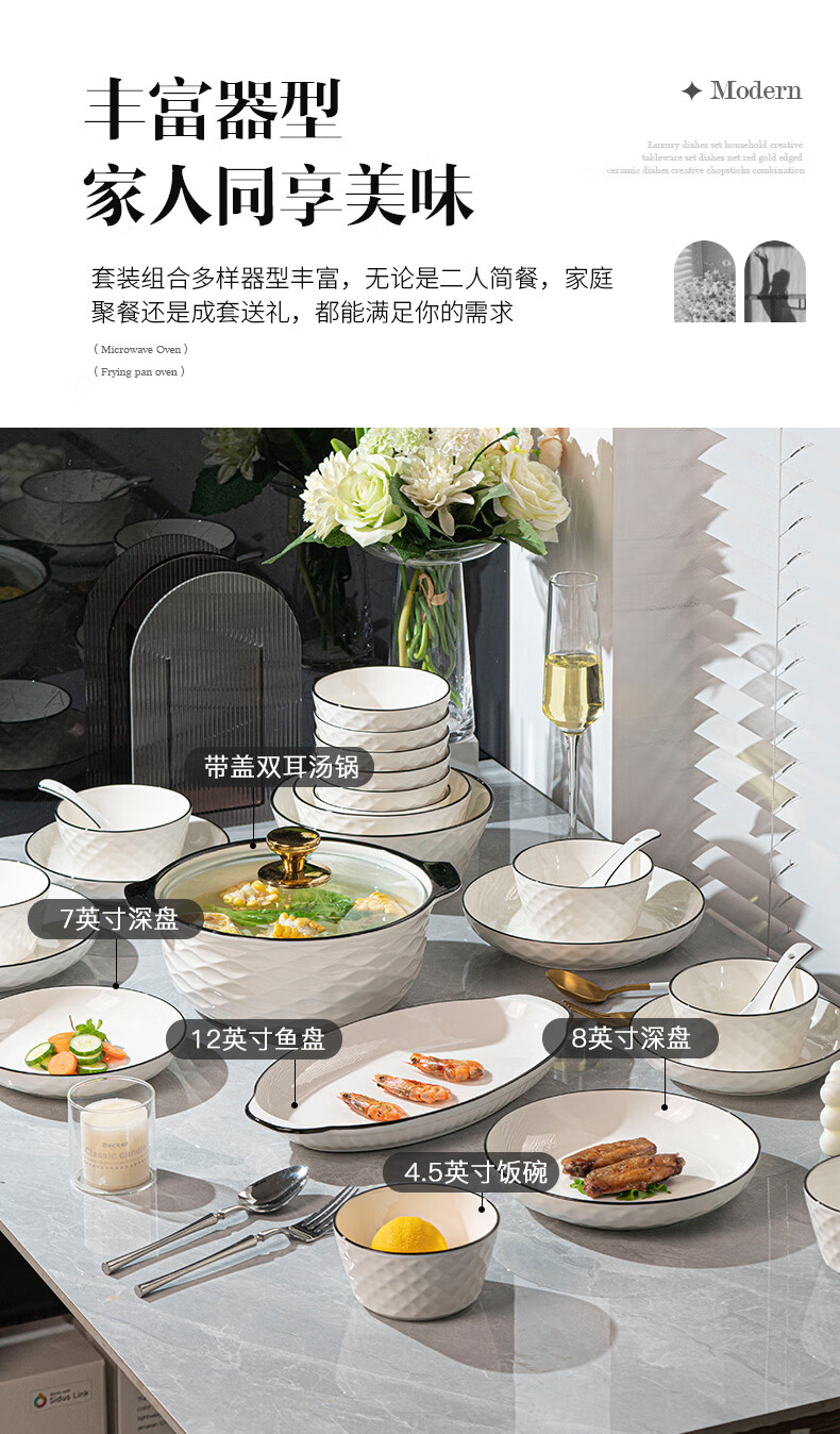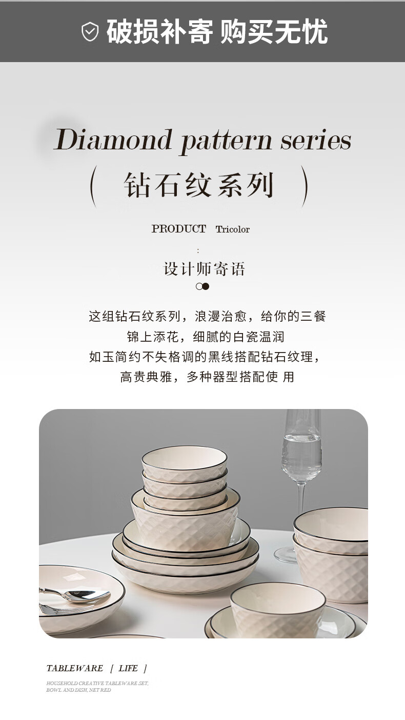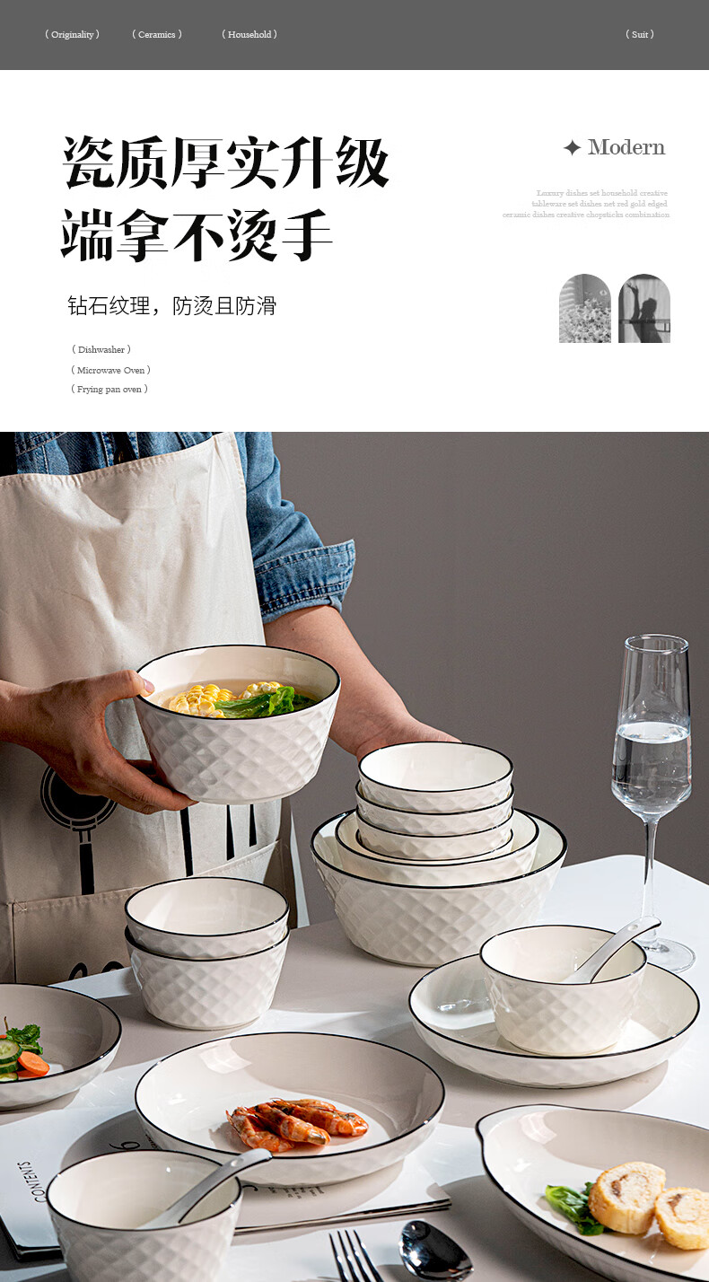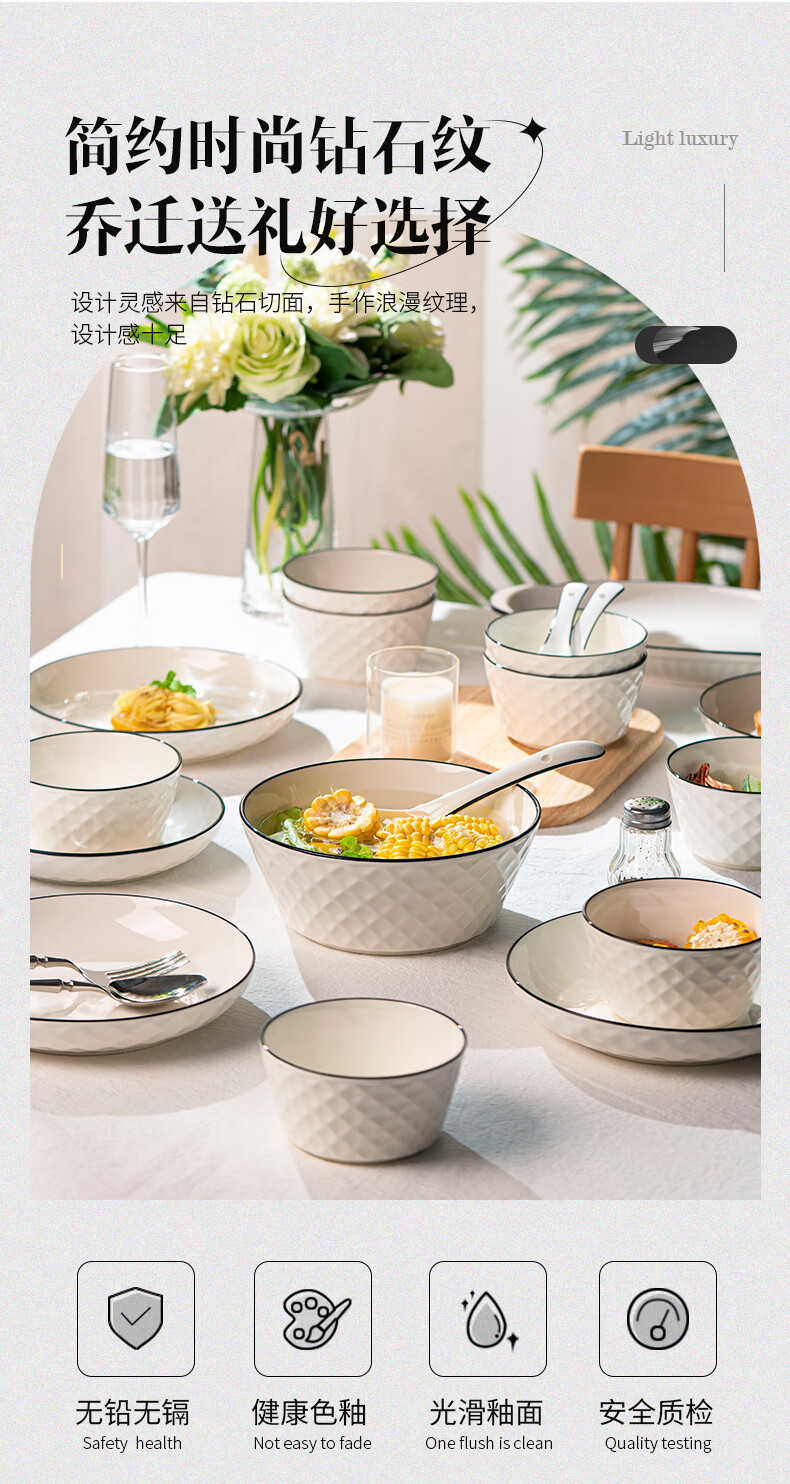 Guanpu bowl and dish set household Jingdezhen bowls high-value ceramic bowls and plates bowls and chopsticks plate set housewarming tableware set diamond pattern 12 people food (soup pot configuration) 63-piece set