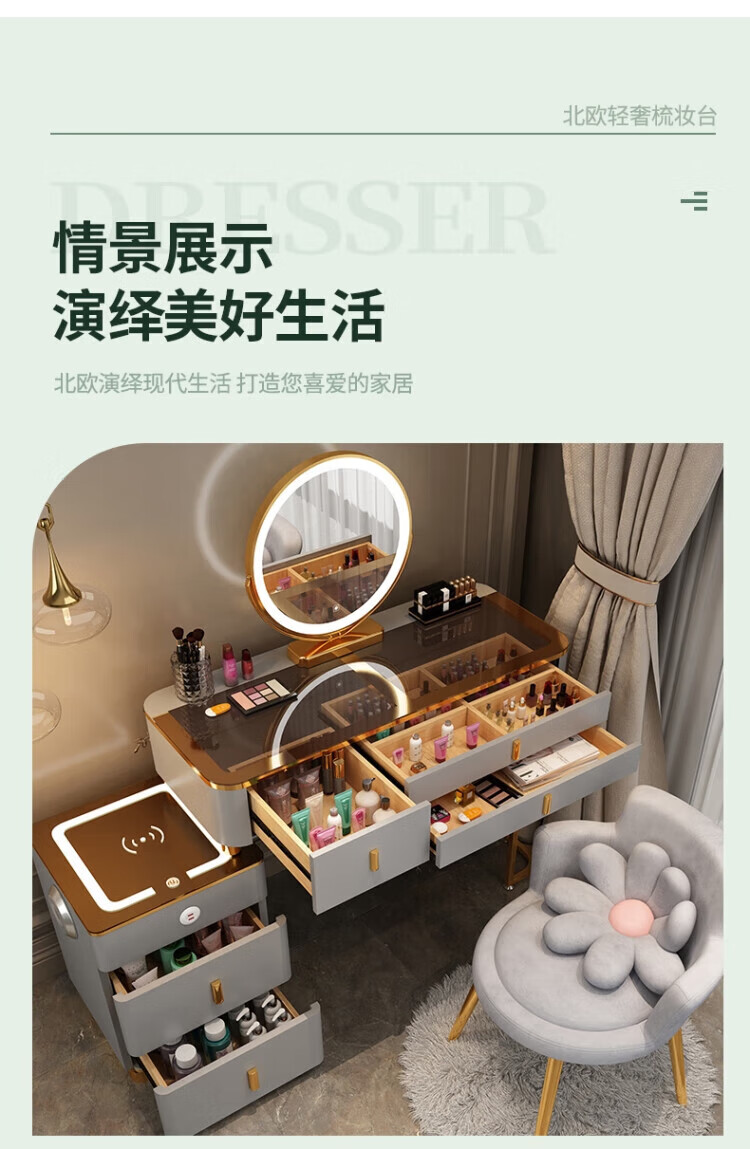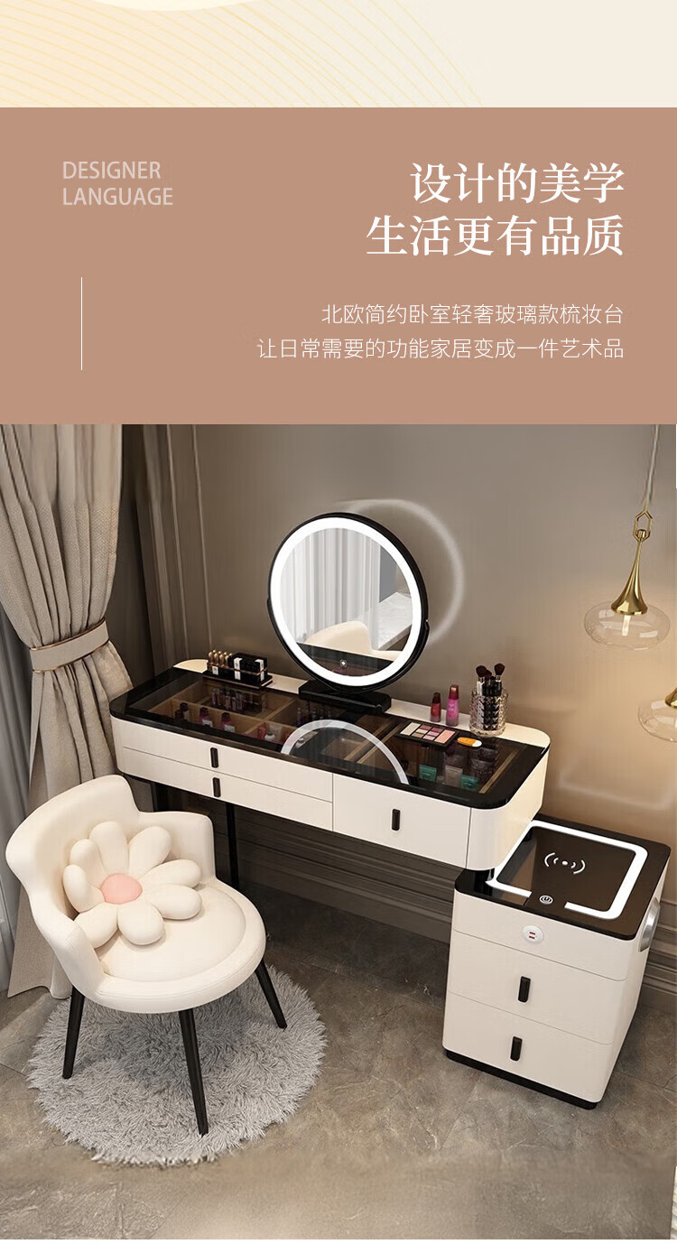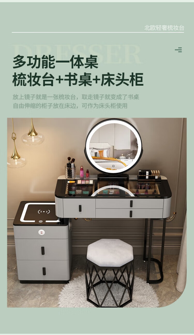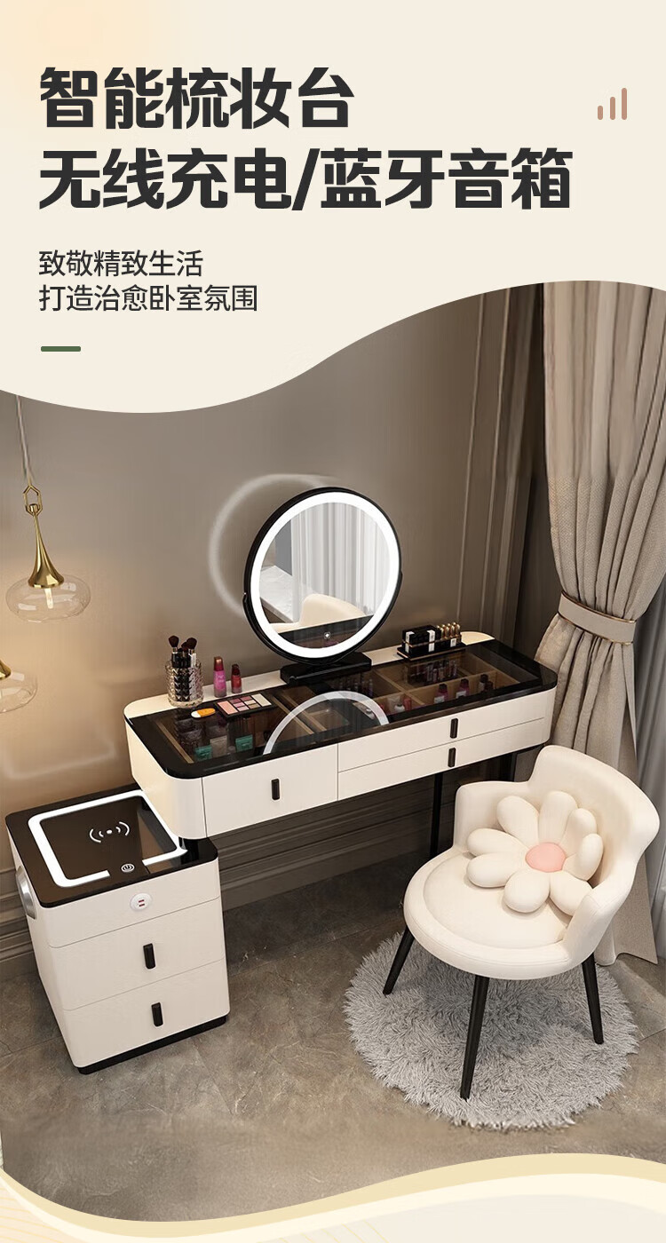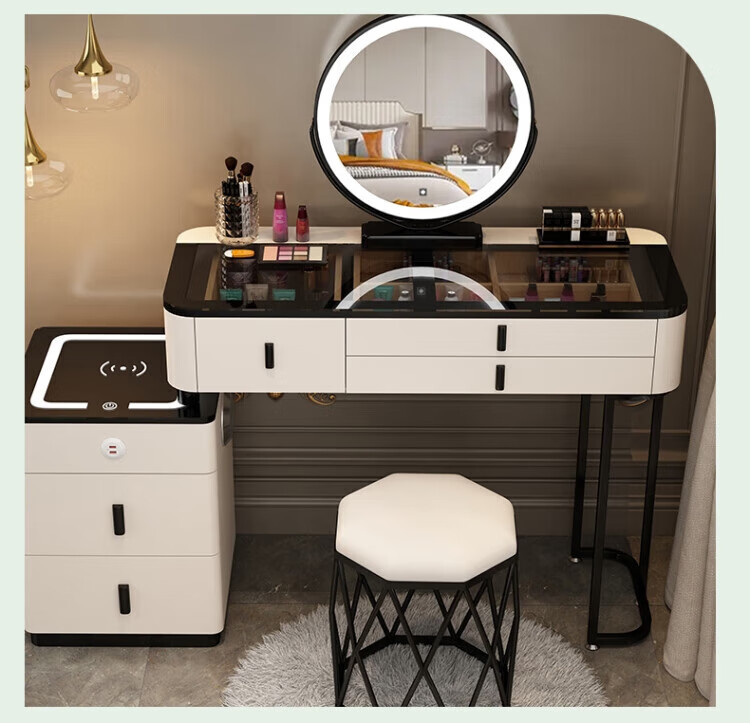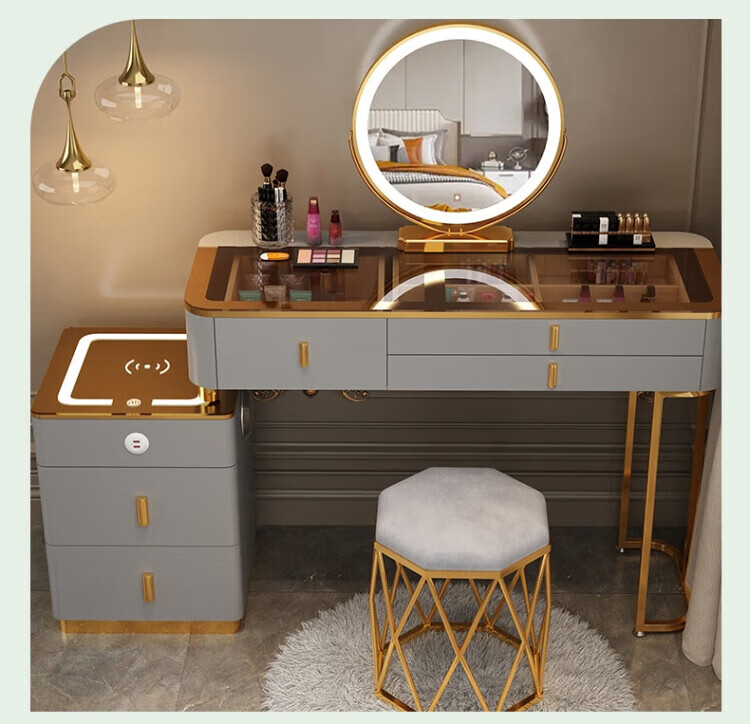 Xunhuai dressing table bedroom master bedroom new mini dressing table storage cabinet integrated modern simple light luxury small apartment gray and black 80cm + smart cabinet + round mirror + small flower chair