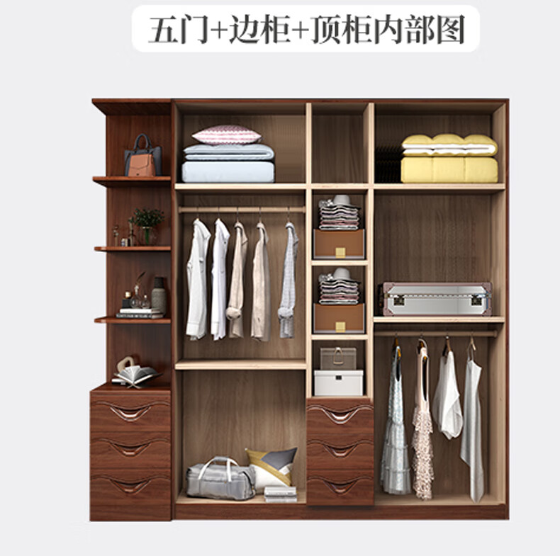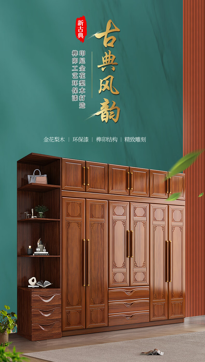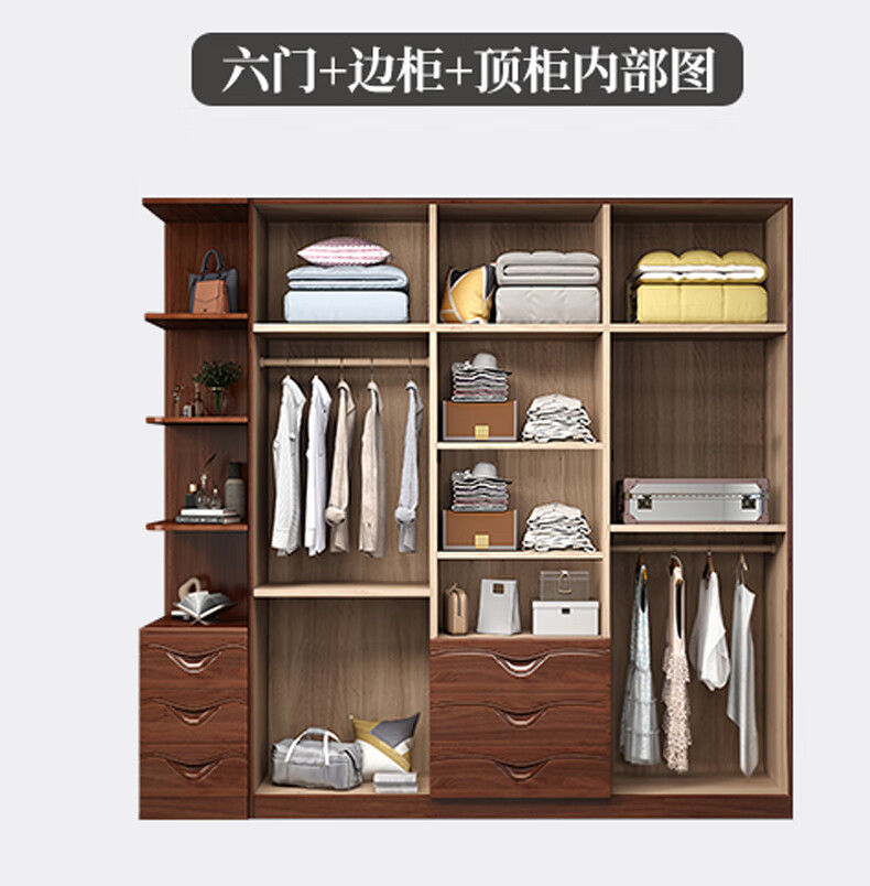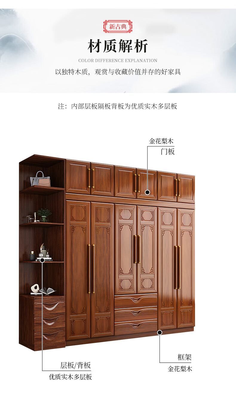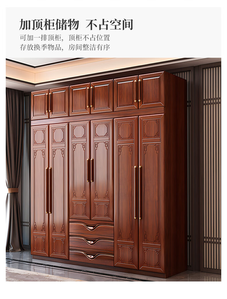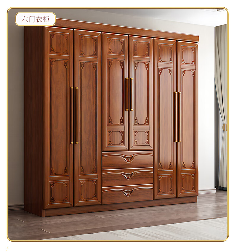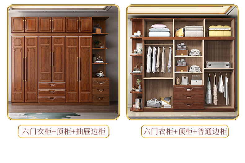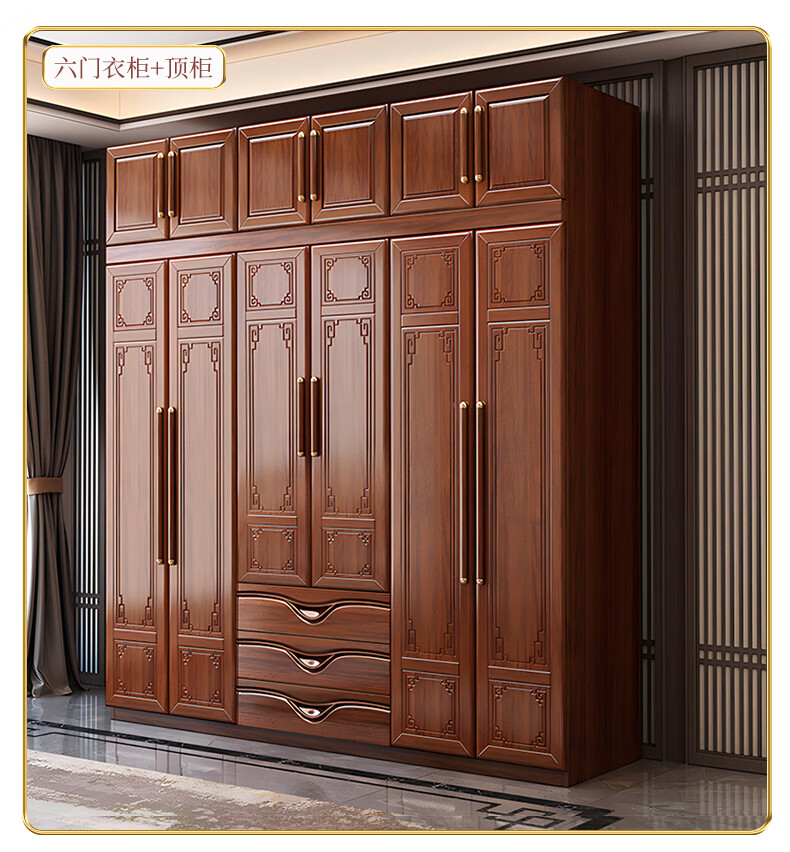 Hengyun Wardrobe New Chinese Style Golden Rosewood Wardrobe with Drawers Bedroom Home Locker Top Cabinet Wardrobe Z8628-1 Six-Door Wardrobe with Center Drawer Golden Rosewood