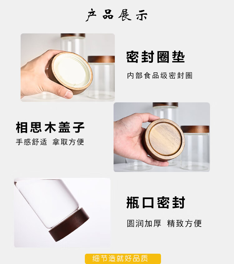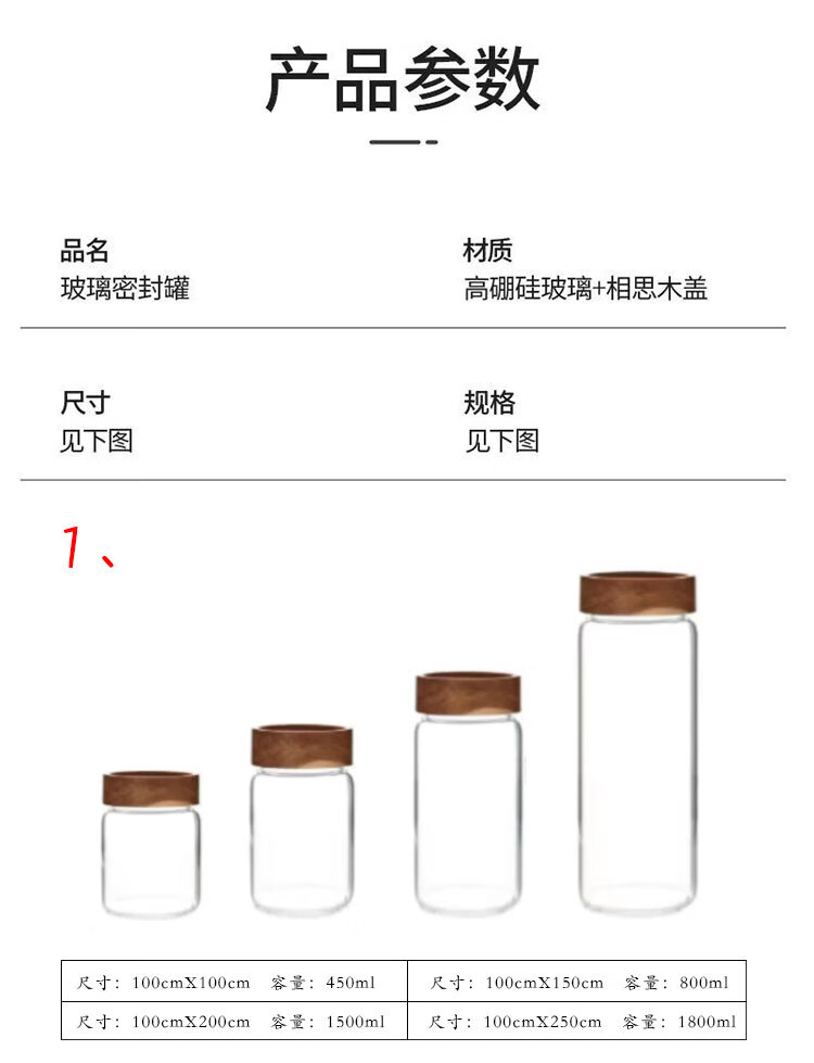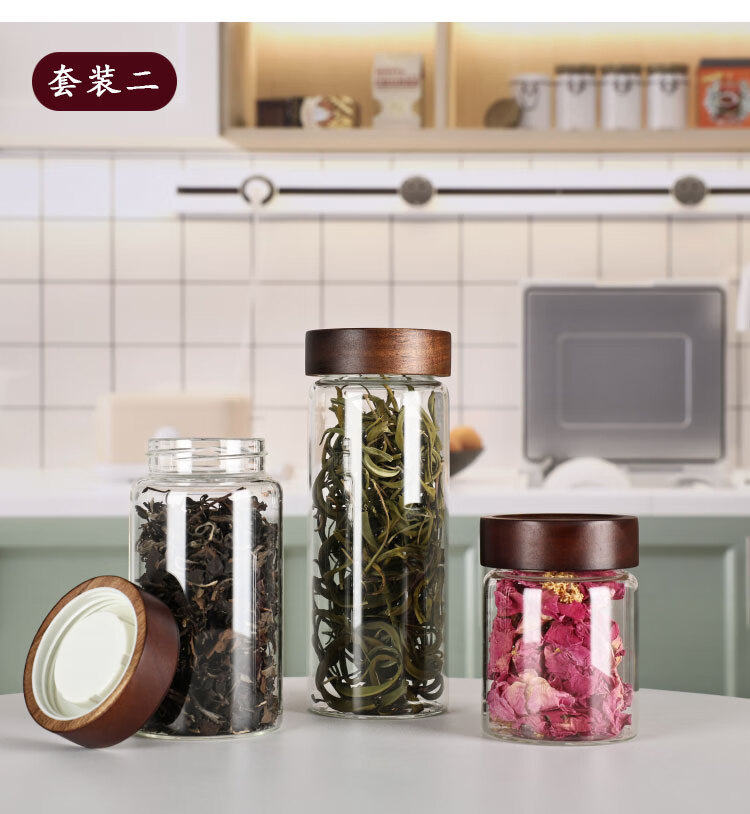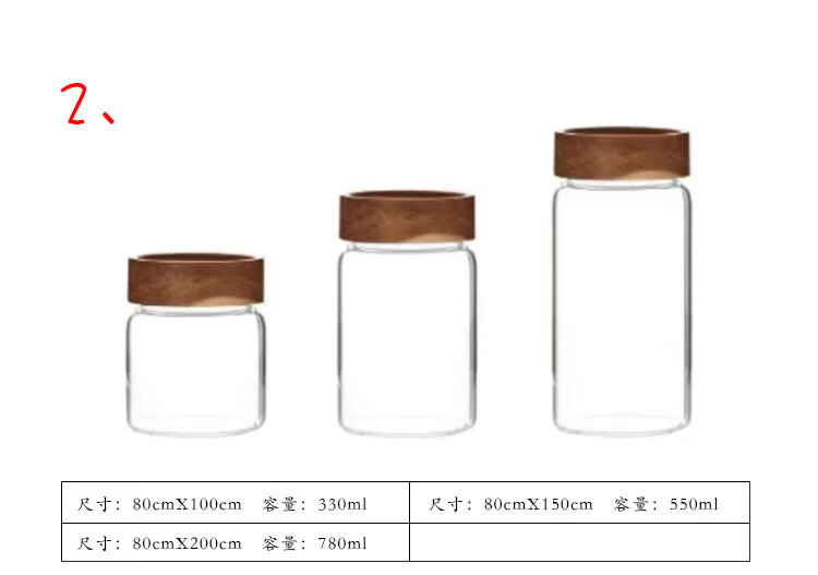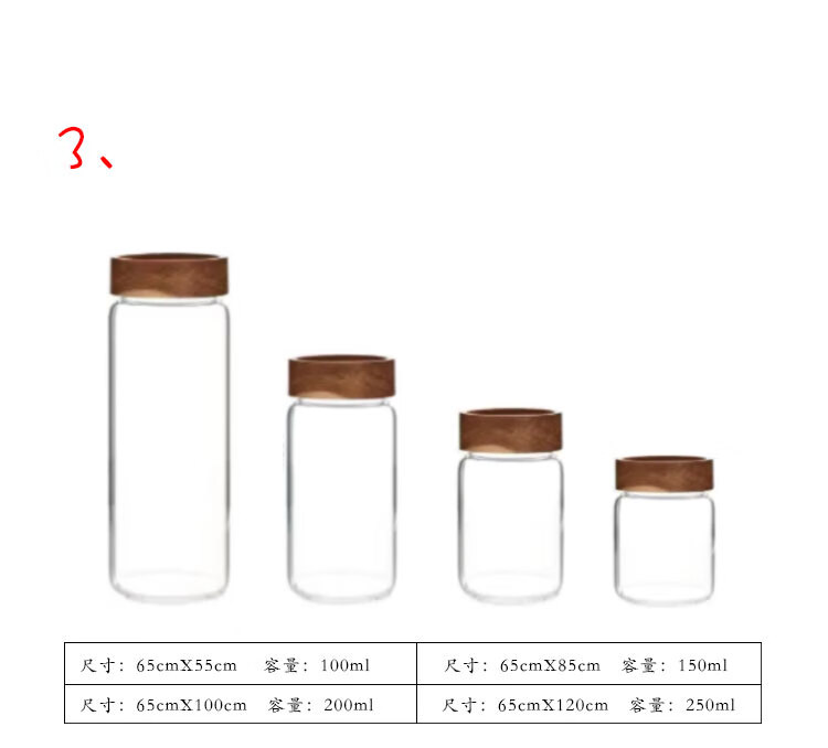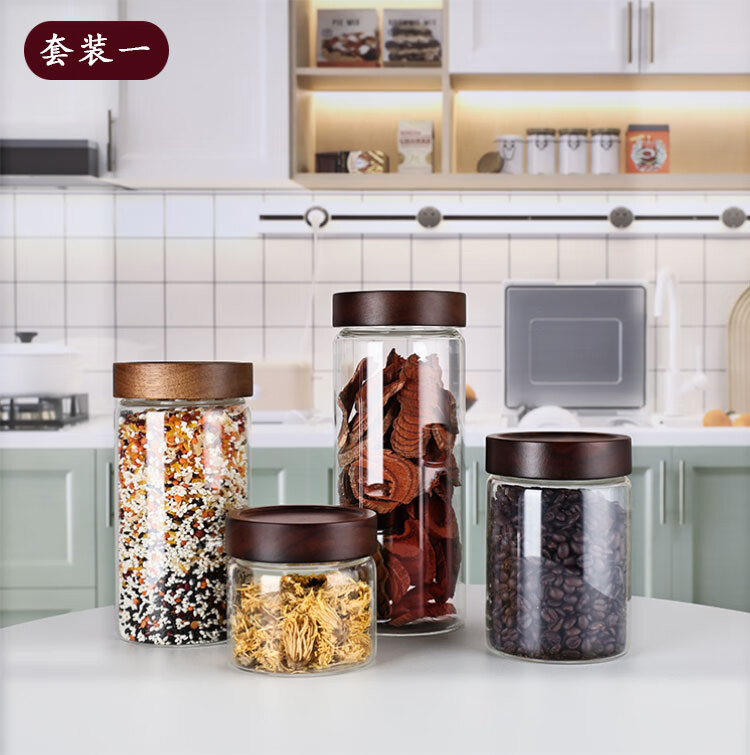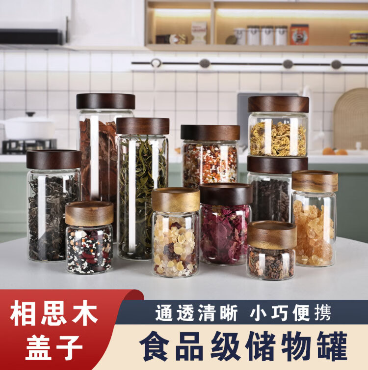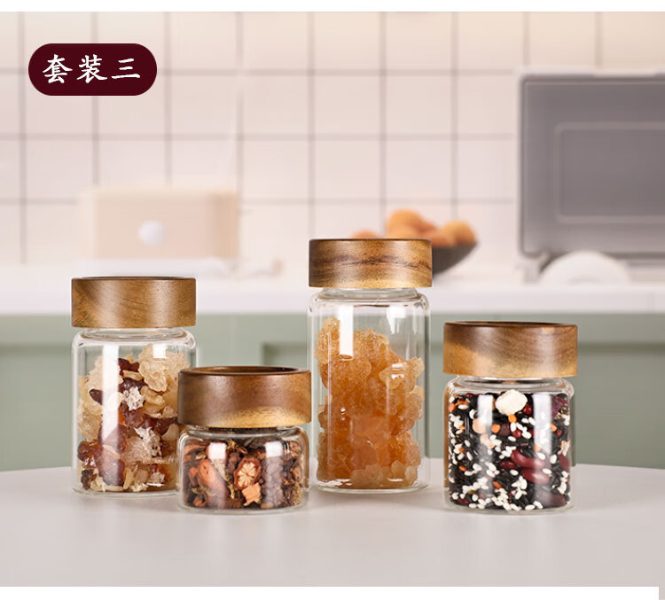 Four-star glass tea can, coffee can, acacia wood storage can, high borosilicate glass sealed can, mini portable food grade storage can, 65mm diameter, 4 pieces