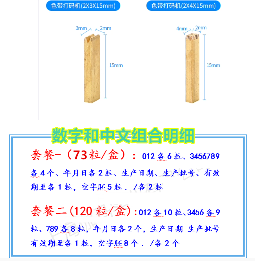 色带打码机铜字粒 2*4 *15 2*3*15 生产日期字粒 HP241B dy8 铜字 2*3*15(012各10个,3-9各6个) 官方标配