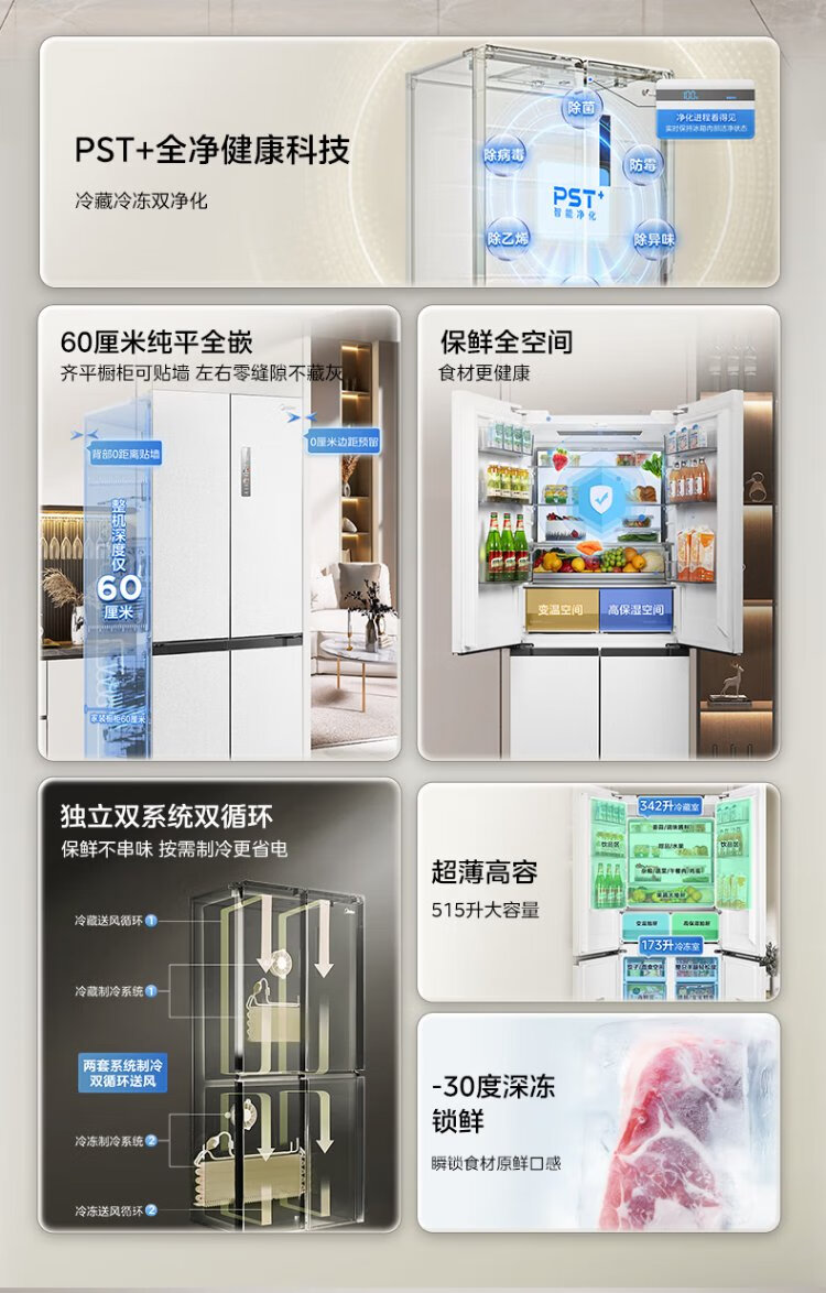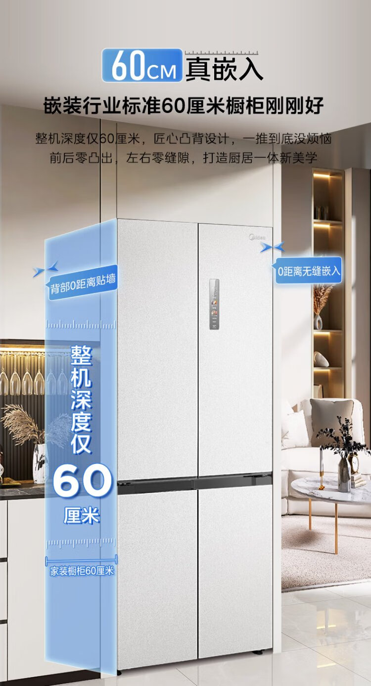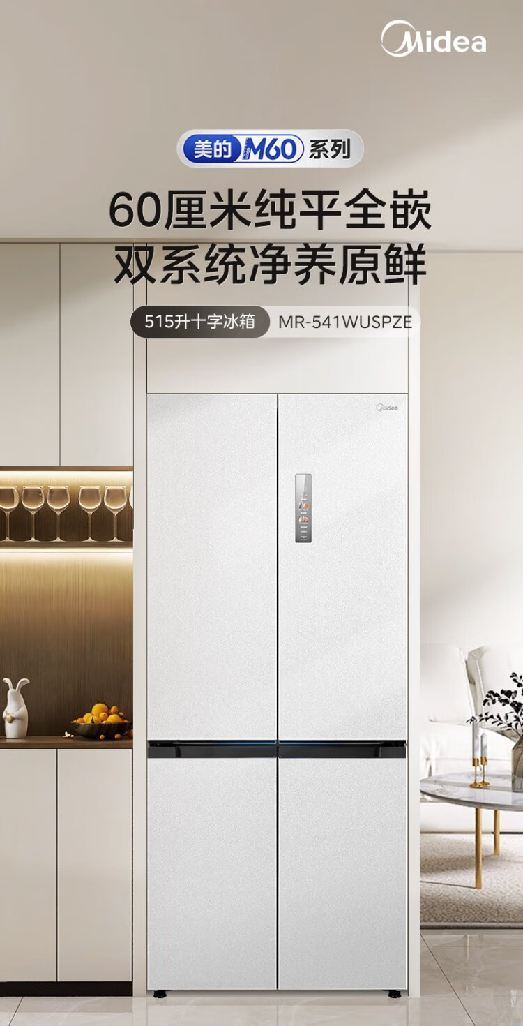 Midea M60 series 541 zero-embedded cross-door refrigerator dual-system dual-cycle bottom cooling, deodorizing, sterilizing, air-cooled, frost-free household refrigerator, national subsidy 15% MR-541WUSPZE Yunduo White