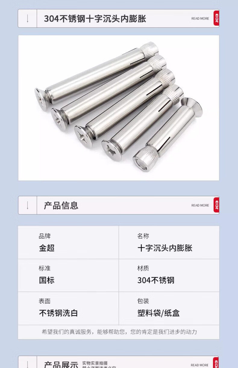 Jinchao national standard 304/201 stainless steel cross countersunk head internal expansion screw flat head bolt pull implosion MM6M8M10M12 M6*90 (2 pieces) national standard 304