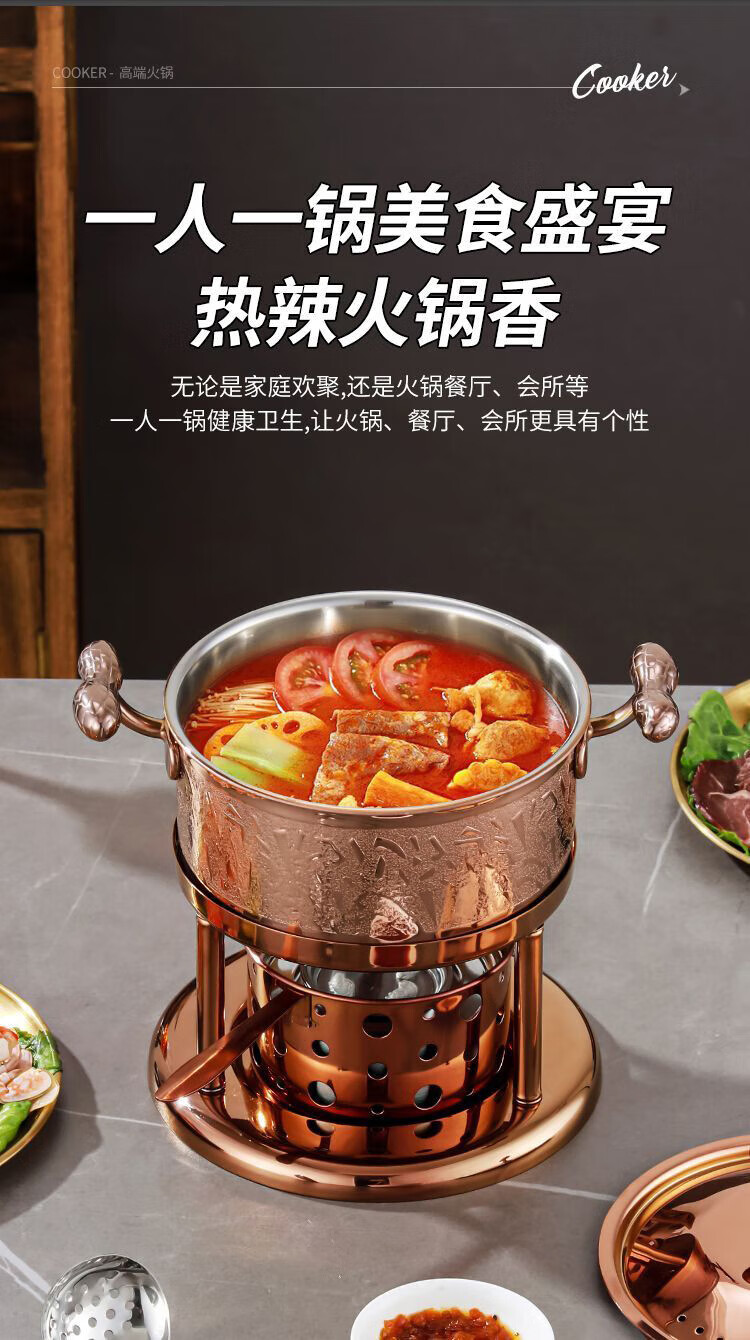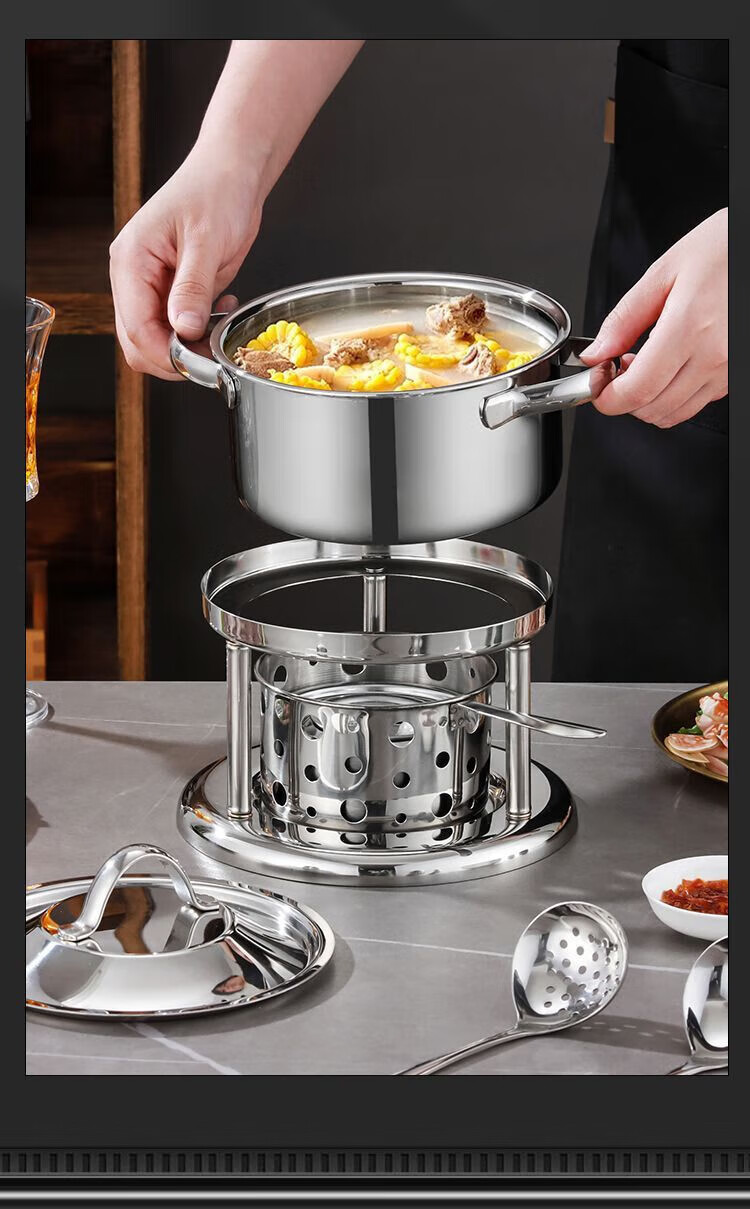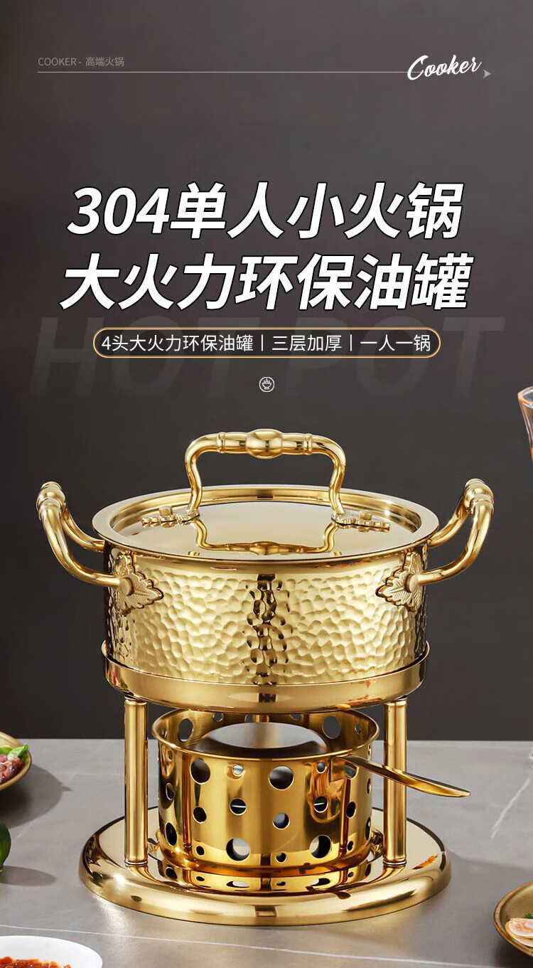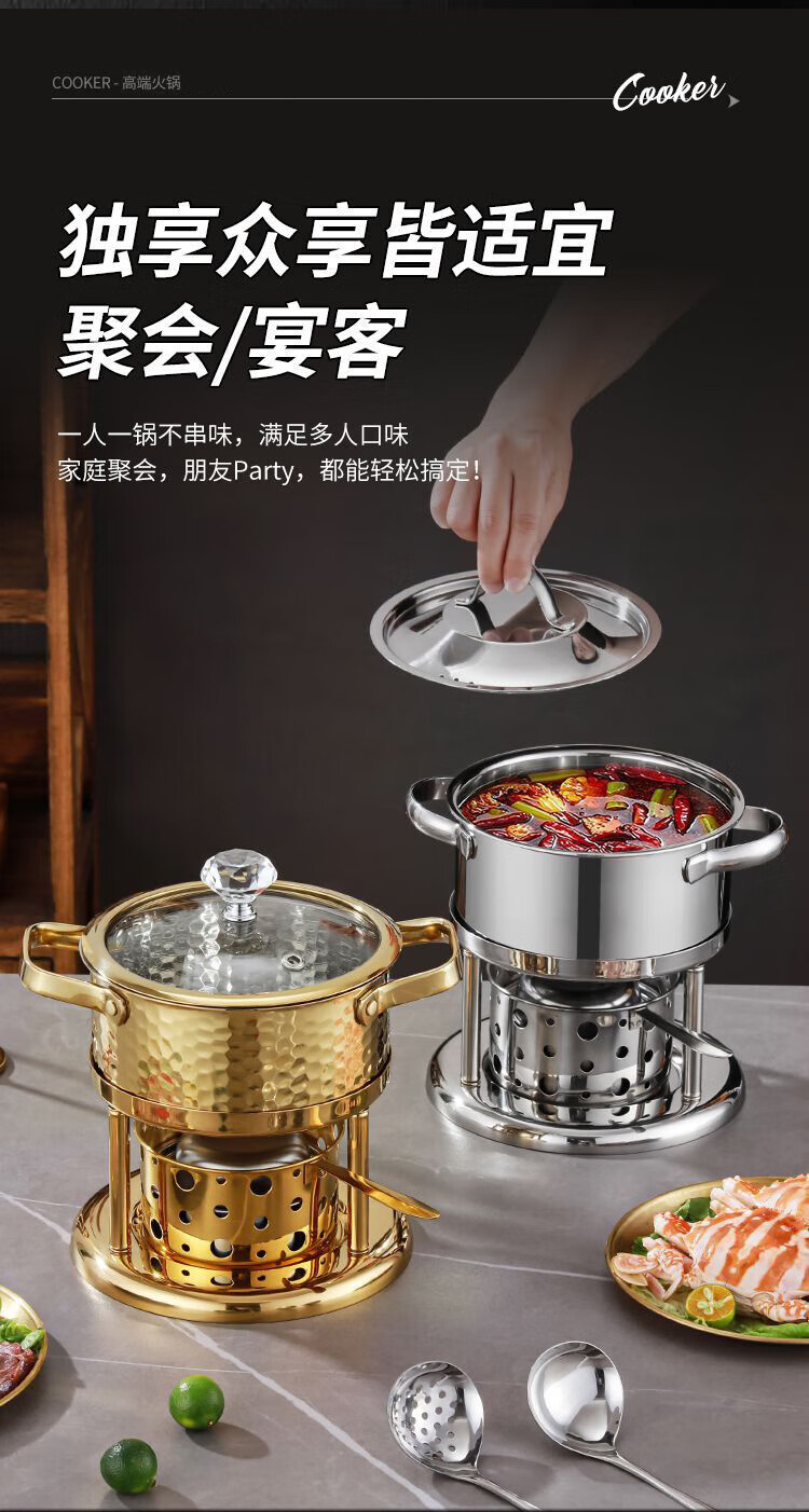 Guo Xiake single-person small hot pot 304 stainless steel alcohol stove hot pot, one person, one pot, commercial pot self-service hot pot, portable, silver Swiss pot steel lid - equipped with 4 environmentally friendly oil tanks 16cm