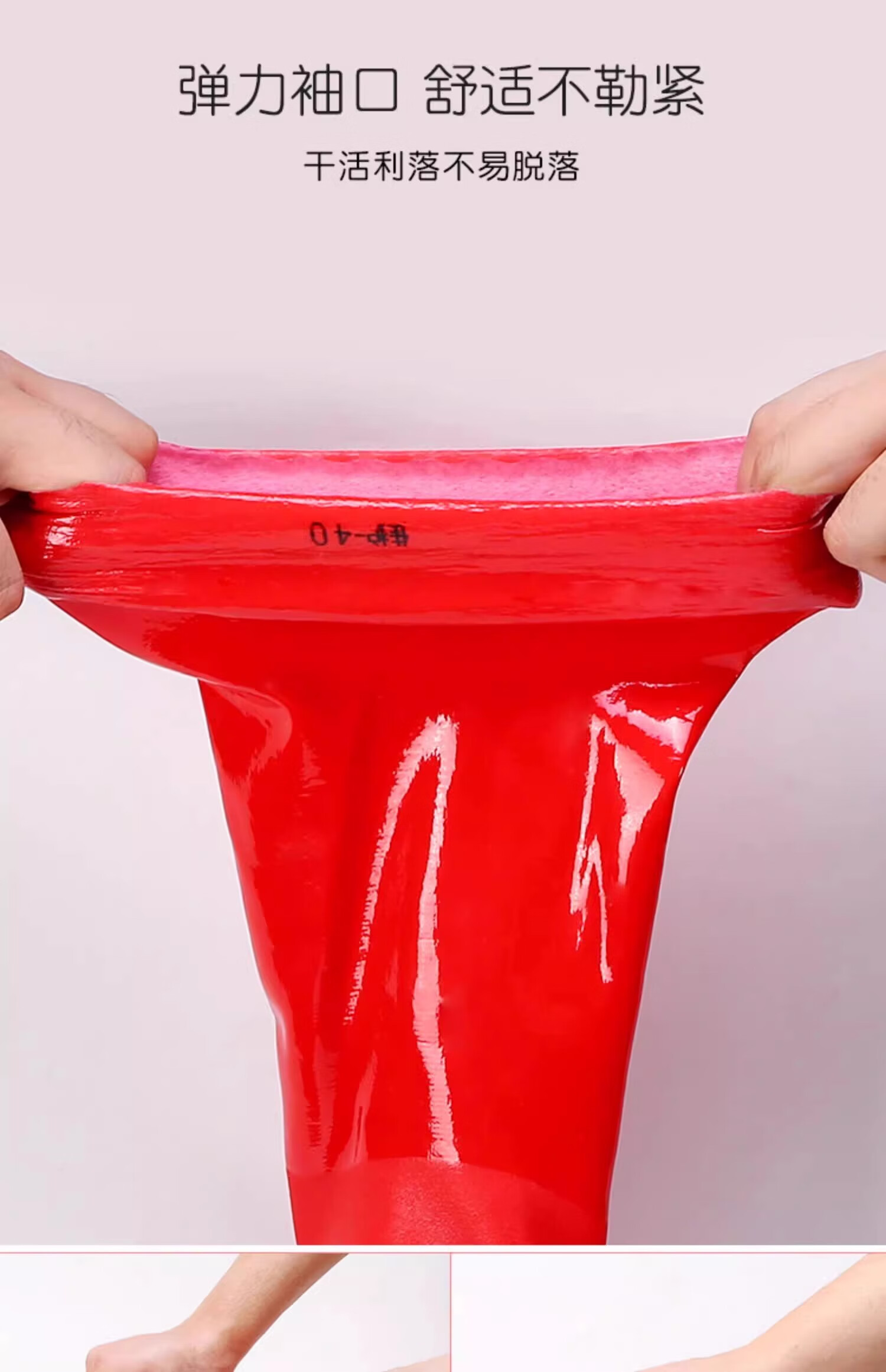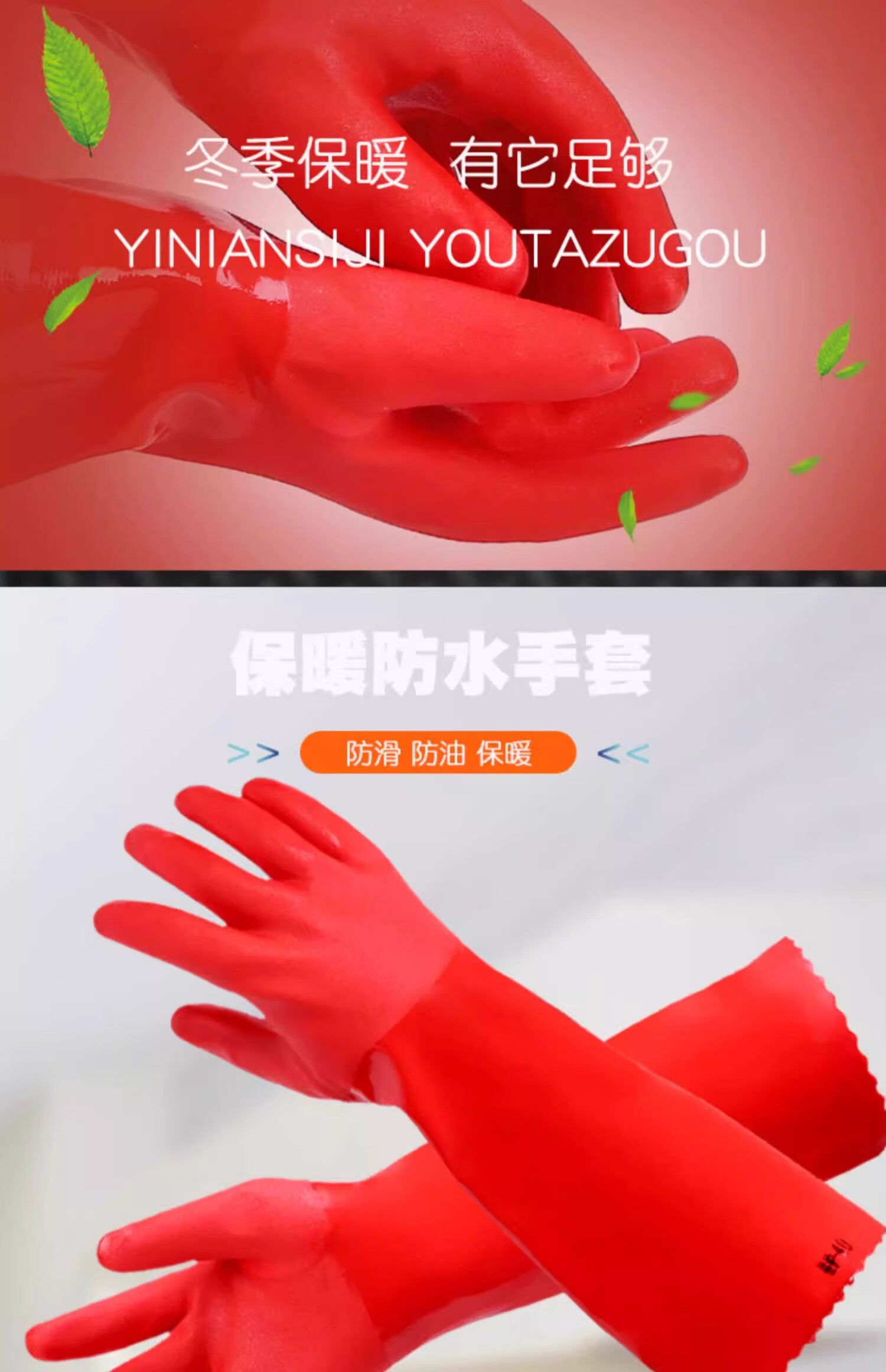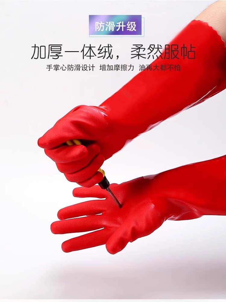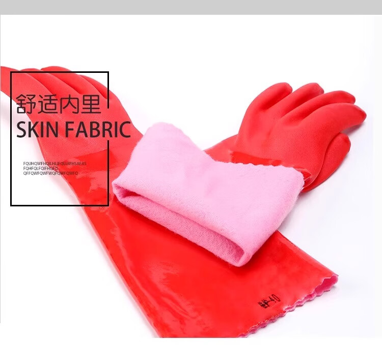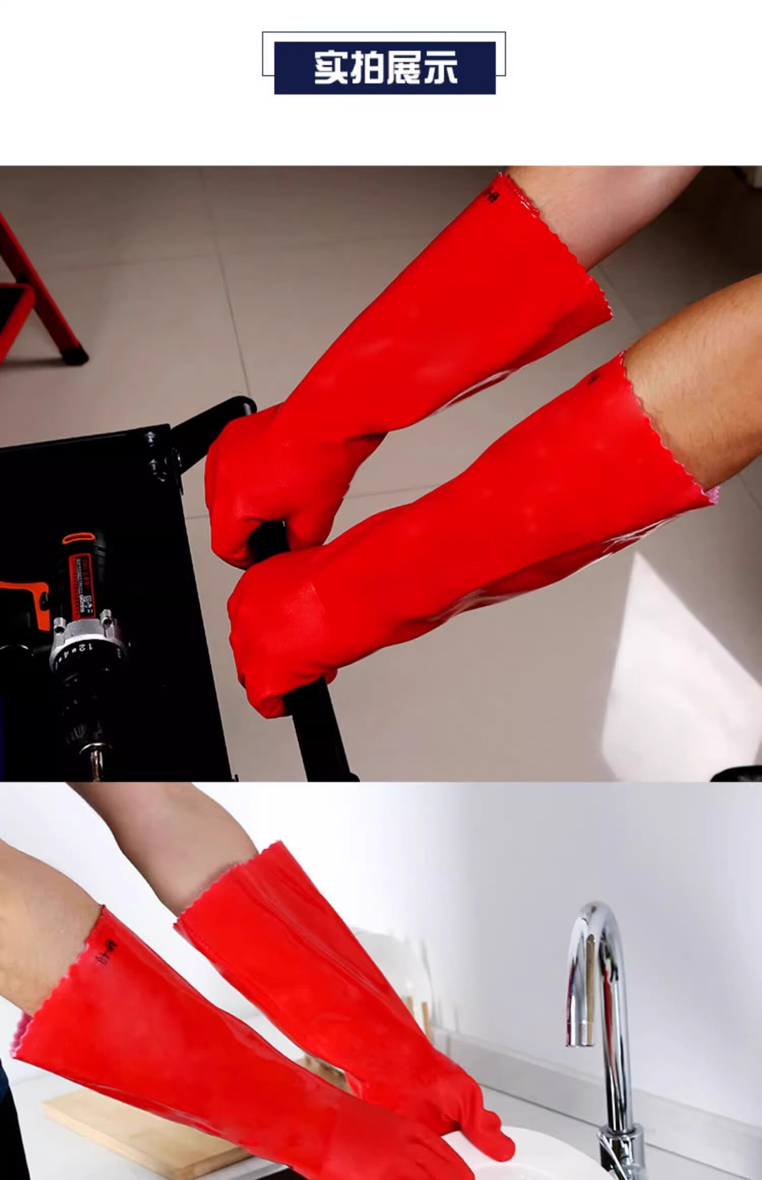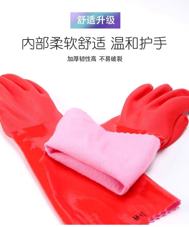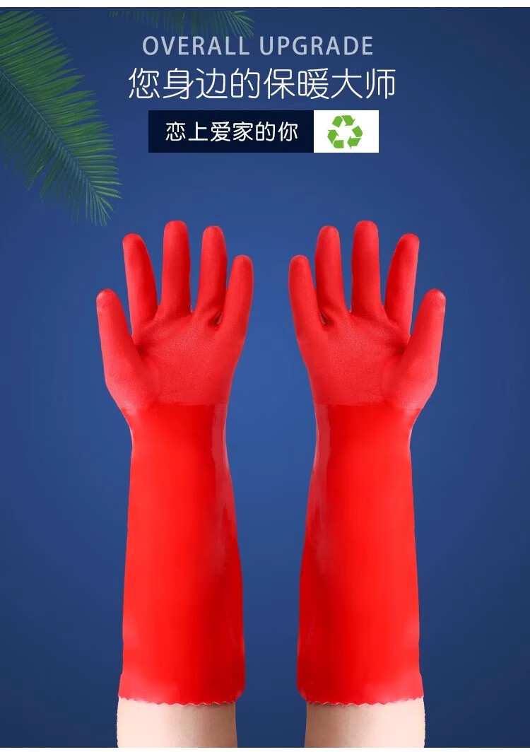 Dishwashing gloves, housework, kitchen, durable, velvet, thickened rubber, women's rubber, waterproof, extended rubber, washing clothes and washing dishes, red one-piece velvet (40cm), 1 pair, one size fits all