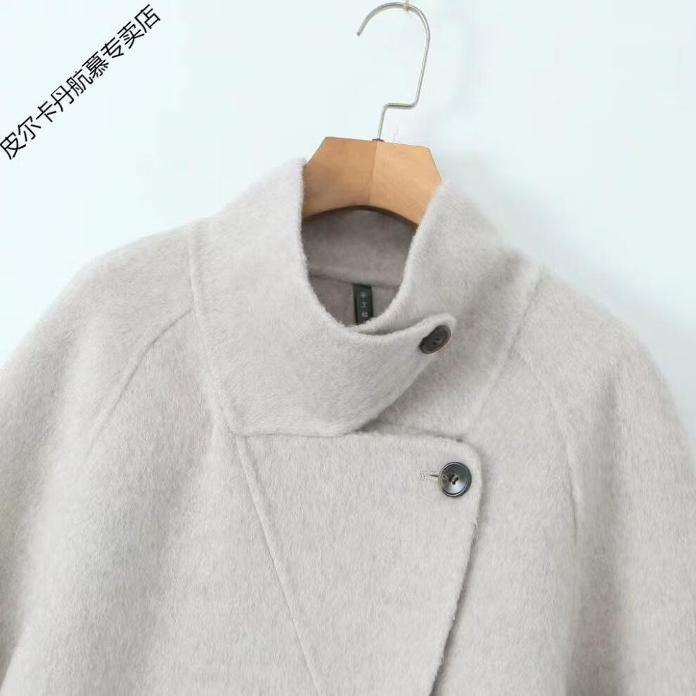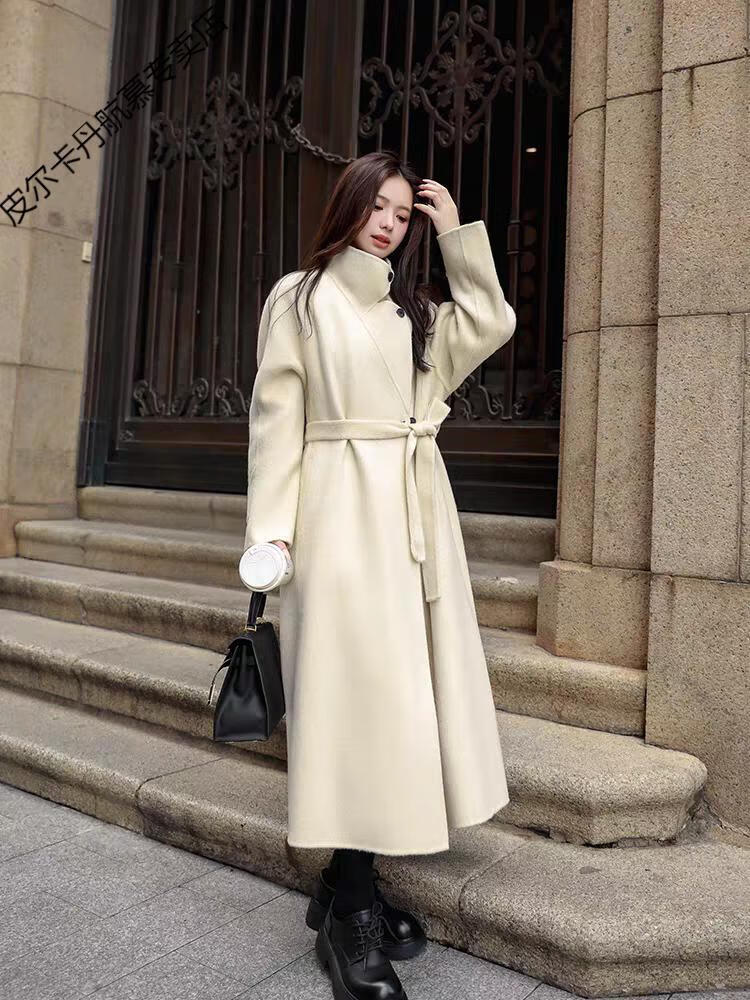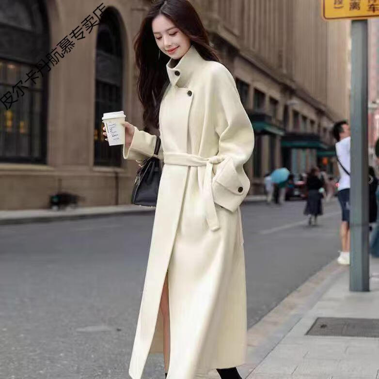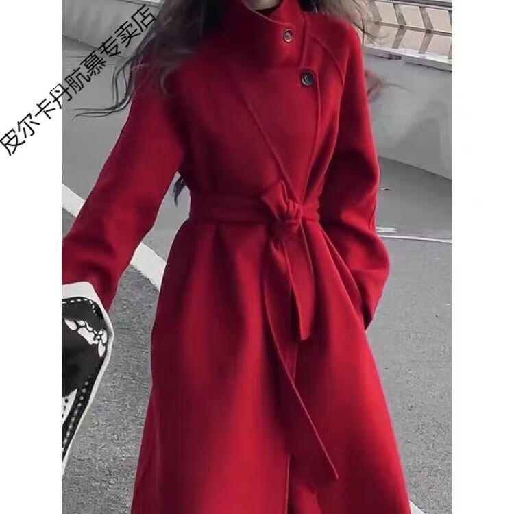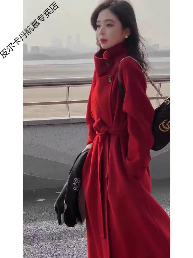 Pierre Cardin thickened wool new cashmere autumn and winter coat long stand-up collar double-sided New Year woolen jersey coat Angora red M