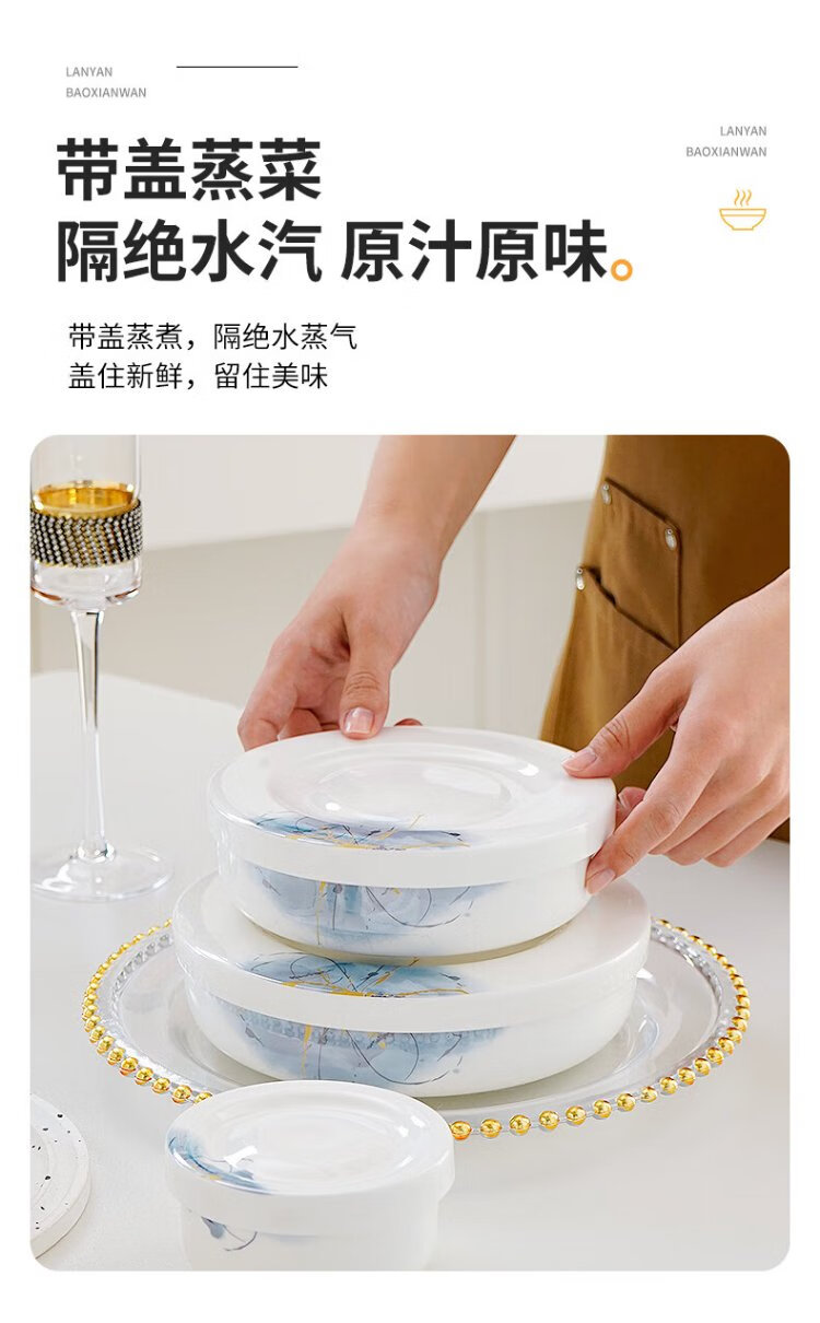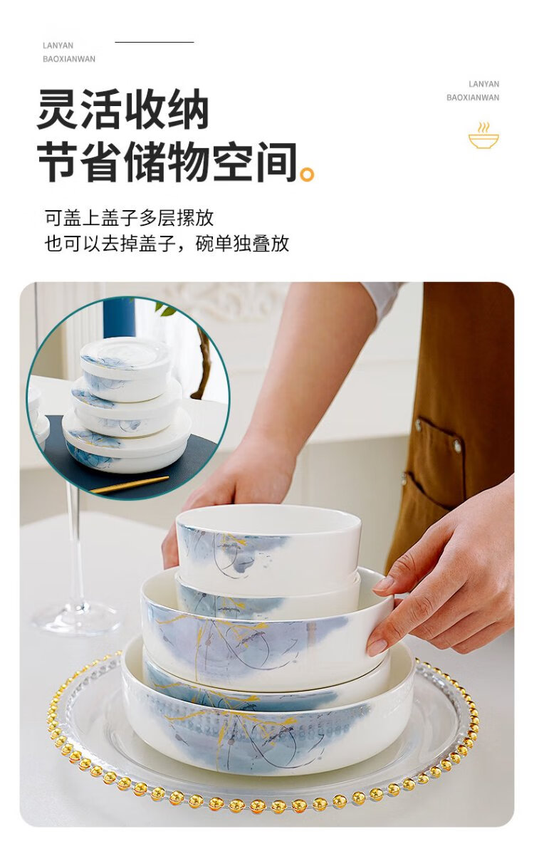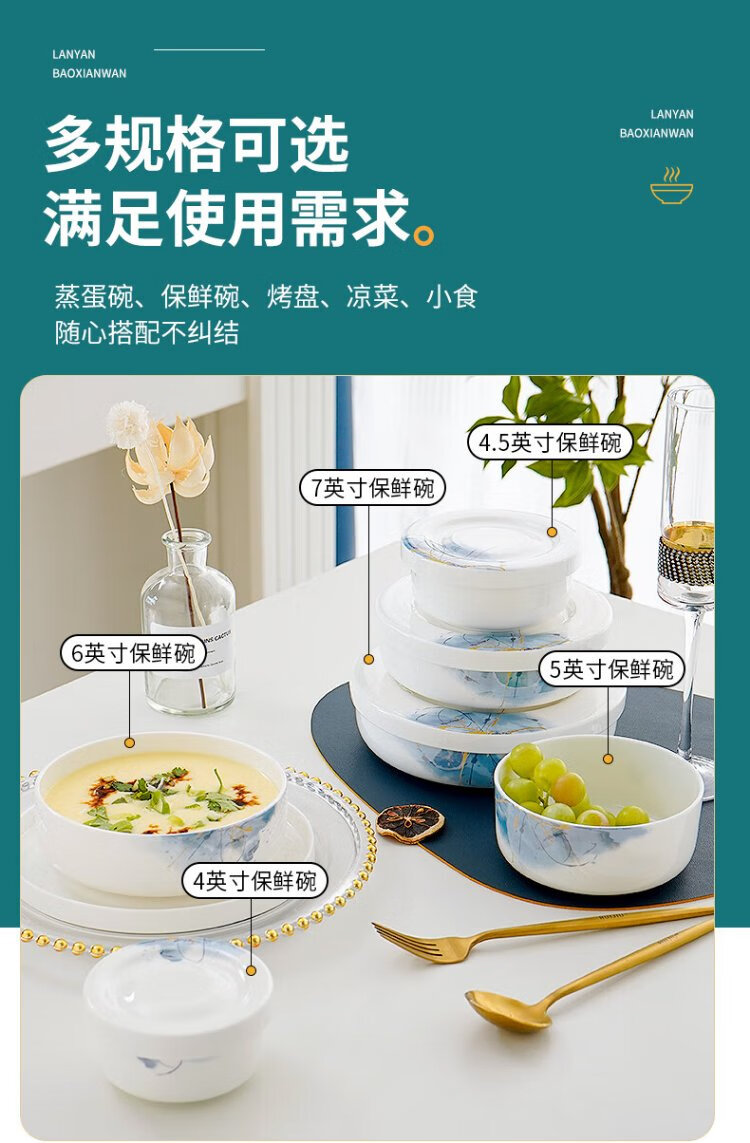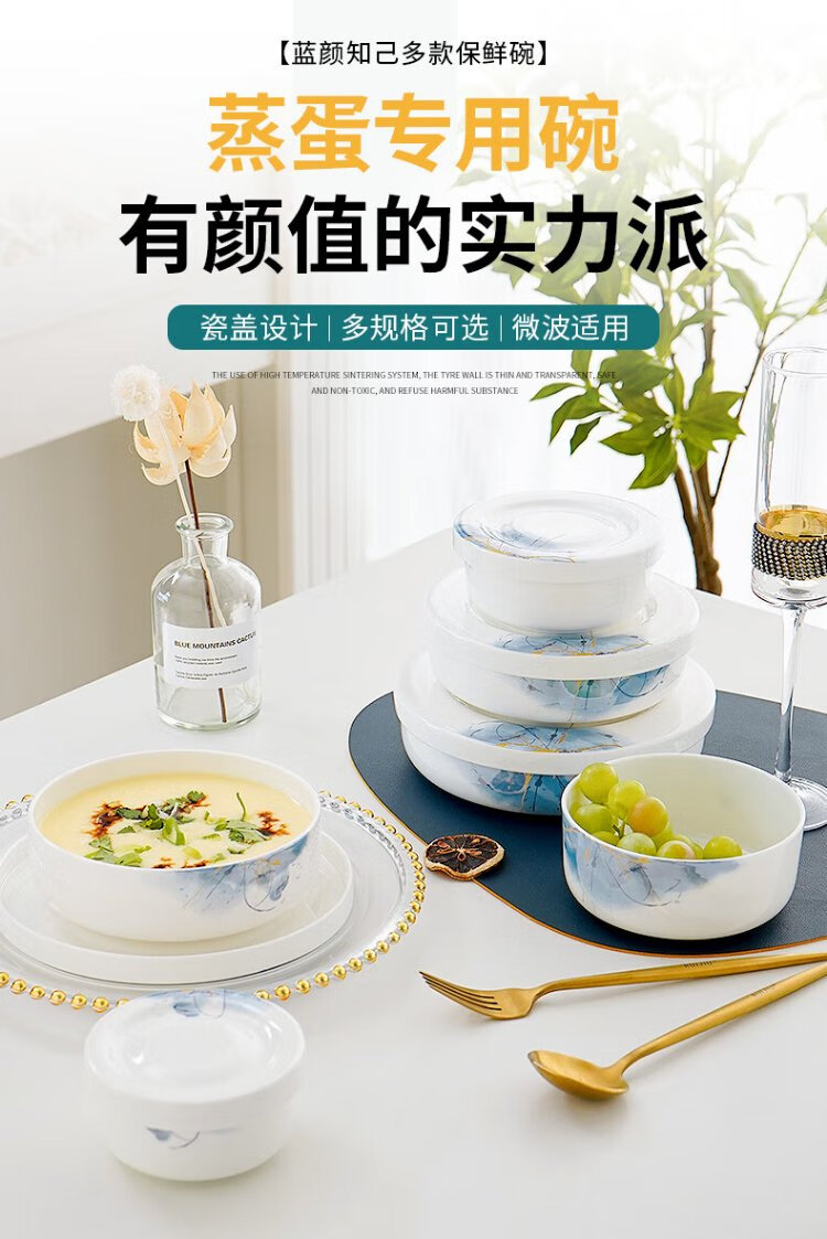 Pinjude light luxury bone china bowl with lid for preservation, steamed egg bowl, household water-proof stew bowl, ceramic microwave instant noodle bowl, lunch box, soup bowl, Lanyan 4-inch preservation bowl with lid