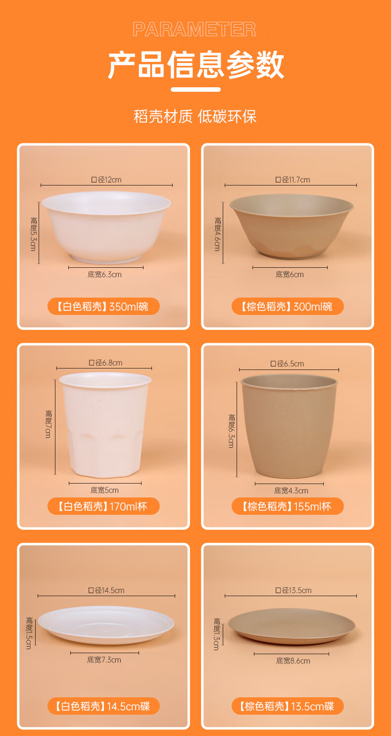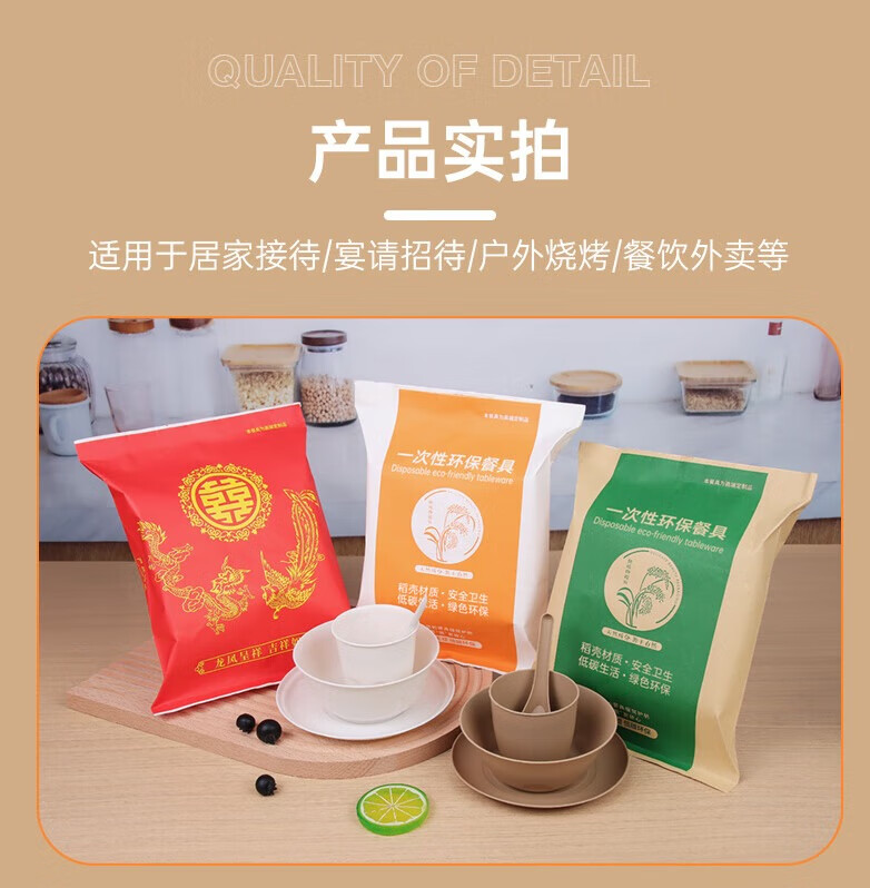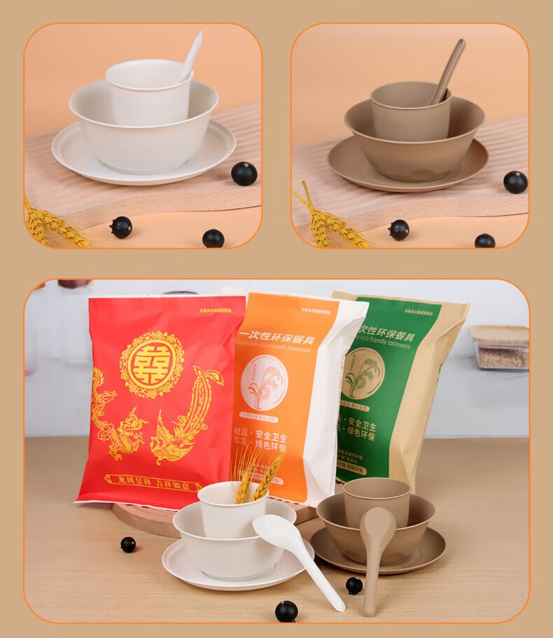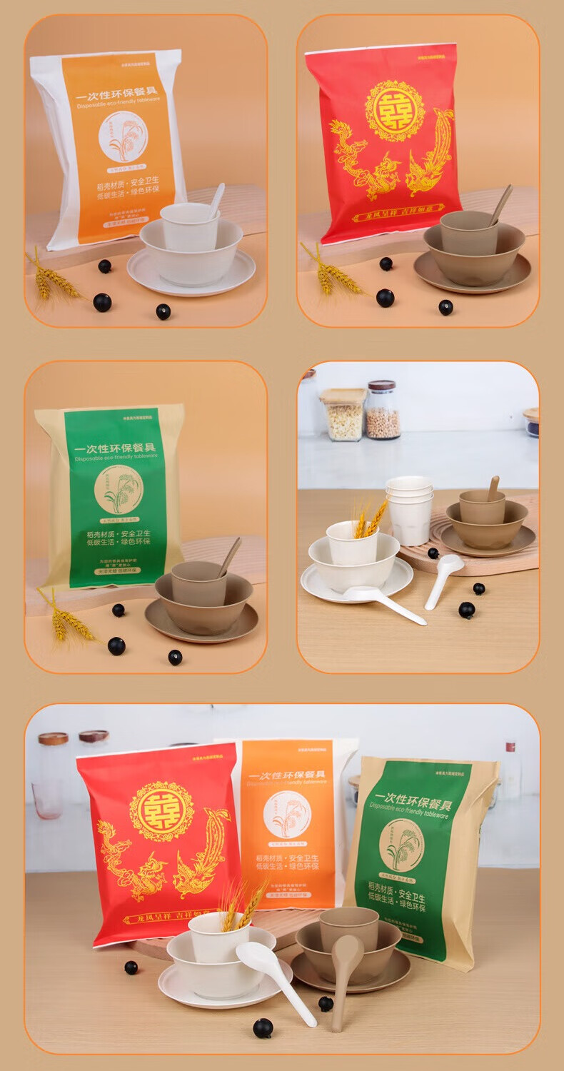 Chulu disposable rice husk tableware four-piece set Kraft paper packaging commercial cups, bowls, spoons and plates four-piece set for barbecue parties Blue and white porcelain chopsticks individually packed 10 pairs