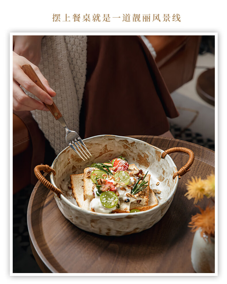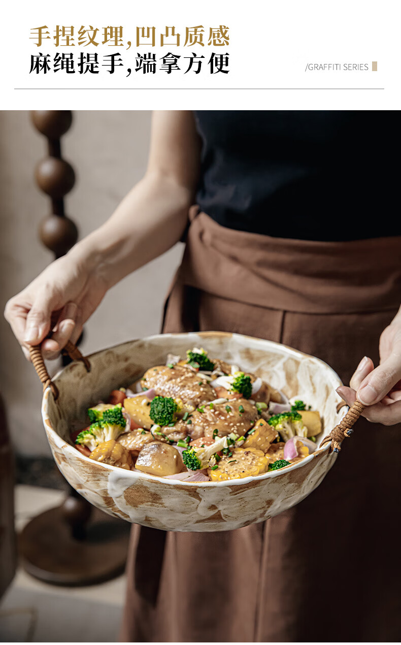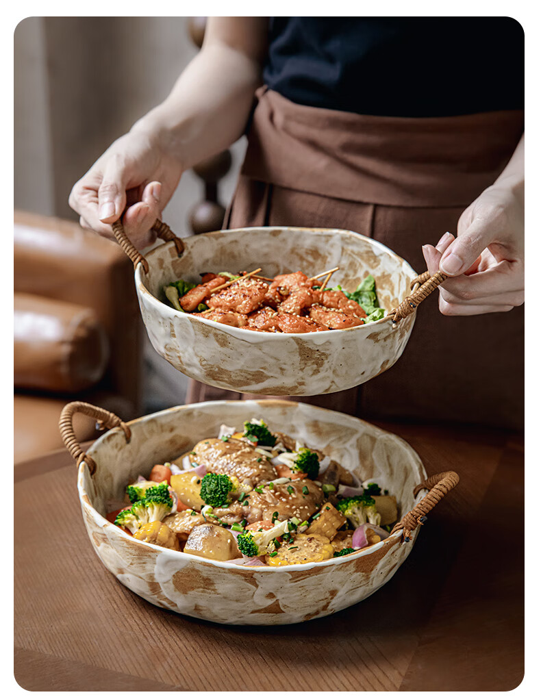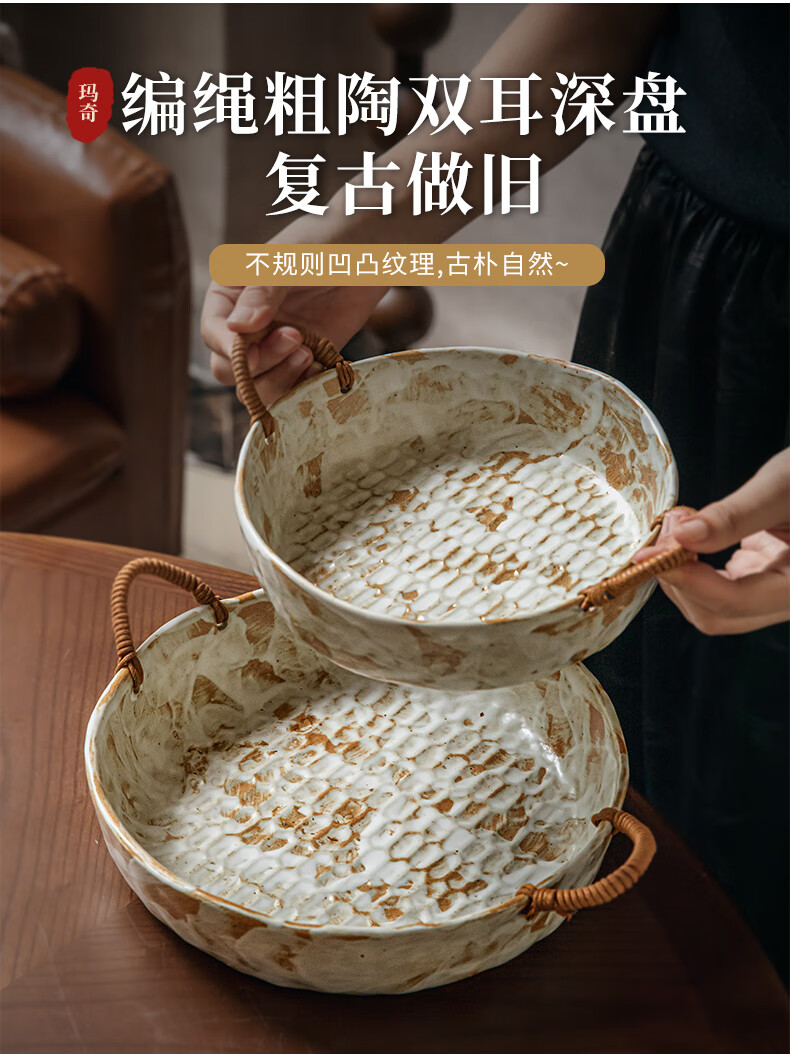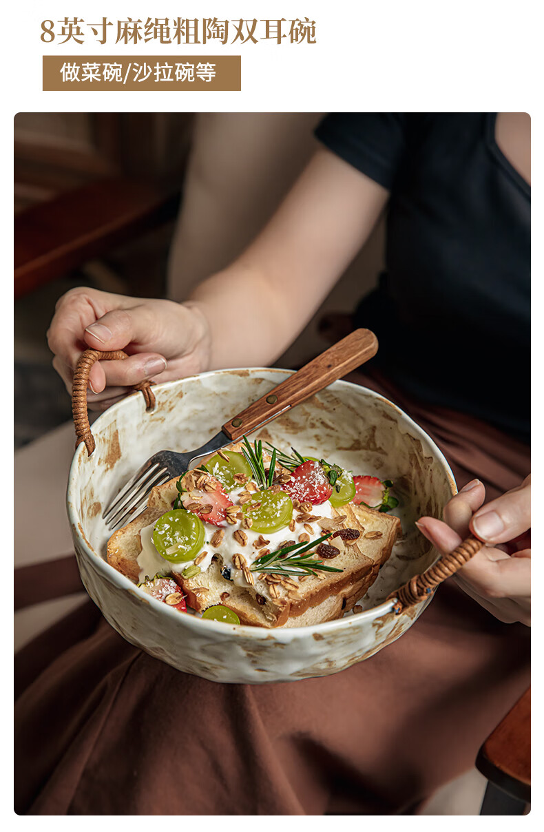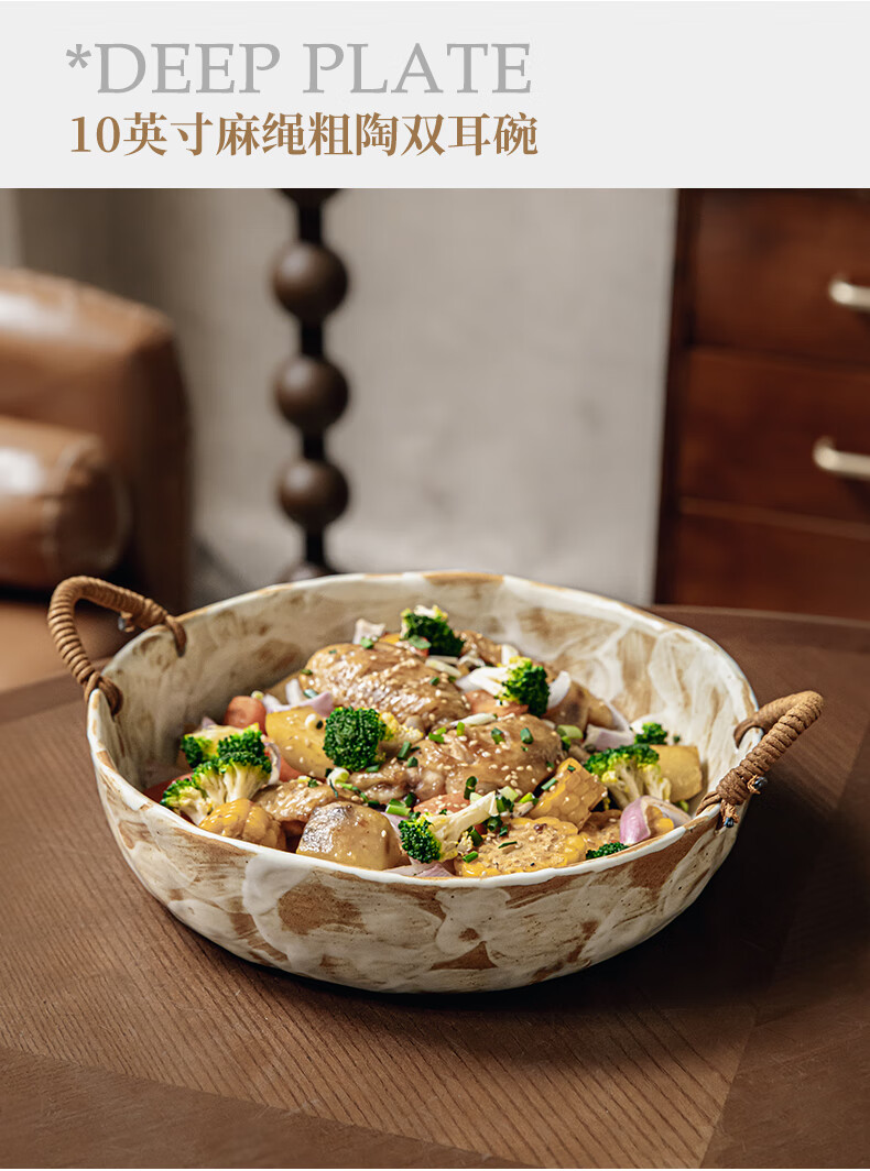 Youcci Nostalgic Handmade Stoneware Characteristic Hemp Rope Double-Eared Bowl, Retro Ceramic Bowl, New Home Bowl, Good-looking Fruit Bowl, Machi-10 Inch Hemp Rope Stoneware Double-Eared Bowl