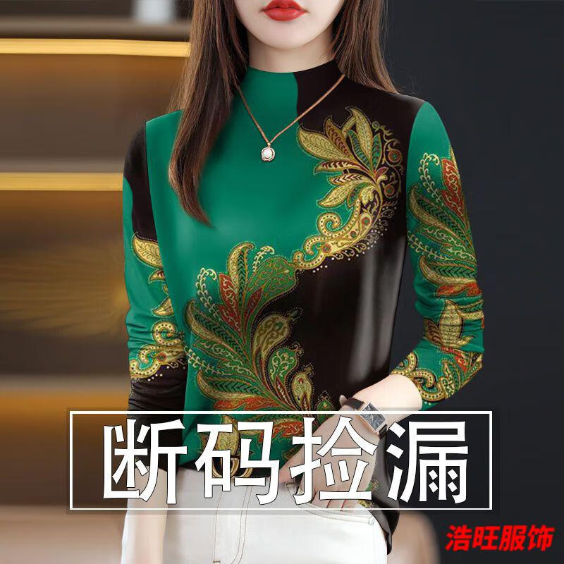 Mouth-turning mother women's spring and autumn long-sleeved half-high collar bottoming shirt 2024 new printed belly-covering T-shirt women's top 21185 Feather Green-half-high/collar length/sleeve top XL recommended 110-125 pounds