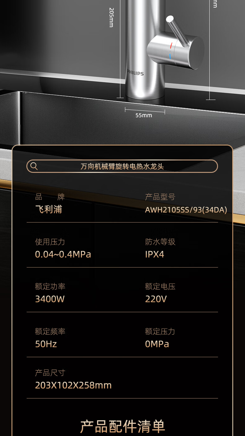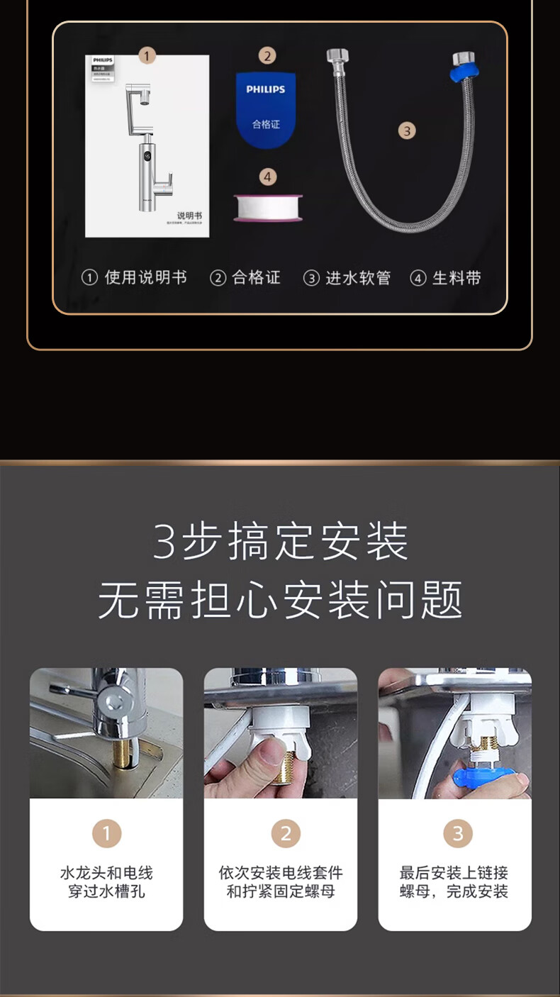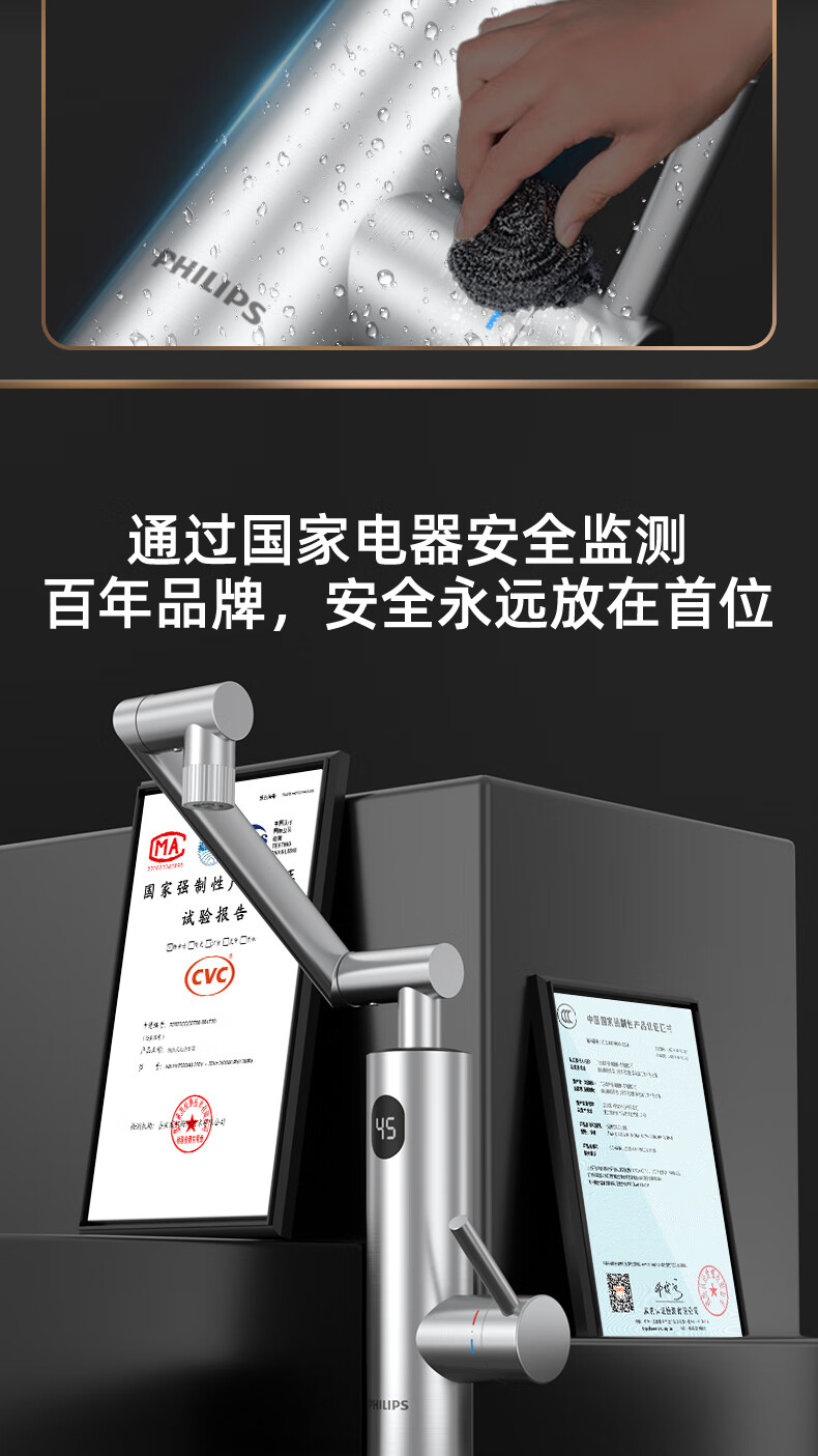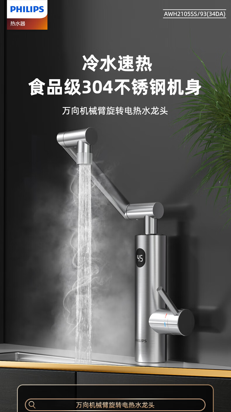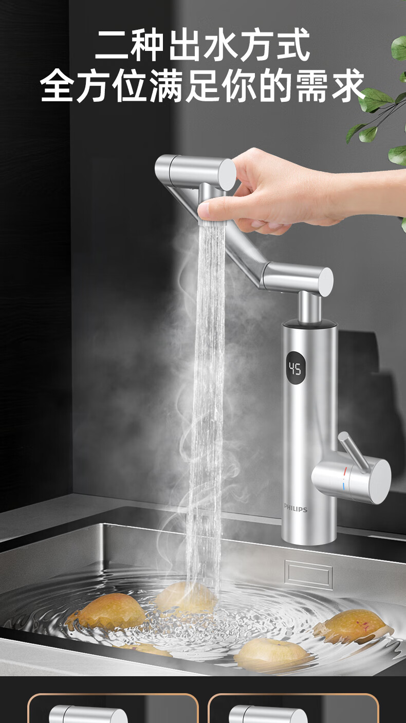 Philips instant electric hot water faucet mechanical arm fast heating frequency conversion constant temperature stainless steel hot and cold kitchen bathroom household screen display electric water heater small kitchen treasure bag installation 2105 stainless steel body mechanical arm