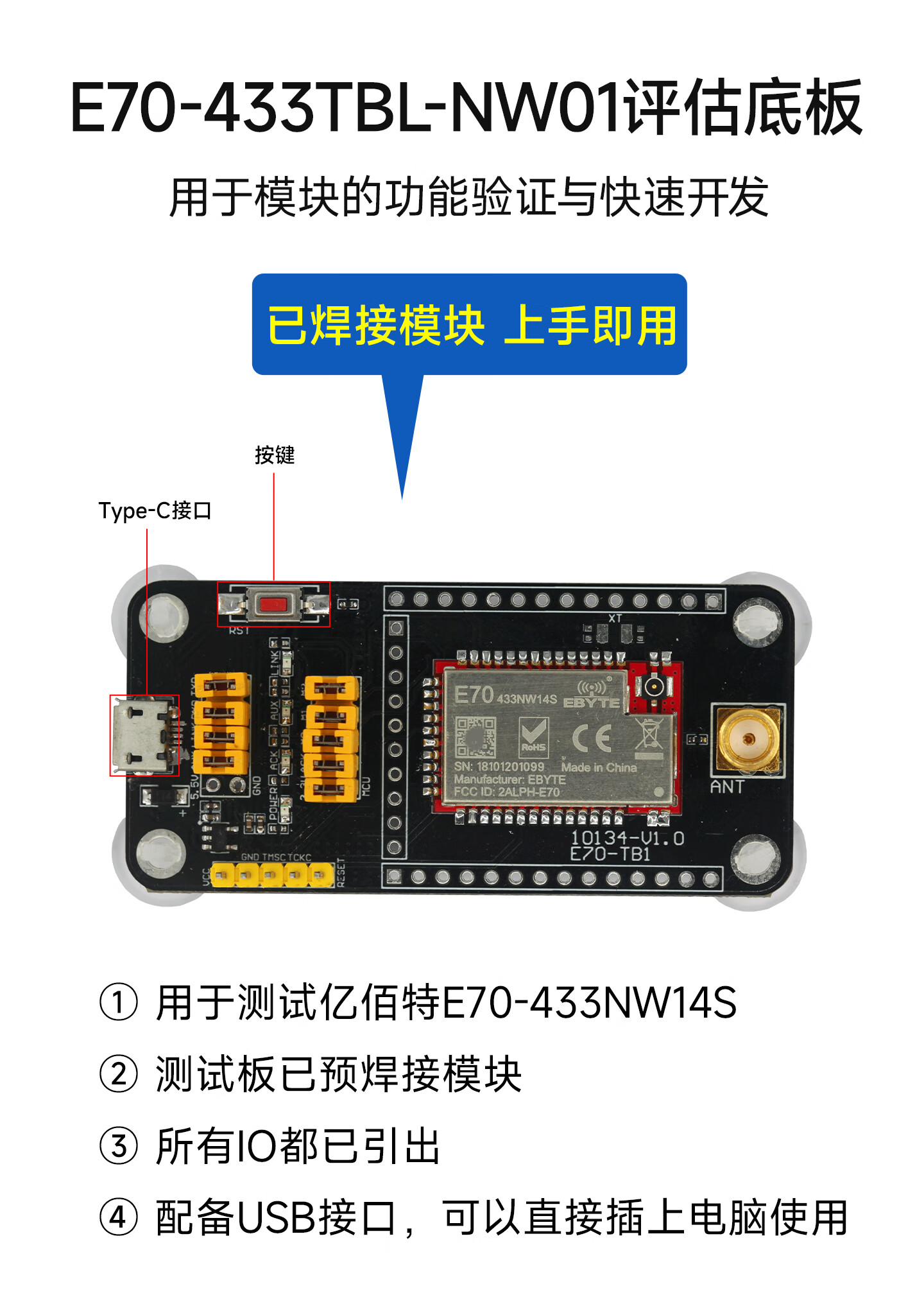 Ebyte 433M self-organizing network wireless transceiver module SX1278 data transmission MESH 200 bytes spread spectrum anti-interference E70-915NW30S | Equipped with glue stick C antenna