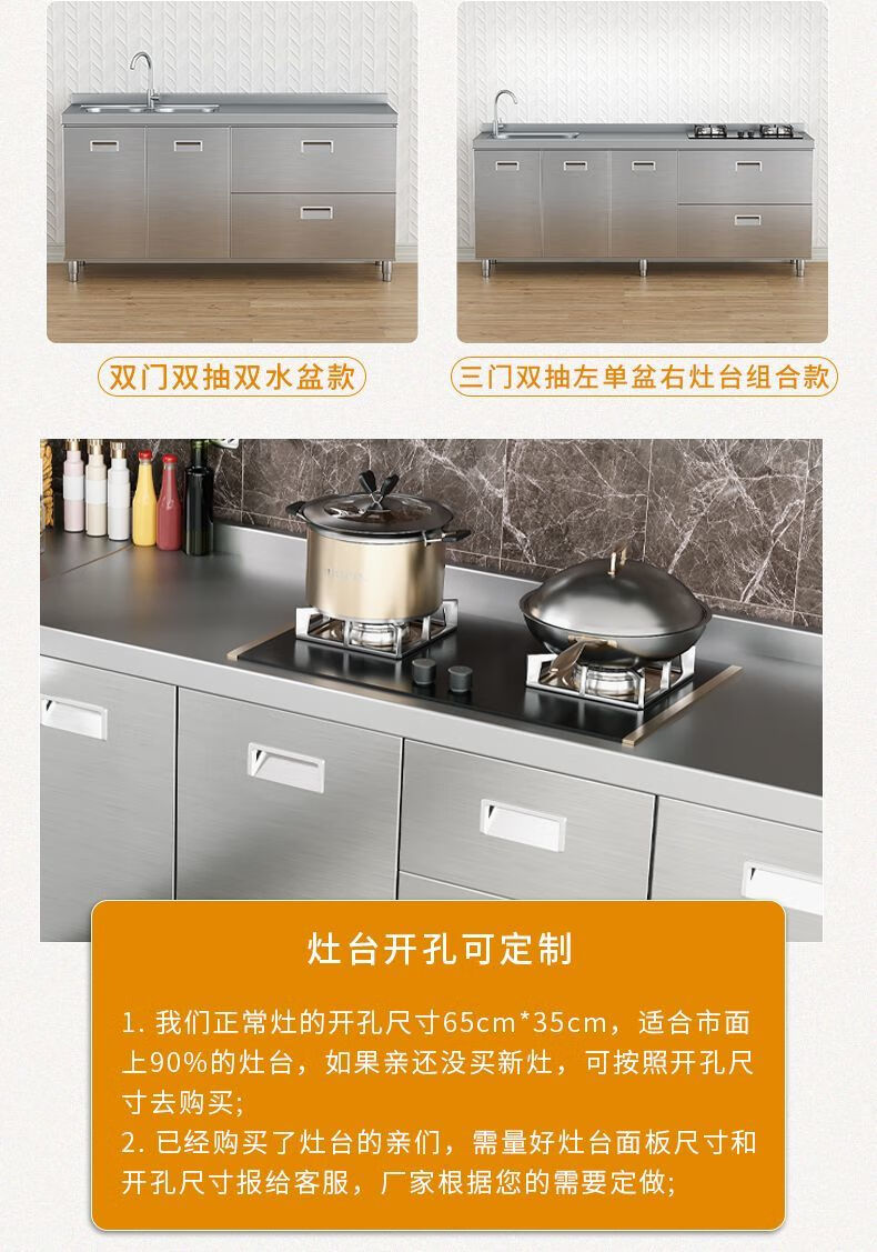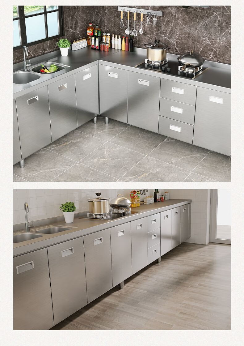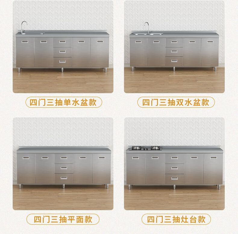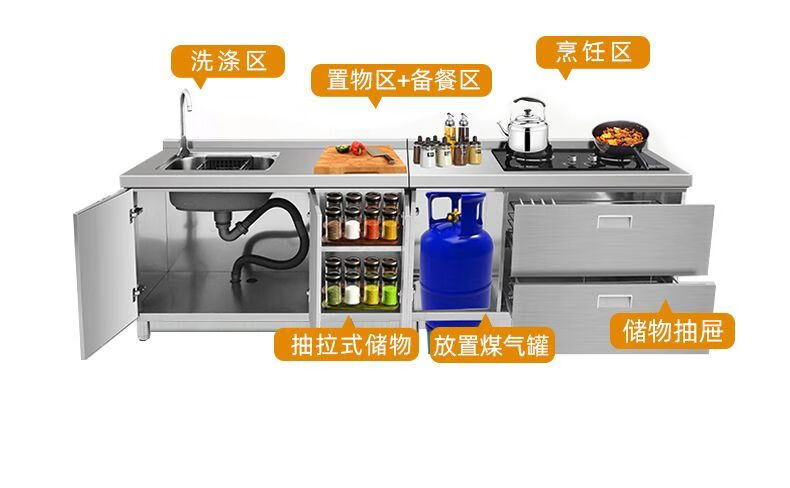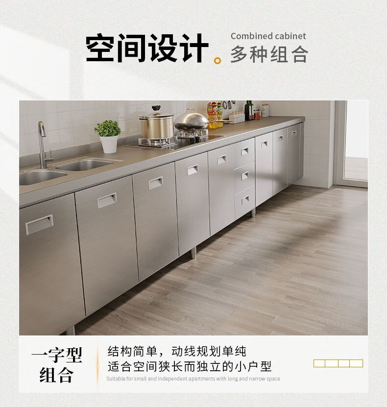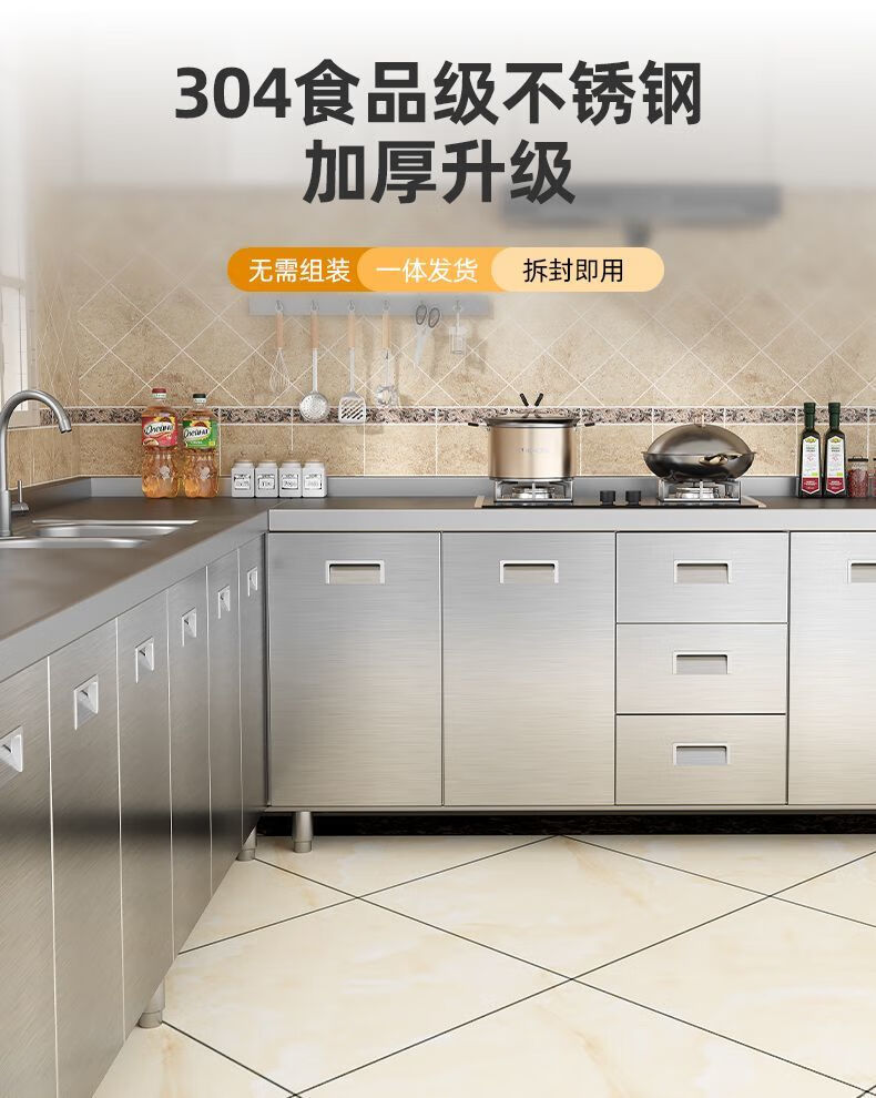 Qinkai overall stainless steel cabinet 304 steel diamond-shaped corner cabinet kitchen cabinet storage integrated sink stove cabinet 2 meters five-door flat style (304 steel thickening) Jinri