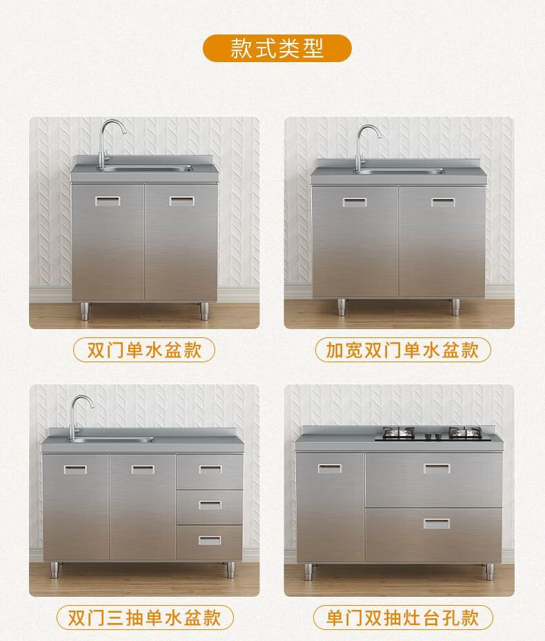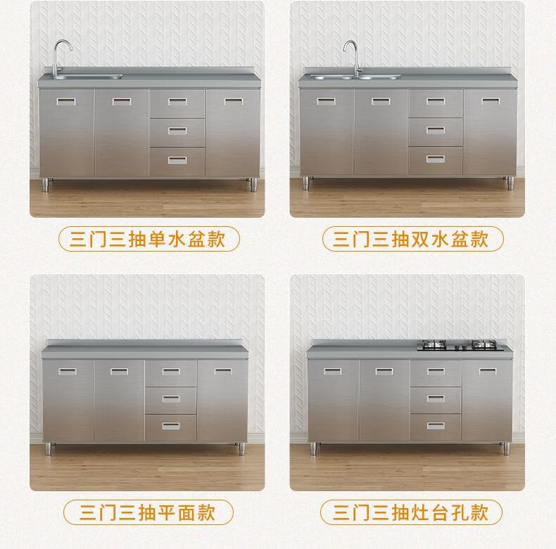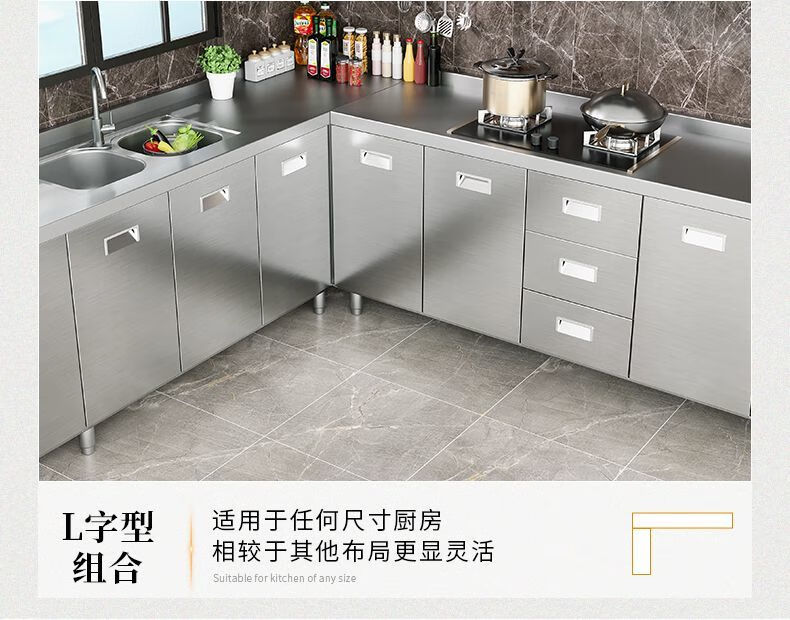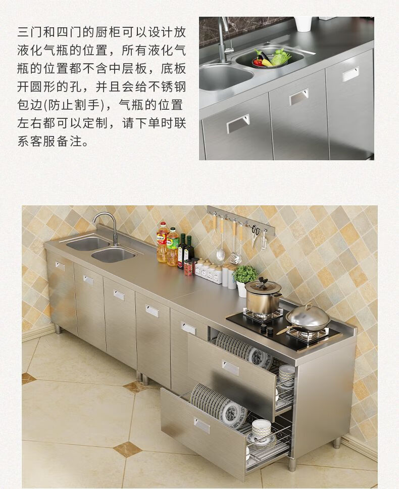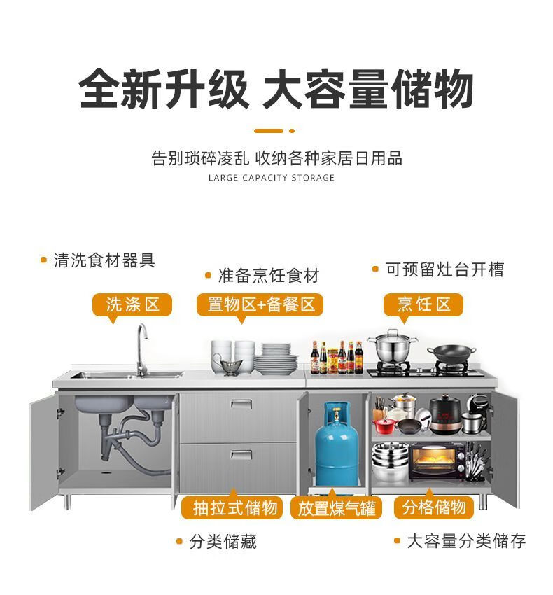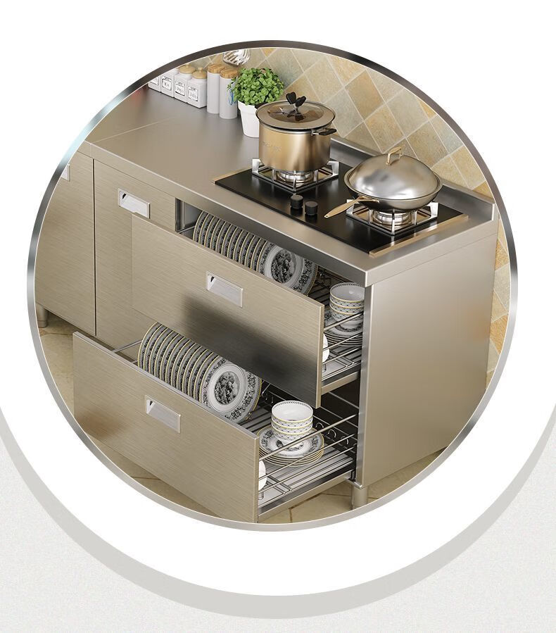 Qinkai overall stainless steel cabinet 304 steel diamond-shaped corner cabinet kitchen cabinet storage integrated sink stove cabinet 2 meters five-door flat style (304 steel thickening) Jinri