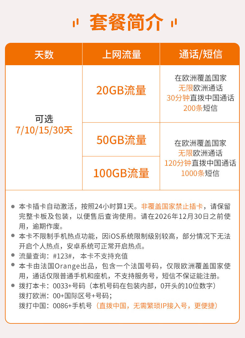 Orange European calling card 5/4G high-speed data mobile Internet France Spain Germany Italy Switzerland 10 days 100GB data (120 minutes of calls)