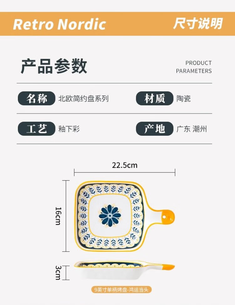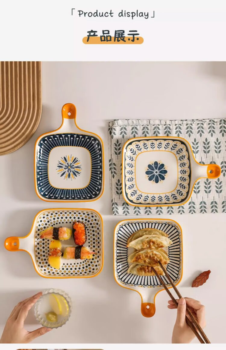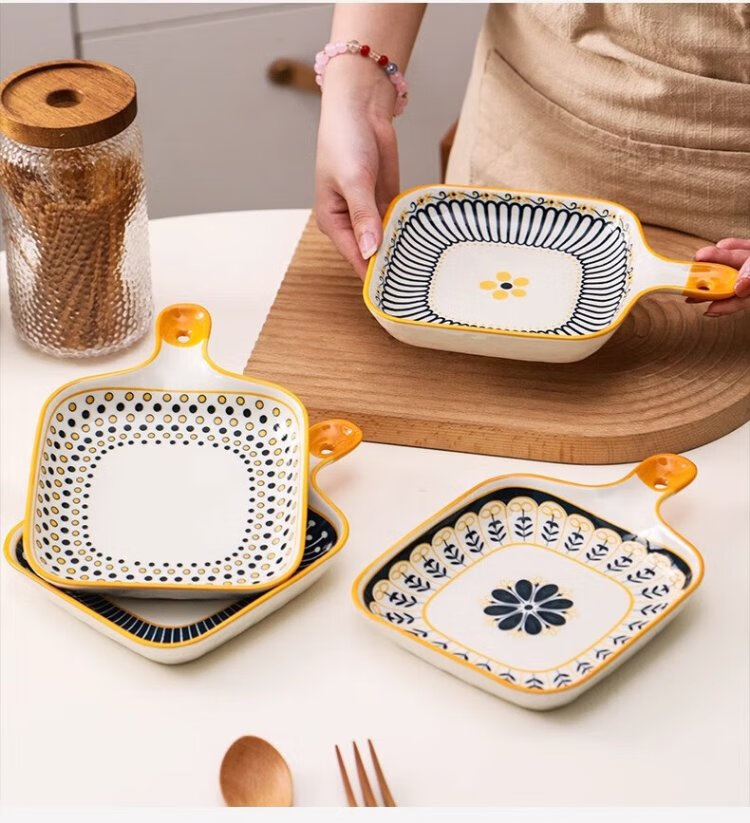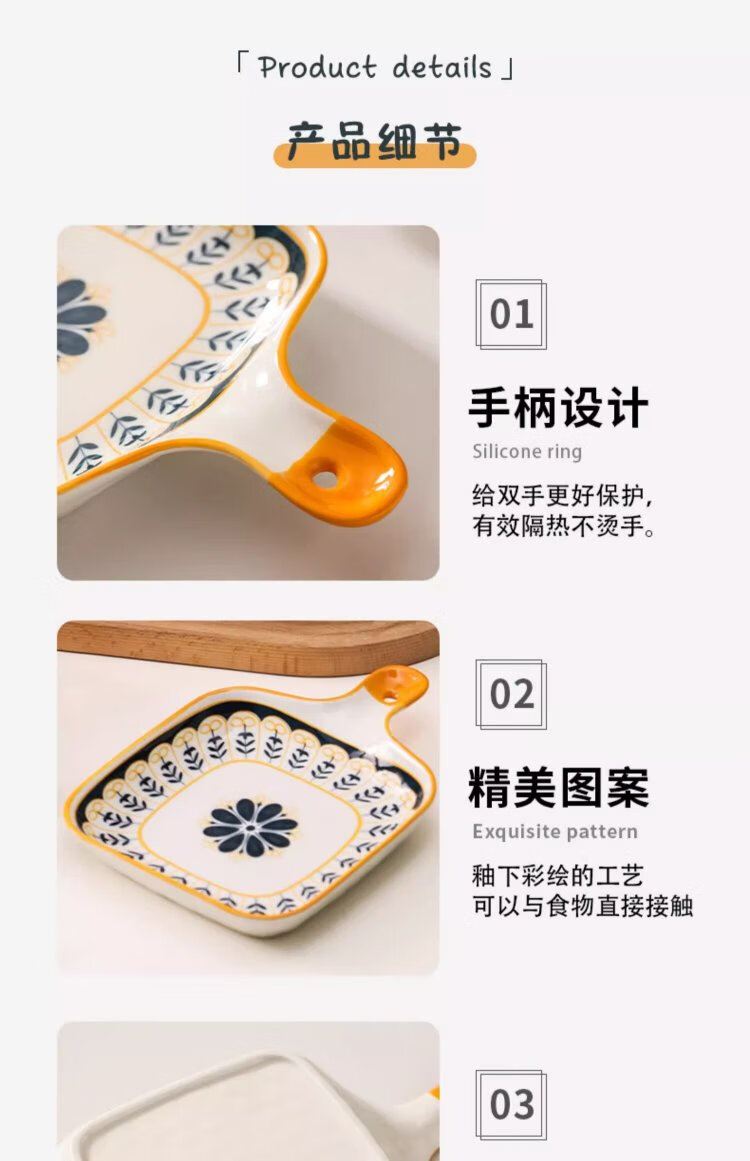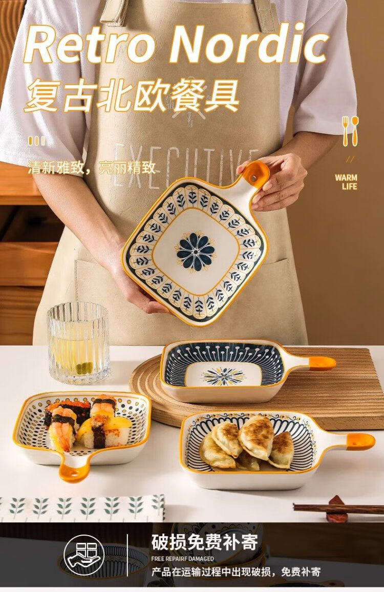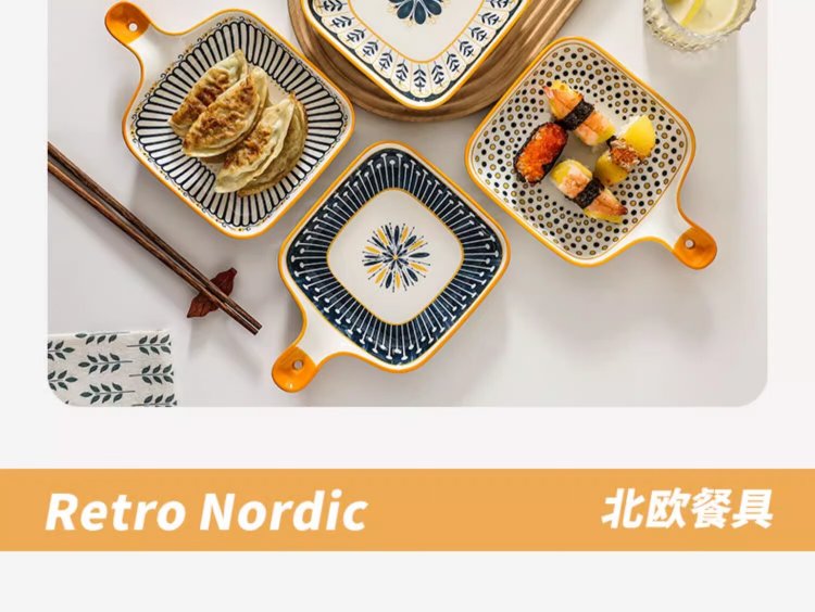 Persson Nordic plate dish household ceramic snack bowl dish tableware oven handle baking pan creative dumpling plate breakfast plate 9-inch handle plate-Hongyun Dangtou