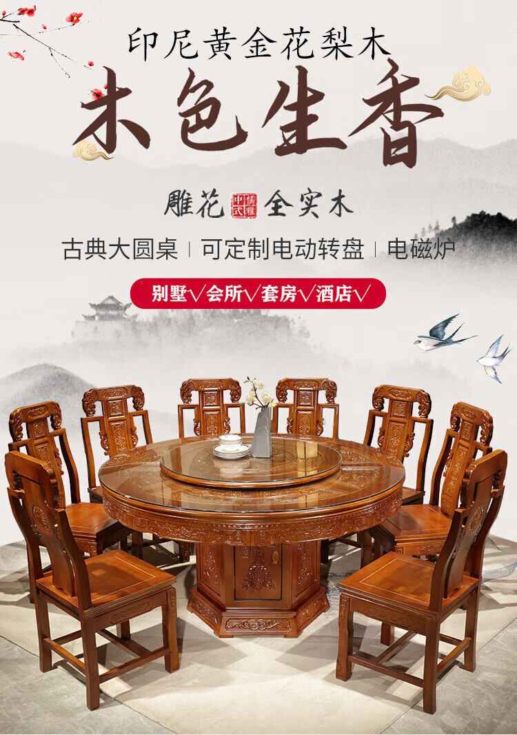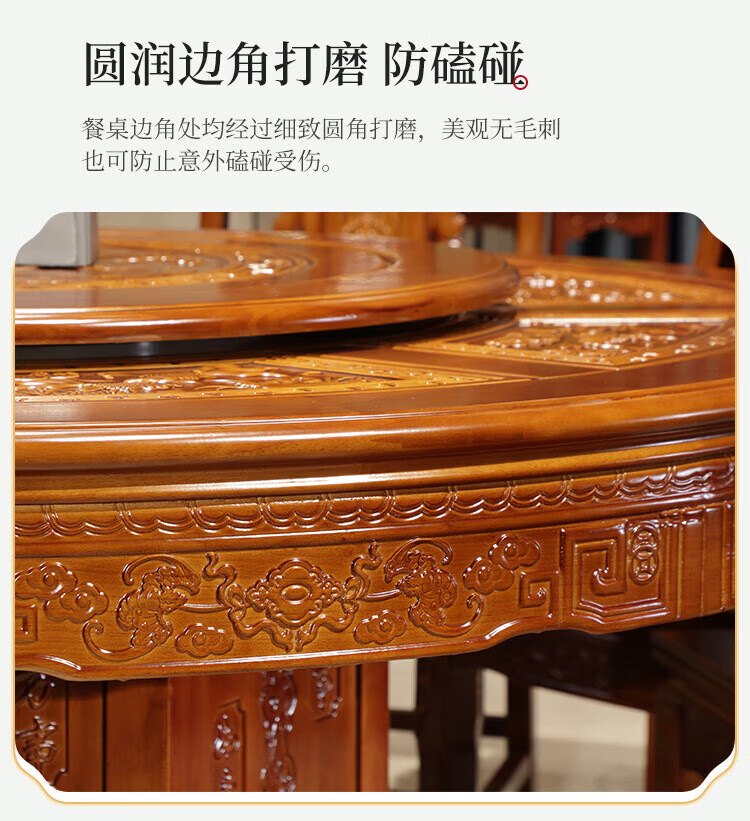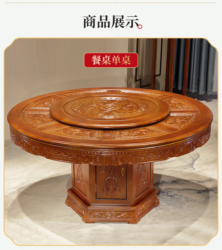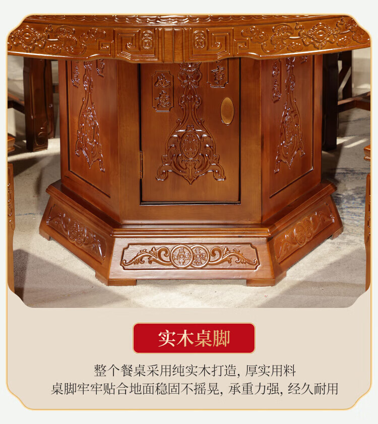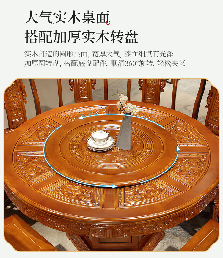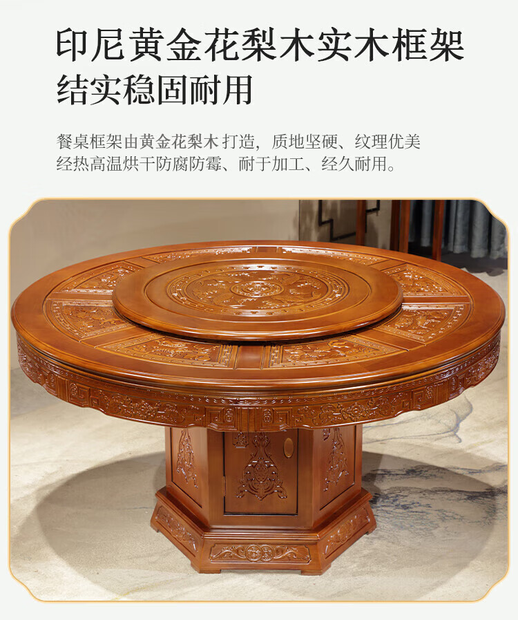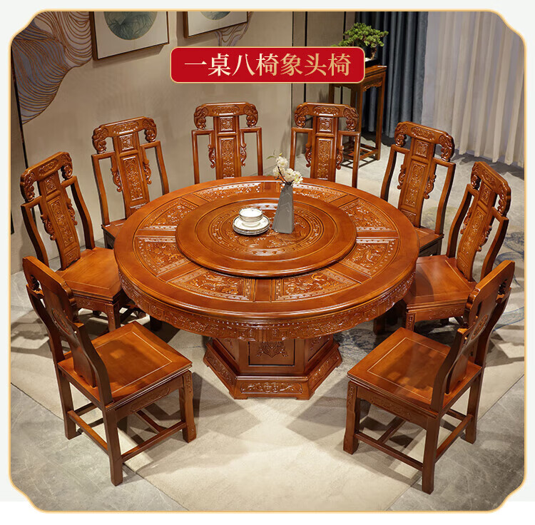 Macron Guangdong Foshan all solid wood dining table antique carved gold rosewood large round table with turntable for 10 people, walnut color, free turntable + tempered glass, 2.0 meters, 1 table + 12 elephant head chairs