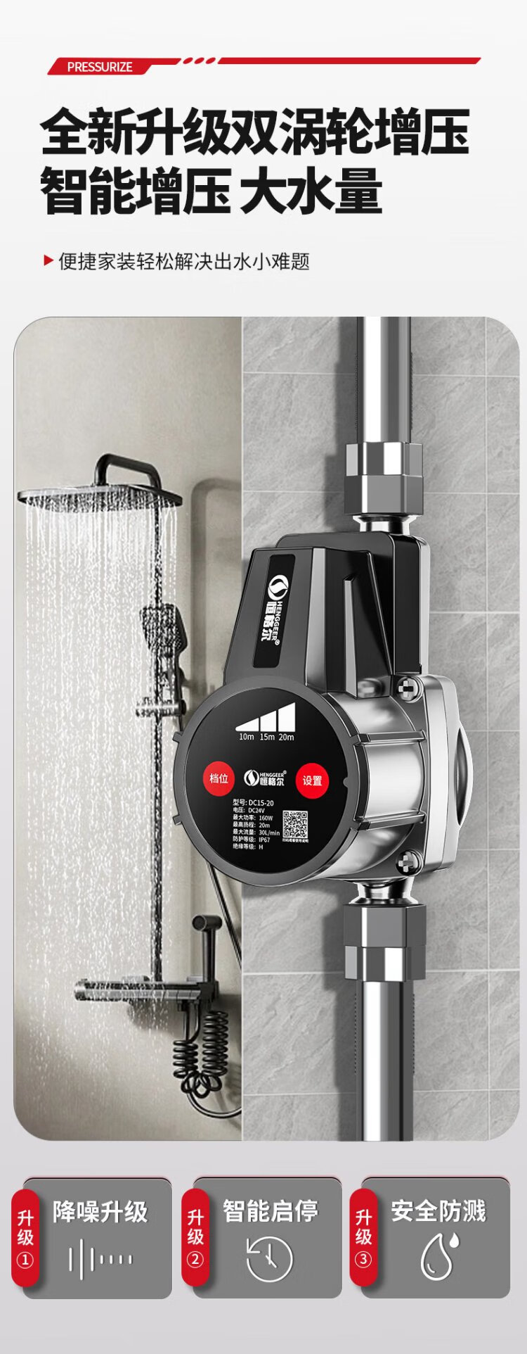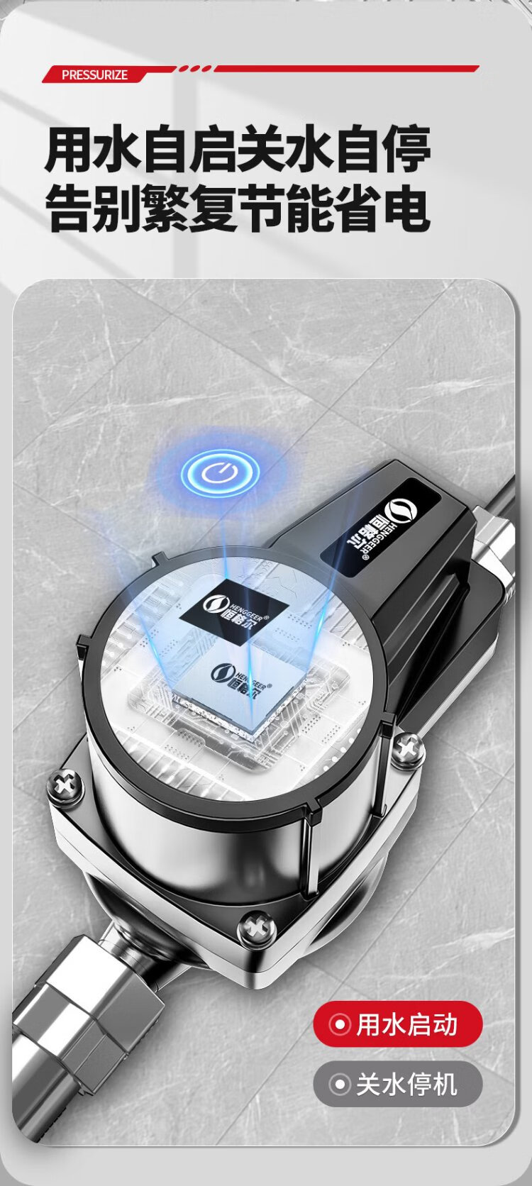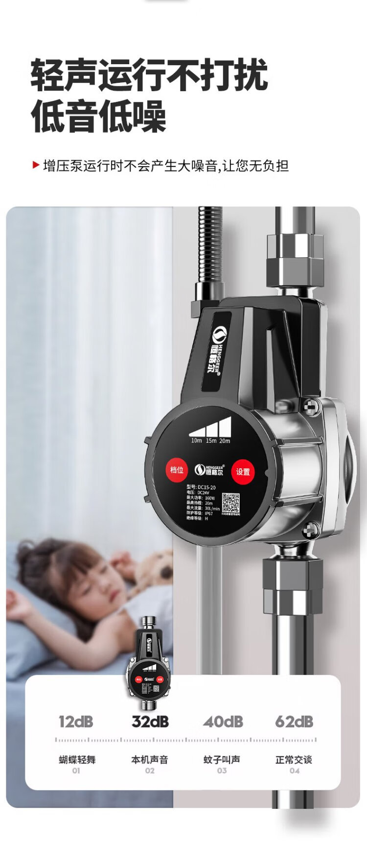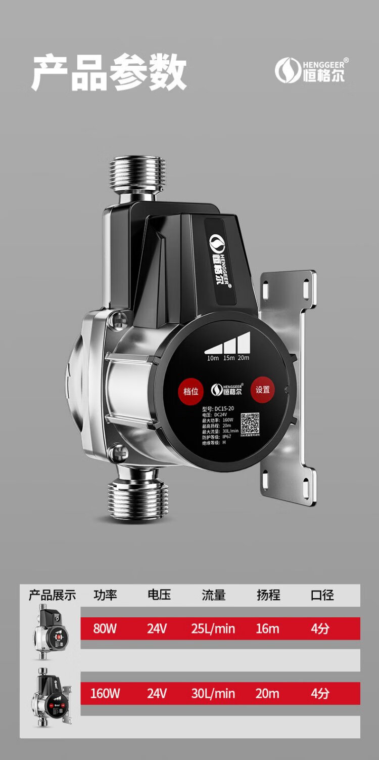 Hengeer booster pump household fully automatic light sound 24V permanent magnet variable frequency booster pump water heater household tap water booster pump 160W permanent magnet variable frequency three-speed adjustment