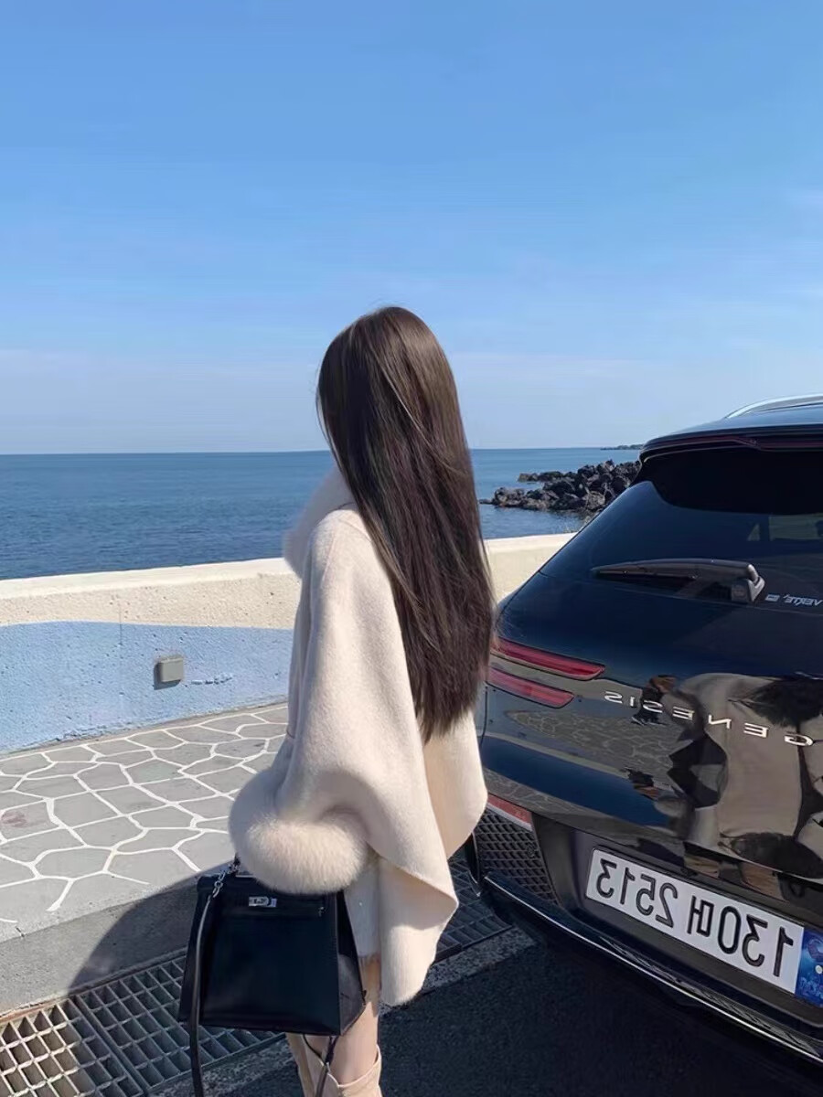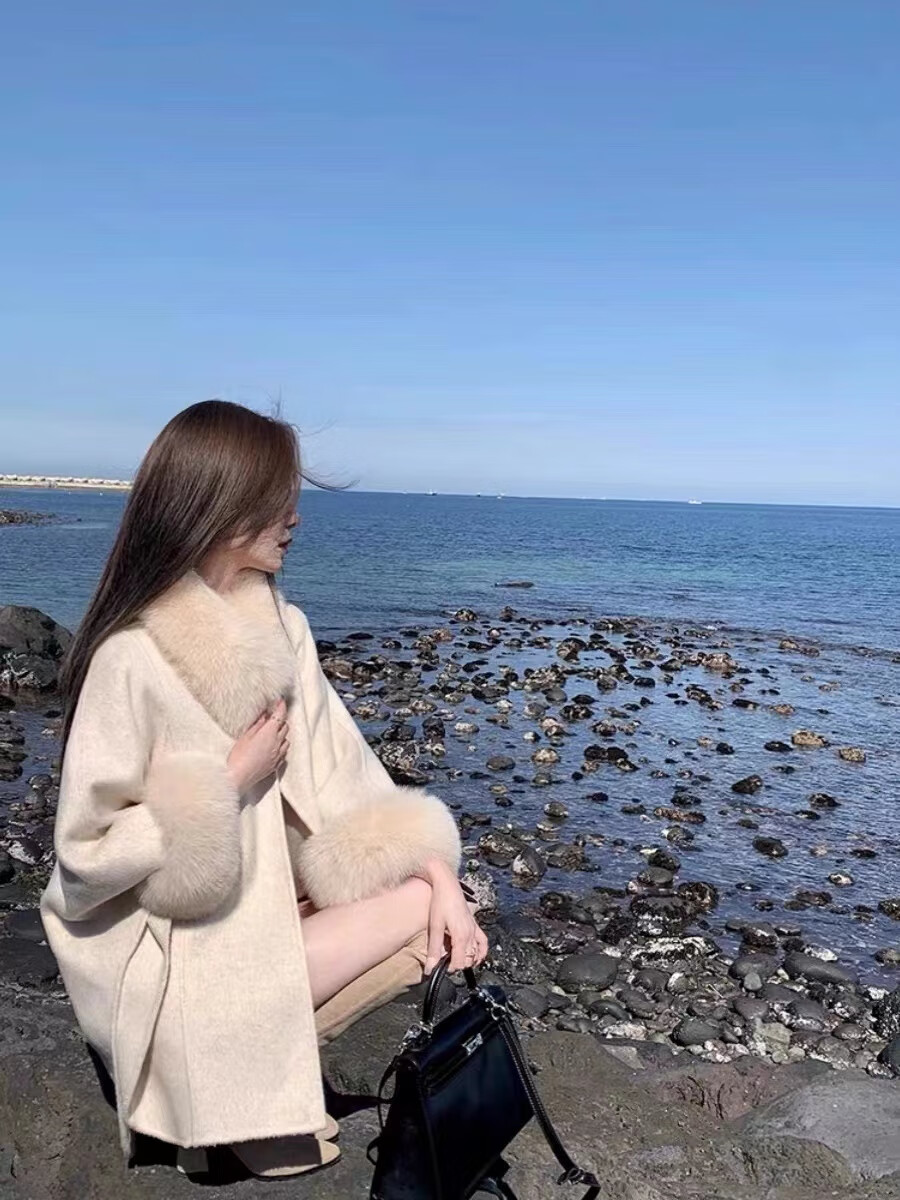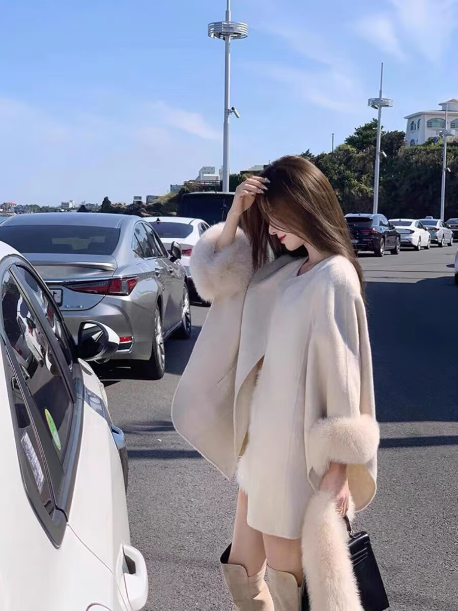 Pierre Cardin white woolen cloak fur coat for women 2025 autumn and winter new temperament lady belt mid-length thick coat for women off-white temperament lady S