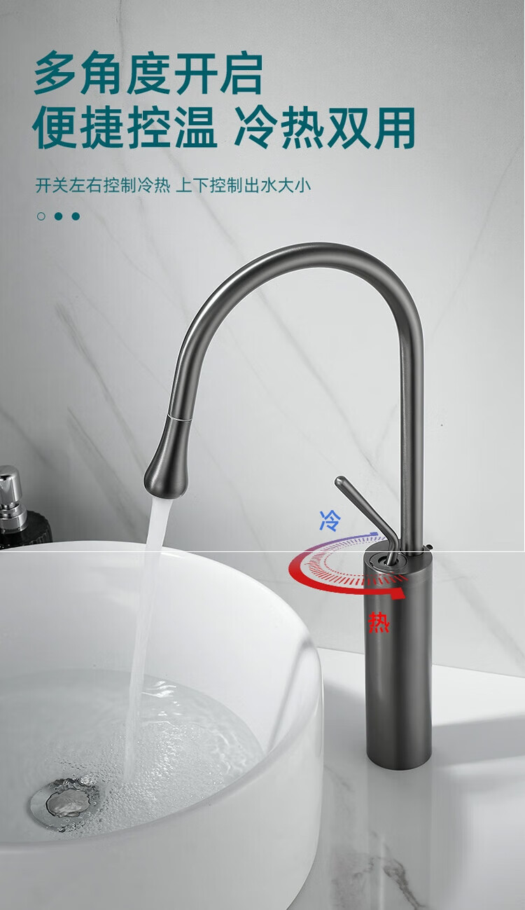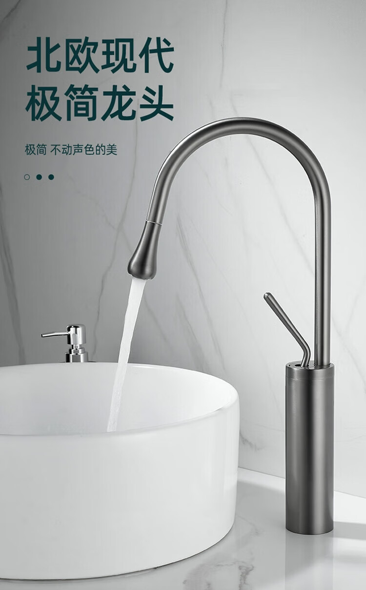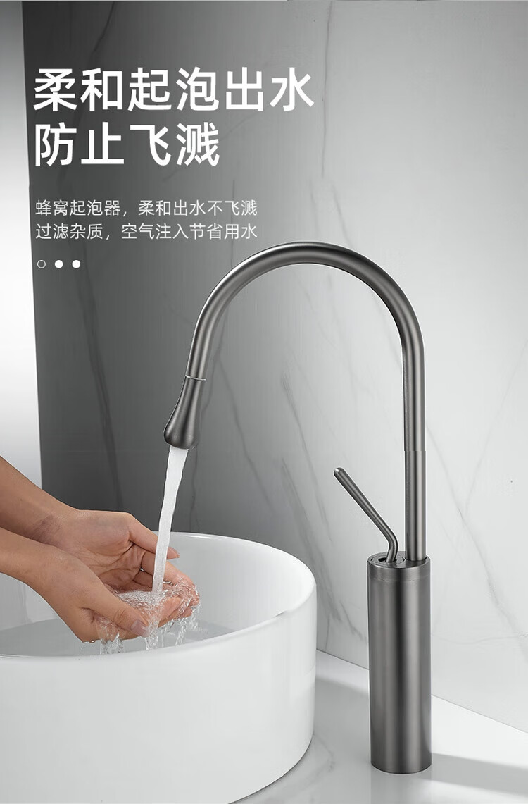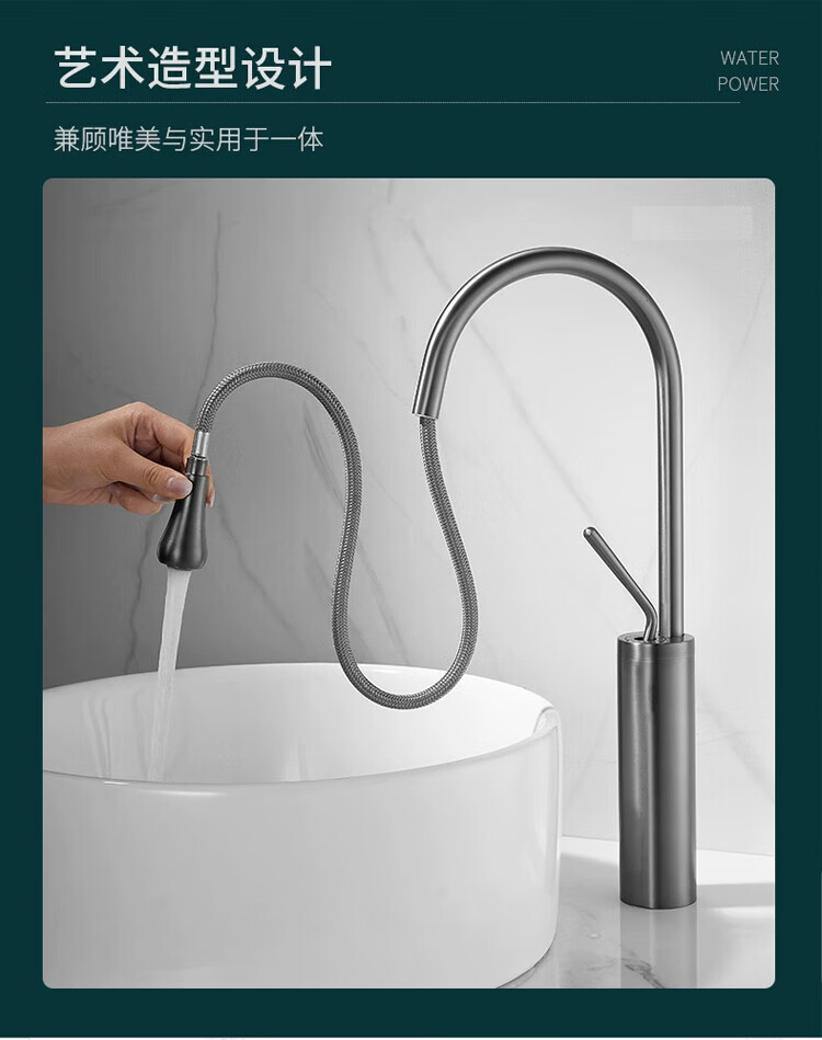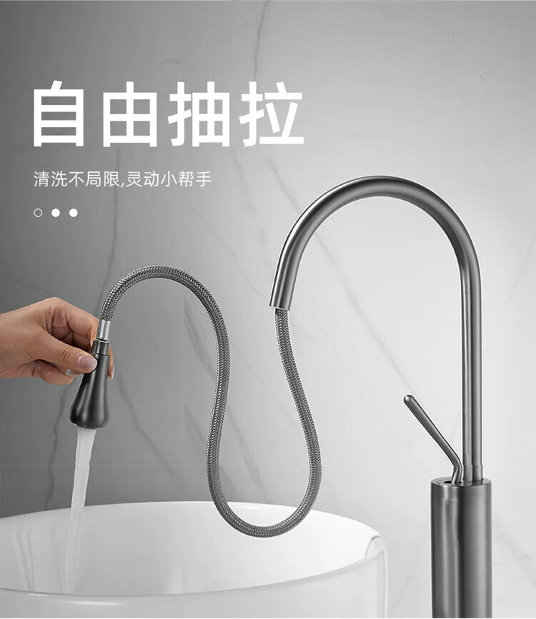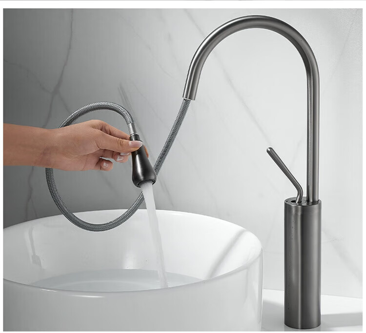 Qian Dushan gun gray pull-out faucet countertop basin heightened bathroom wash basin full copper telescopic rotating faucet hot and cold S silver medium style