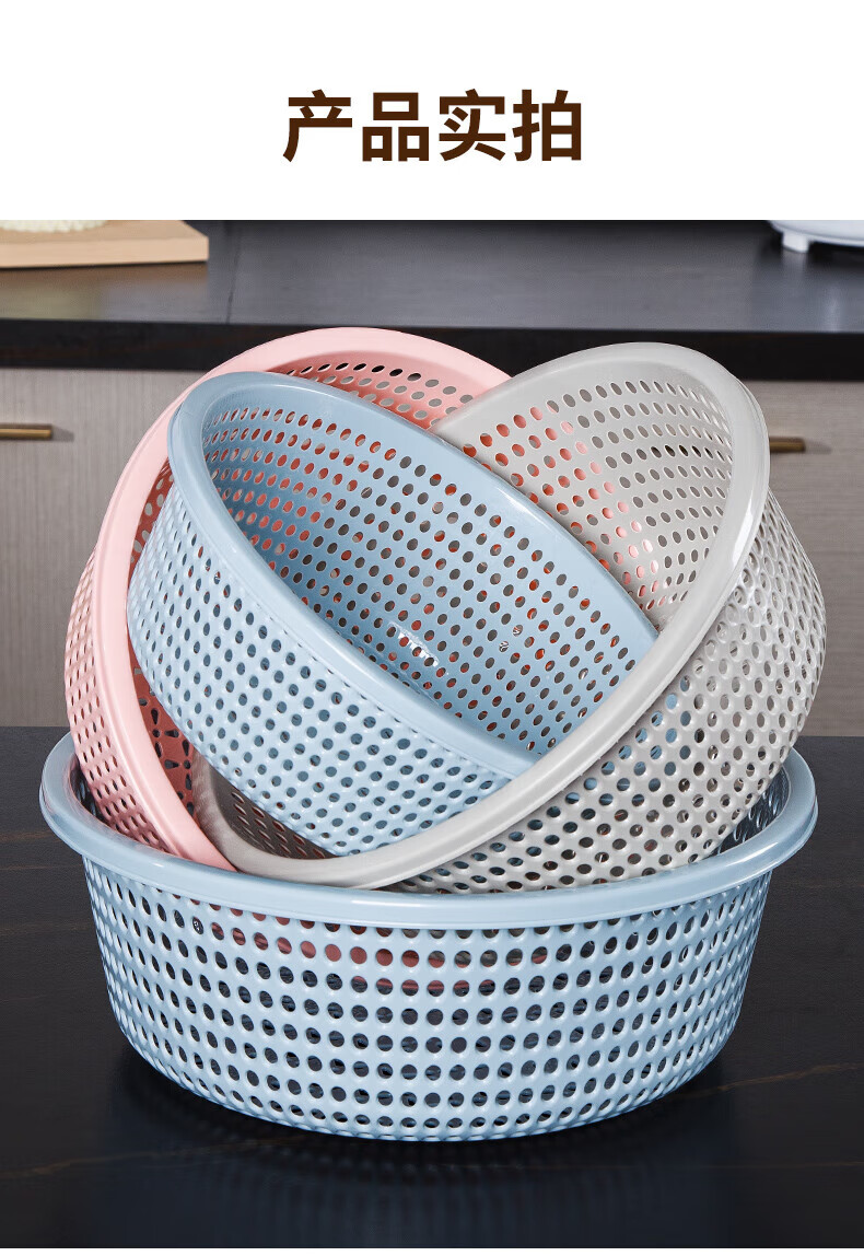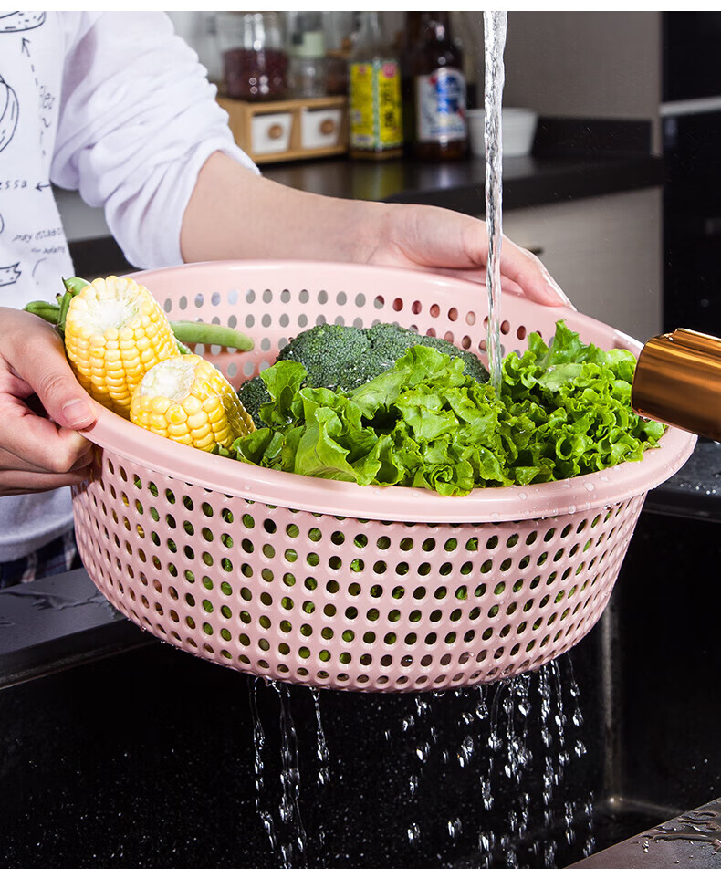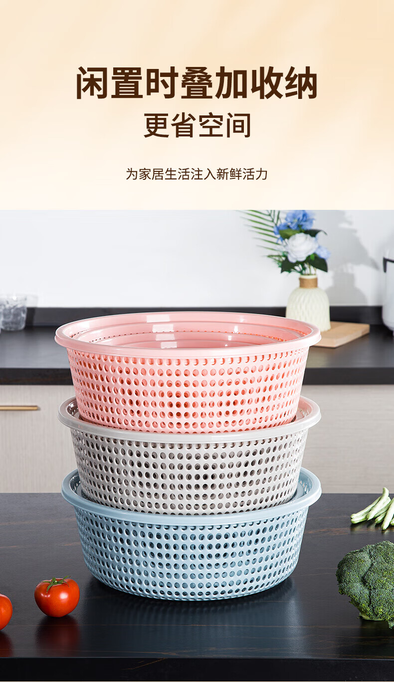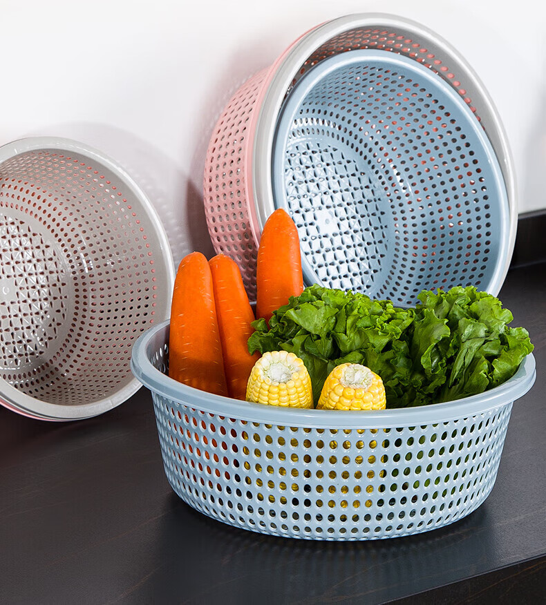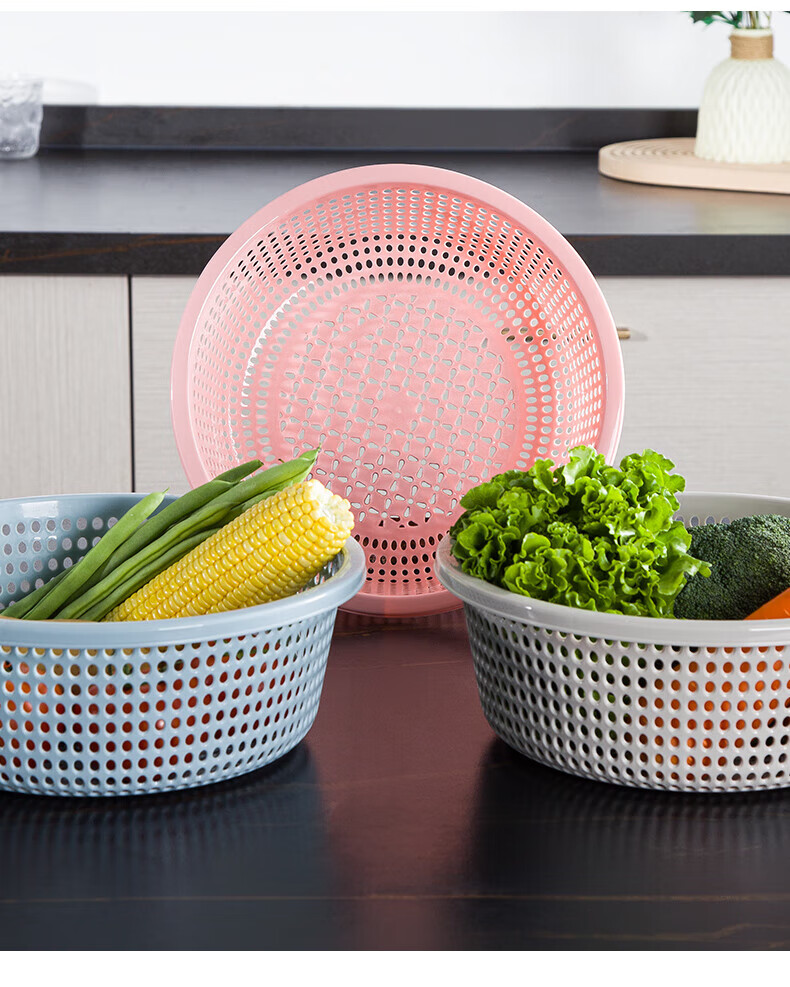 Tanqi kitchen drain basket plastic fruit washing sieve vegetable sieve household vegetable basin extra thick round hollow vegetable basket three-piece set pastoral powder large single (41cm)